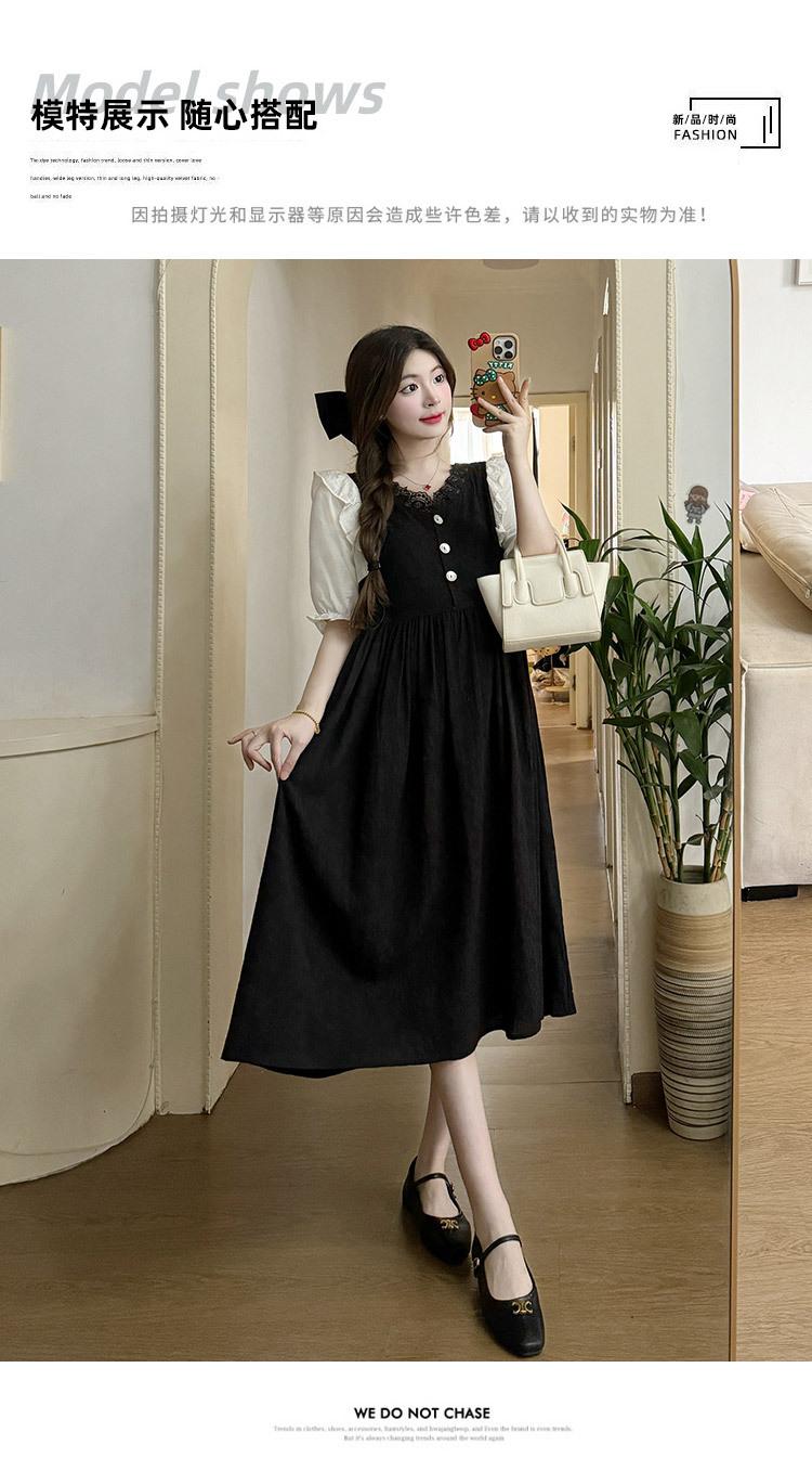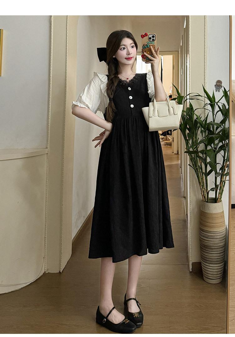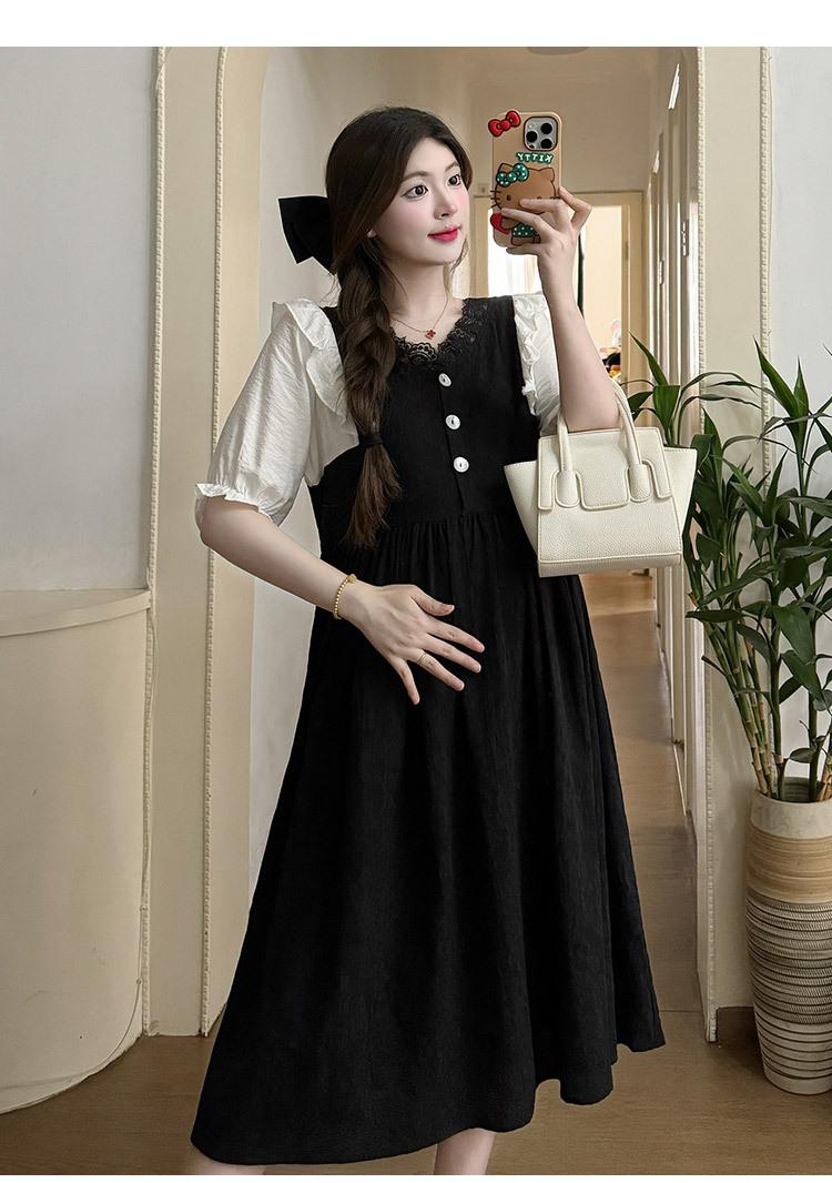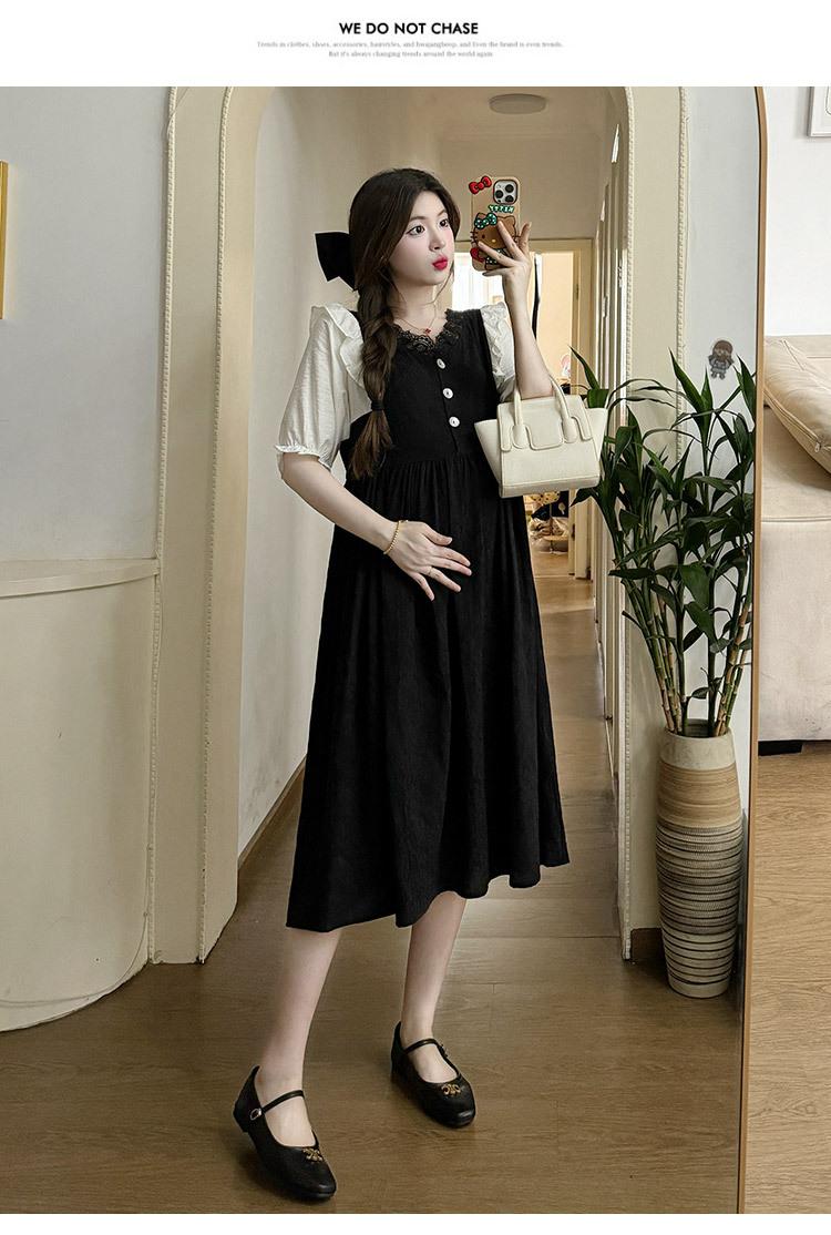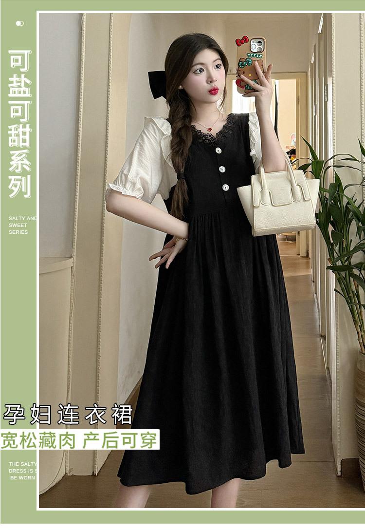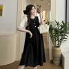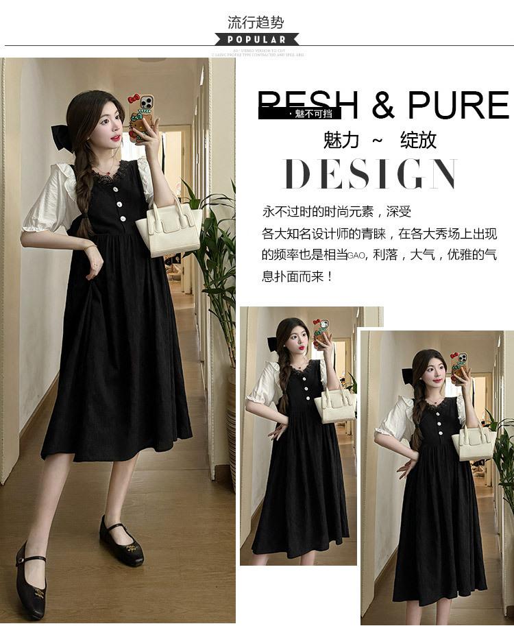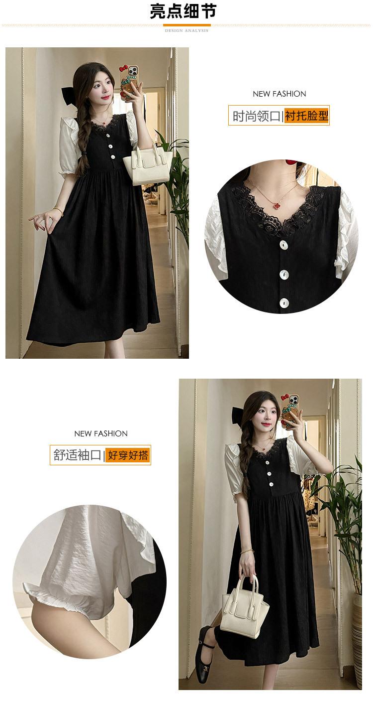 Vestido de Verano de Maternidad 2025 Nuevo Retro Francés Patchwork Vestido de Color en Contraste de Textura Oscura