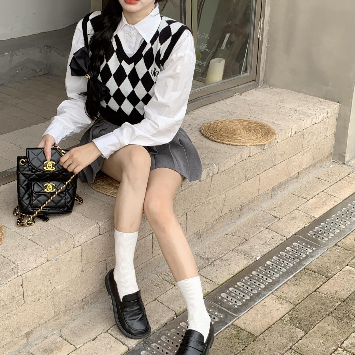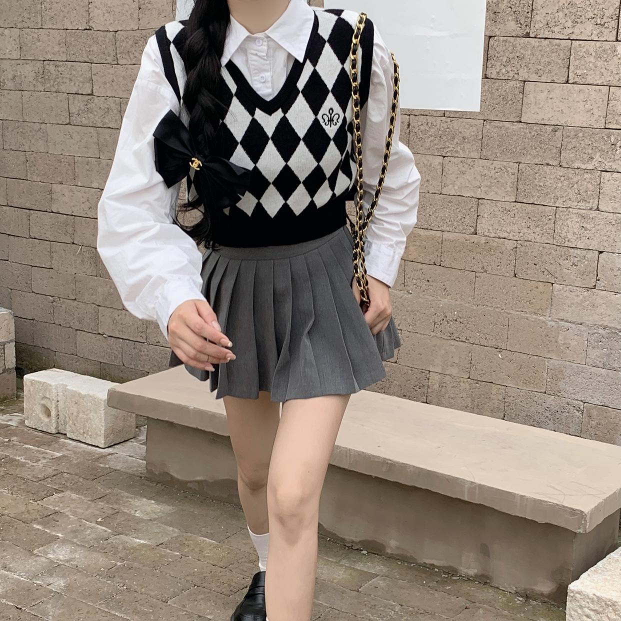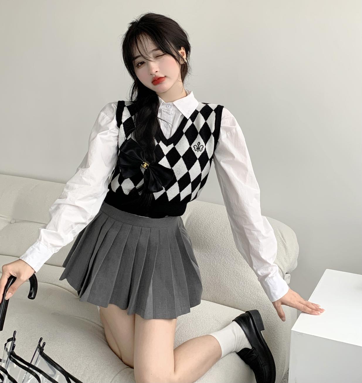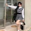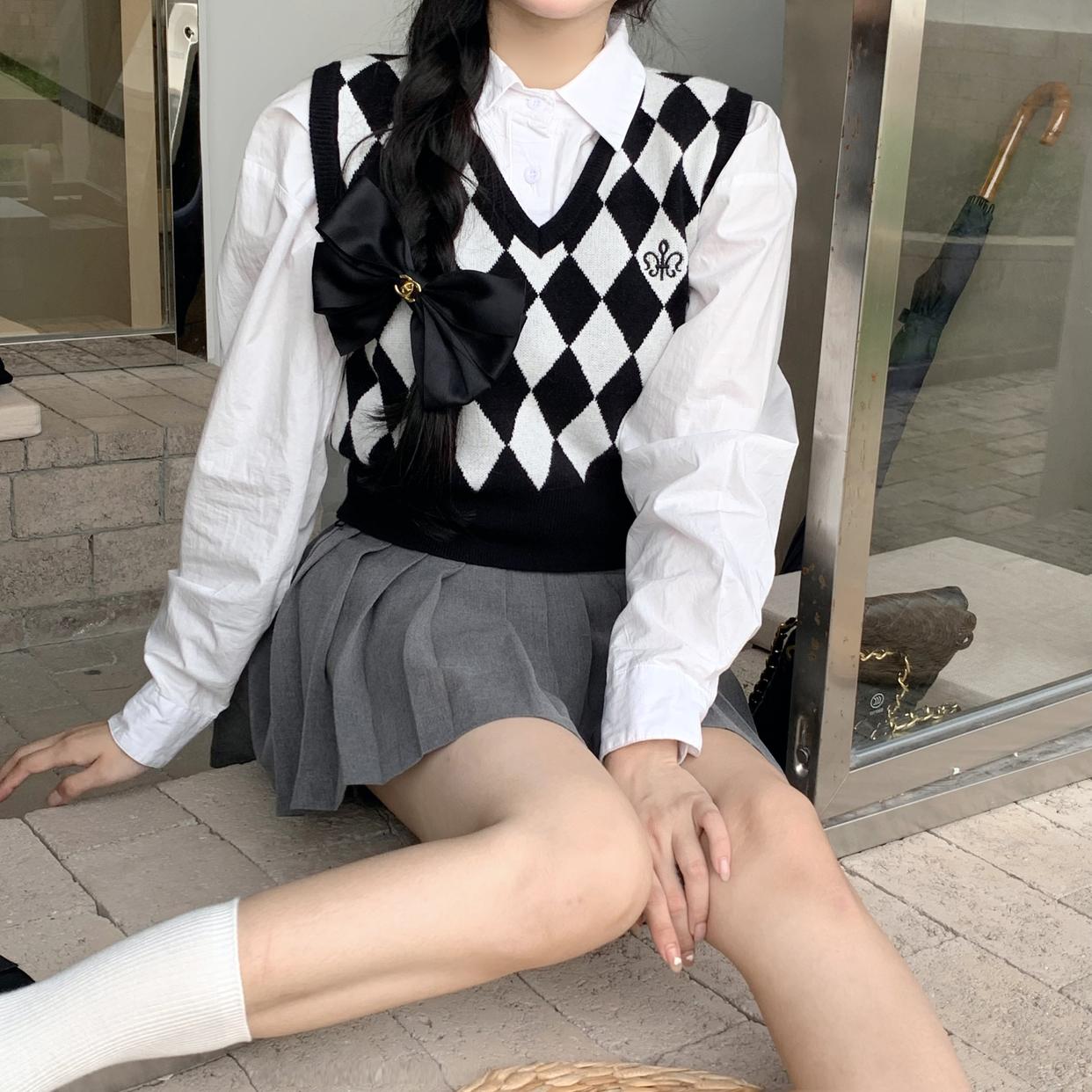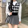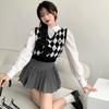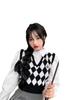 Chaleco de punto romboidal blanco y negro de manga larga estilo universitario, diseño de camisa apilada, suéter corto Sense para mujer