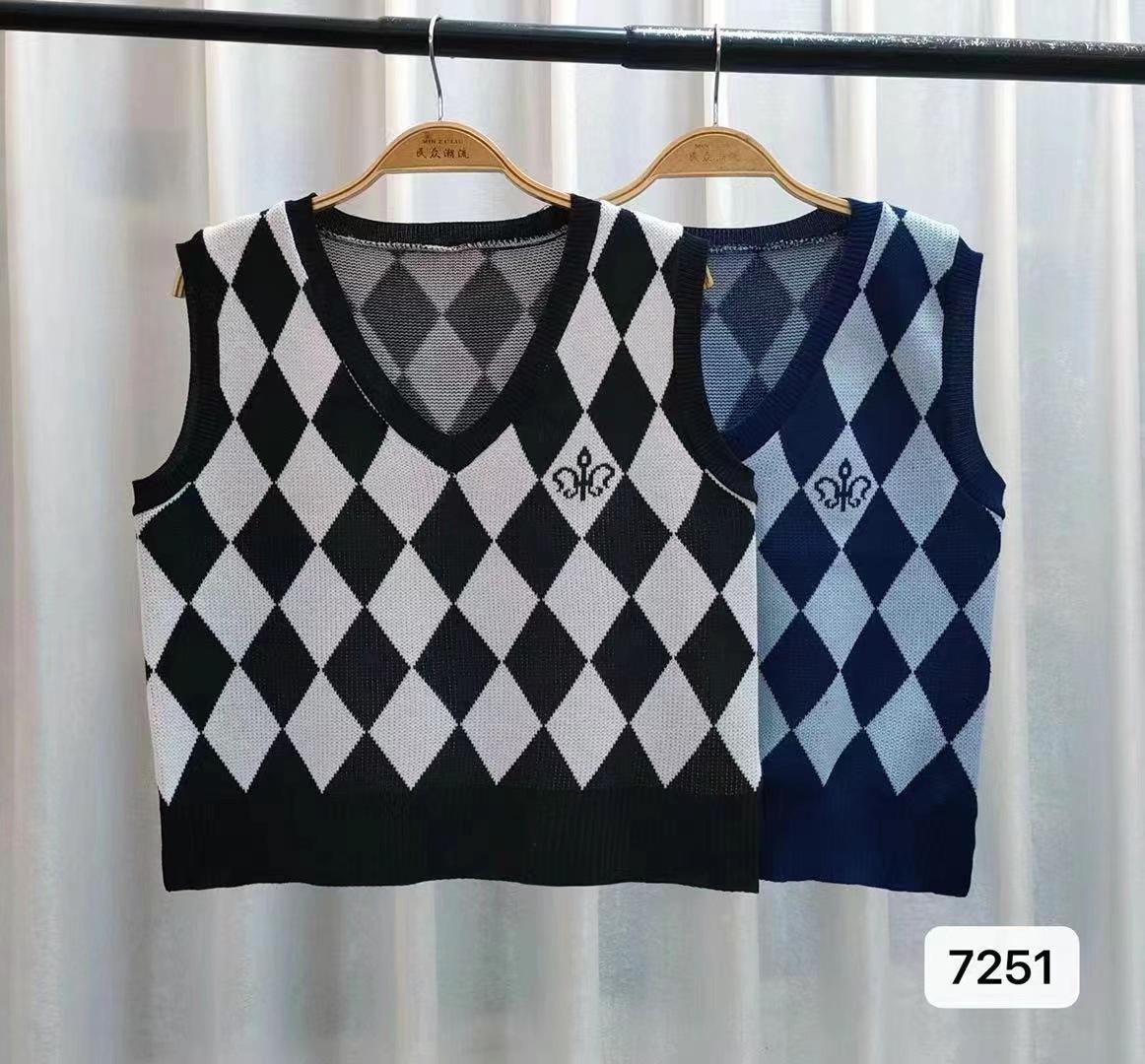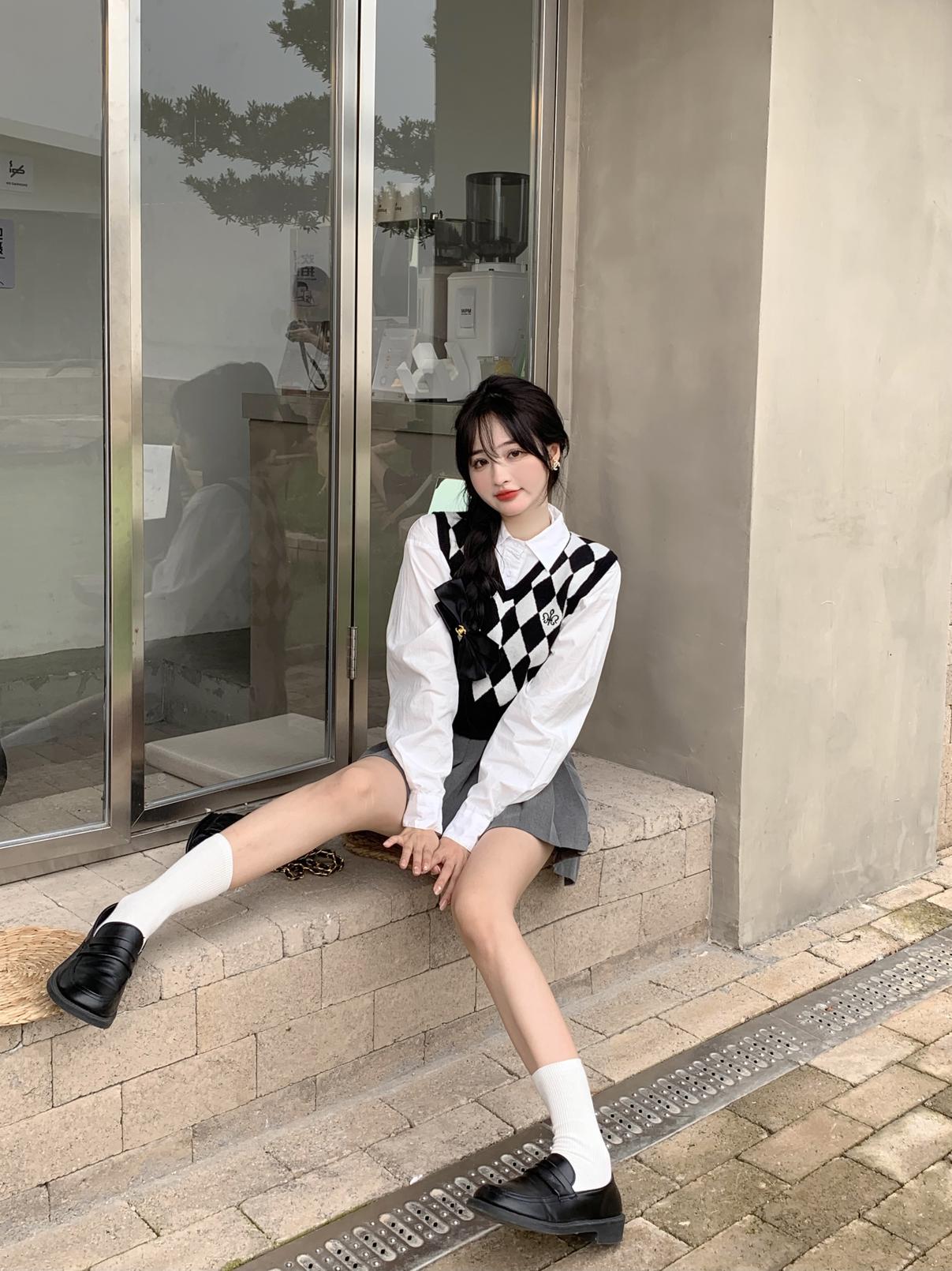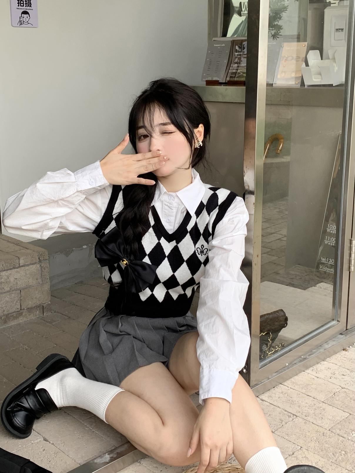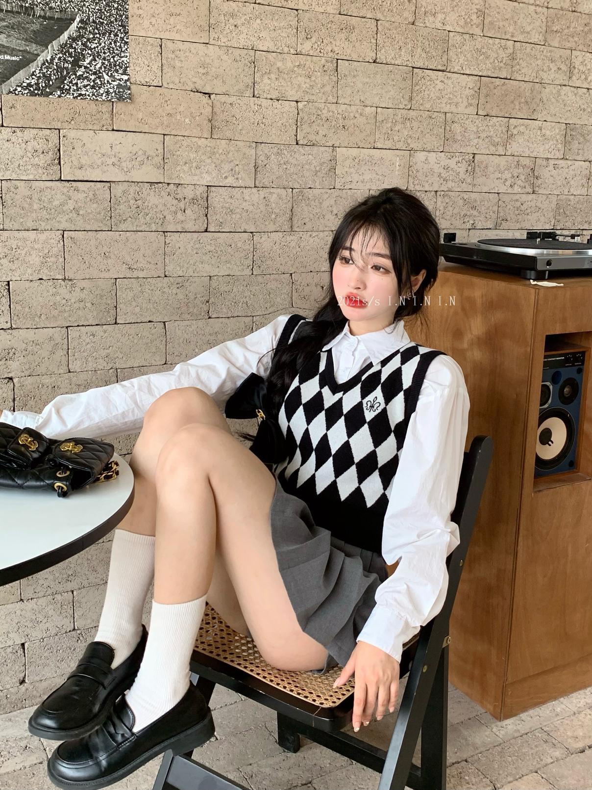 Chaleco de punto romboidal blanco y negro de manga larga estilo universitario, diseño de camisa apilada, suéter corto Sense para mujer
