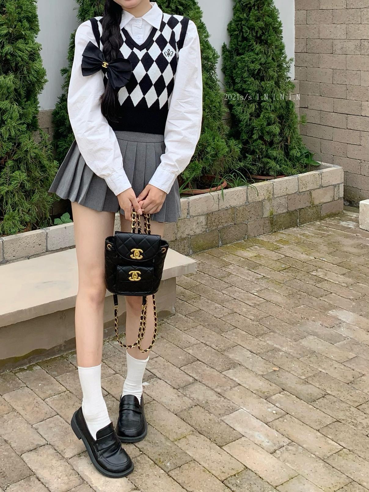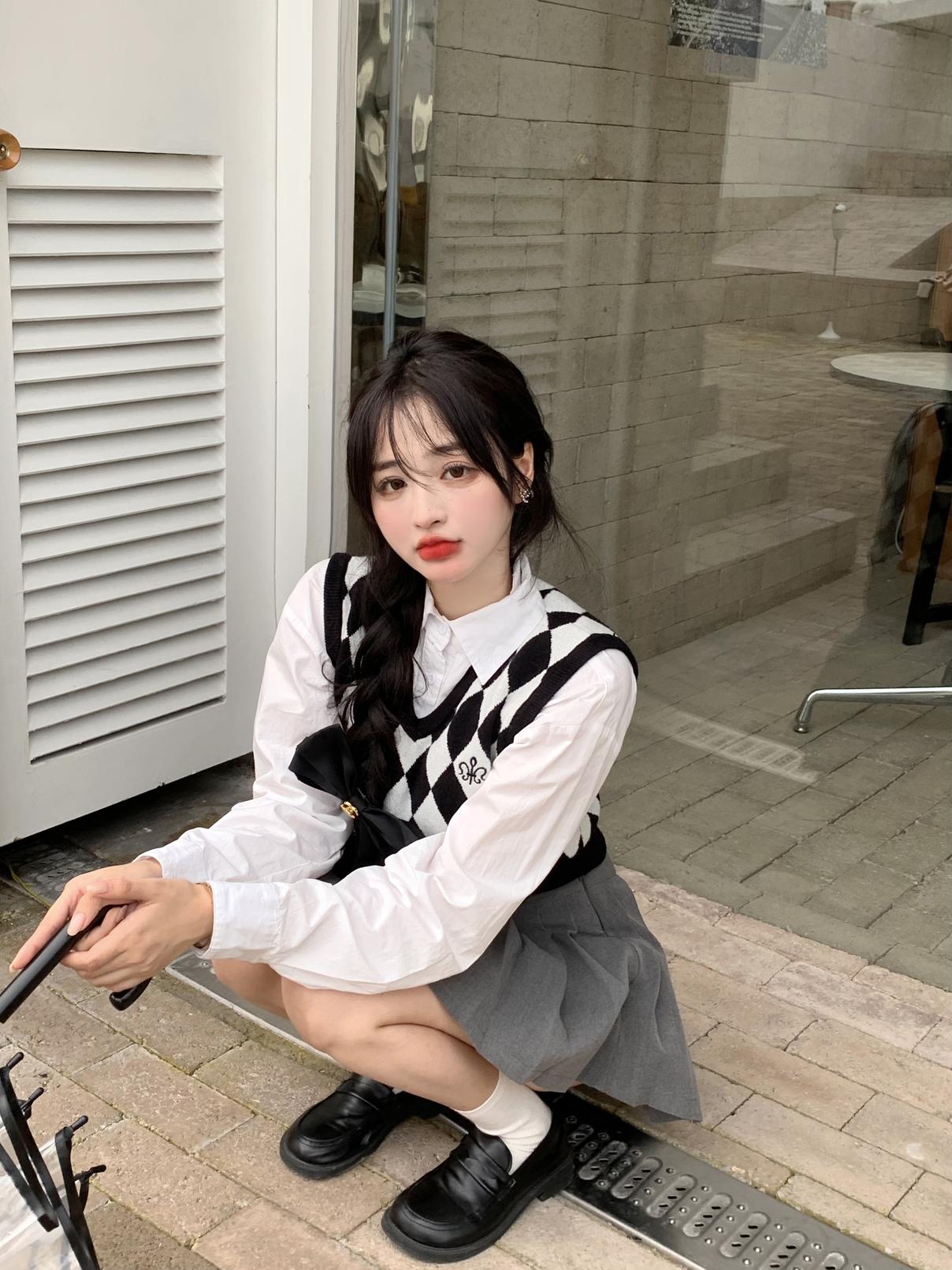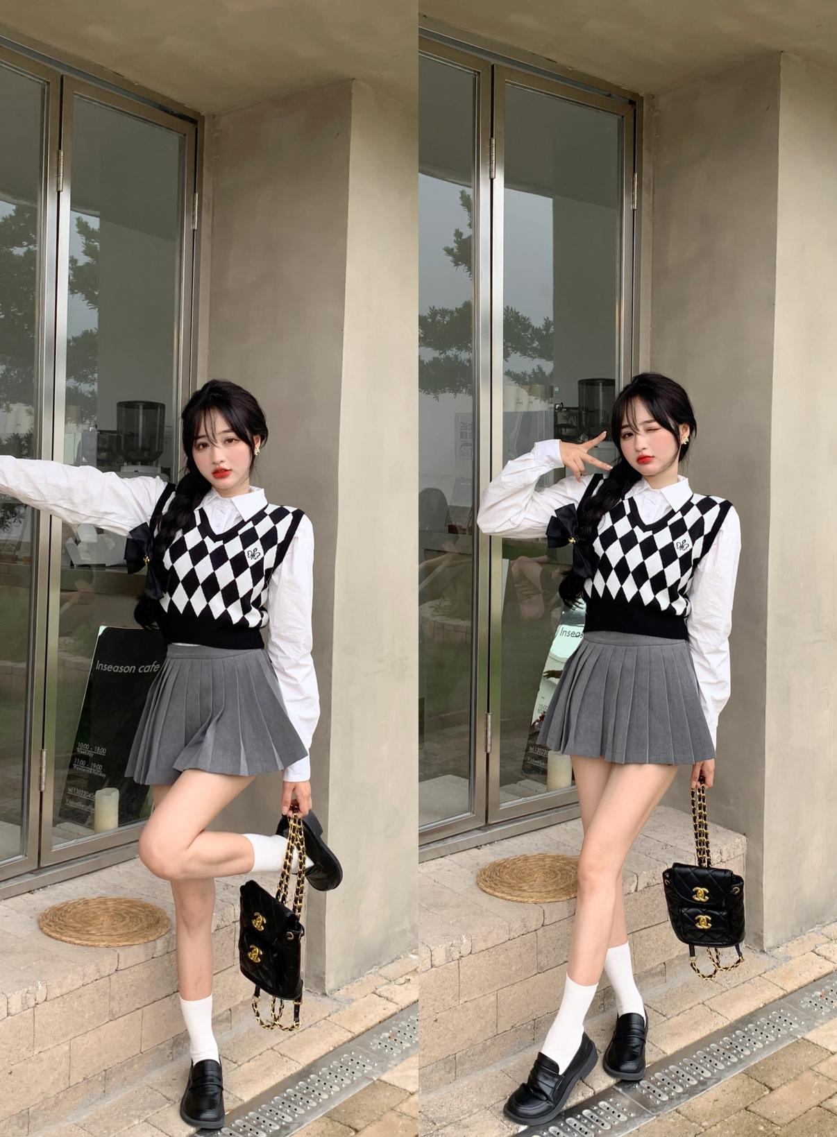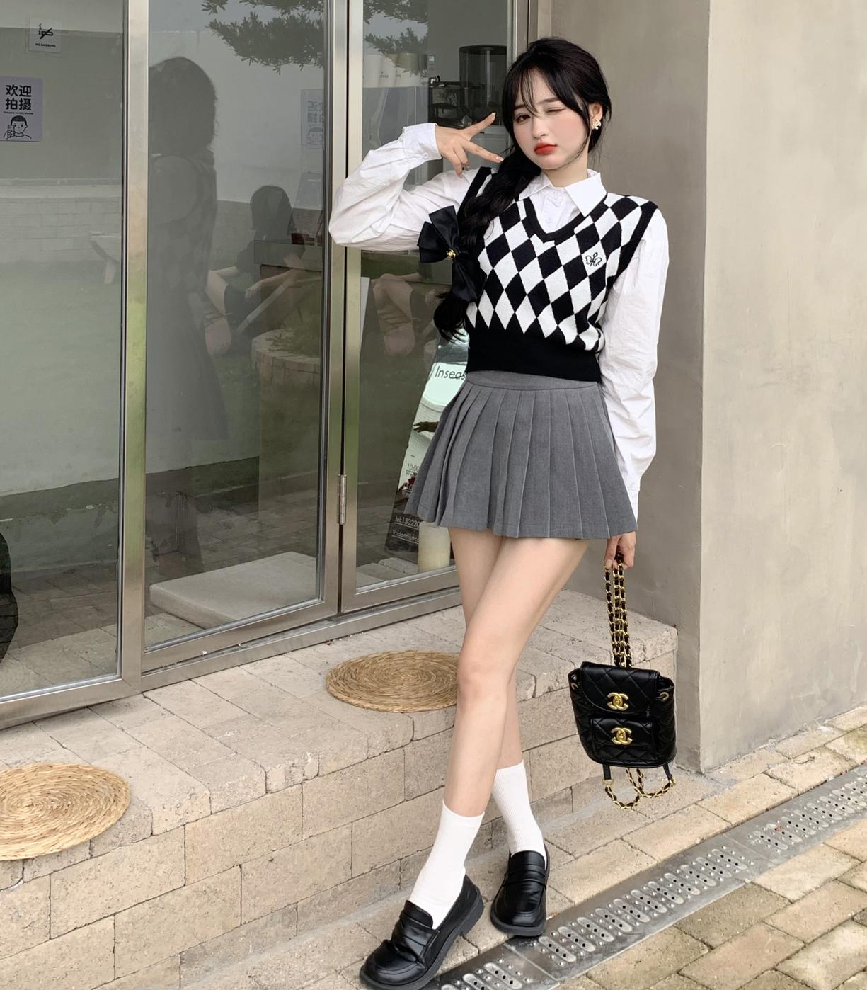 Chaleco de punto romboidal blanco y negro de manga larga estilo universitario, diseño de camisa apilada, suéter corto Sense para mujer