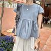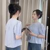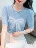 Suéter de verano 2024 con cuello redondo y manga corta, estilo dulce, informal, cómodo, de seda helada, con mangas abullonadas de jacquard para mujer