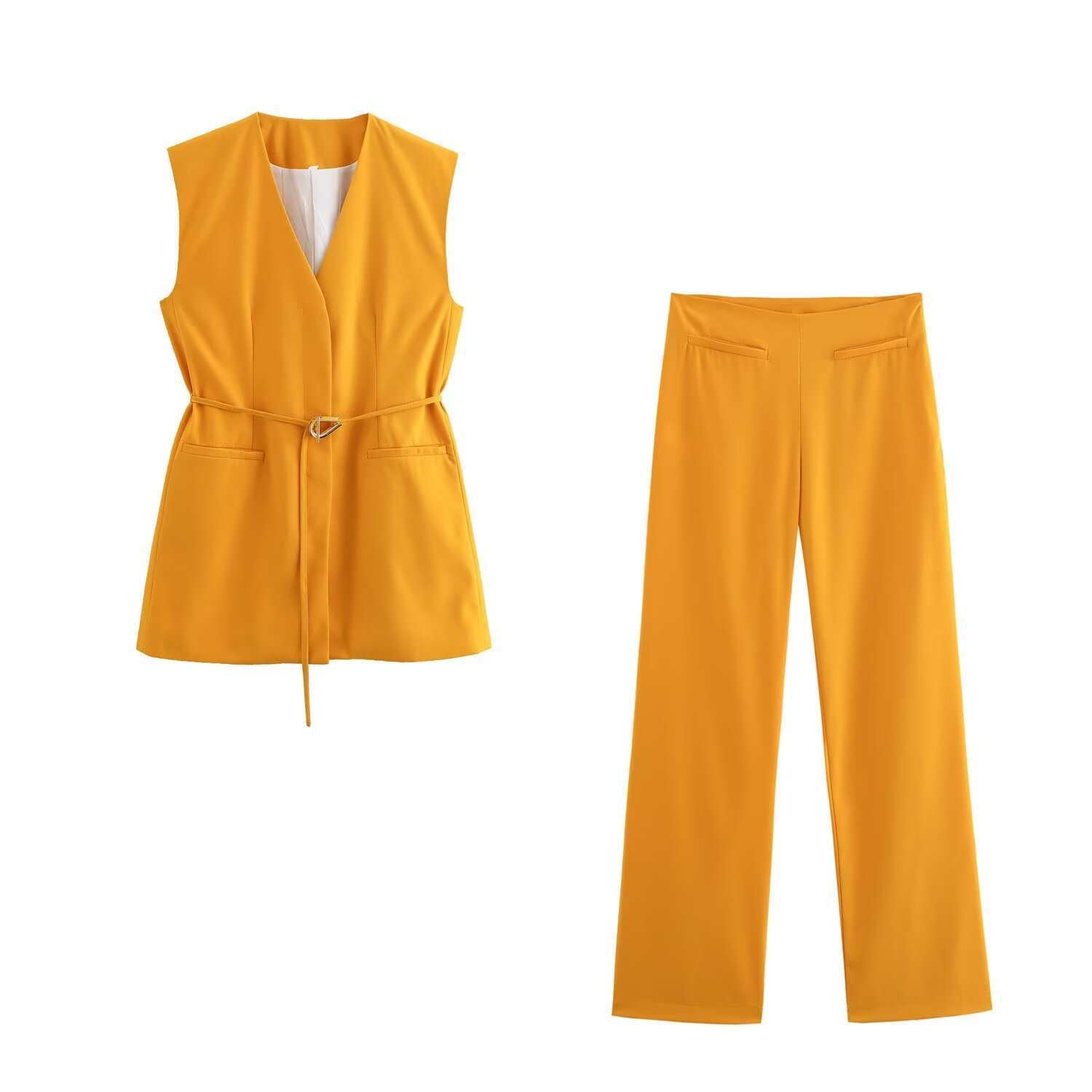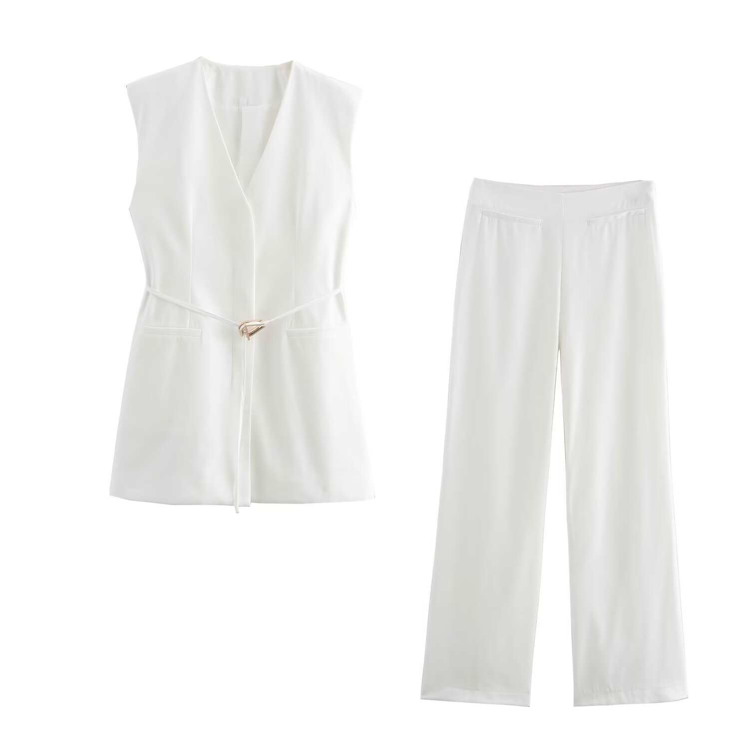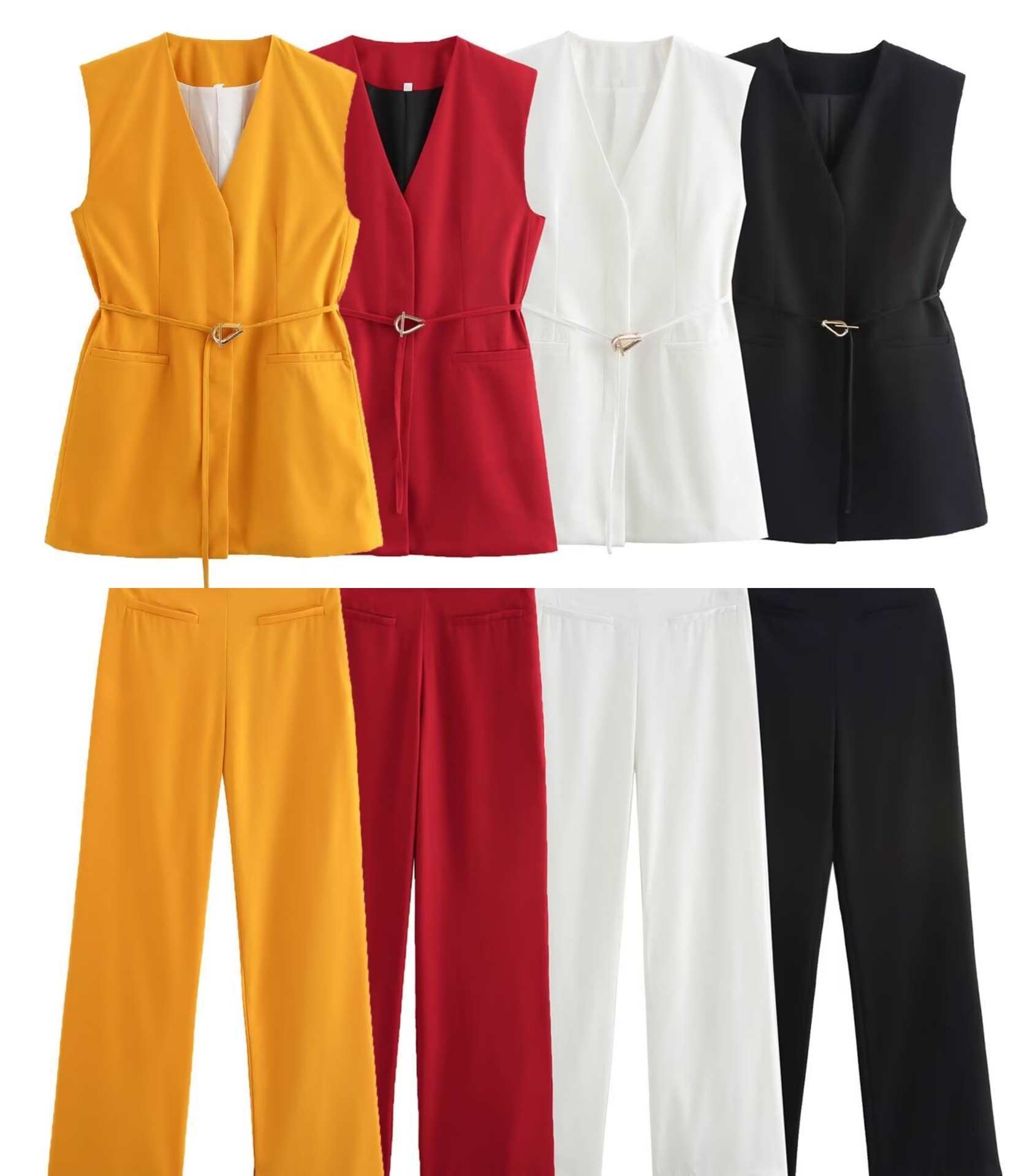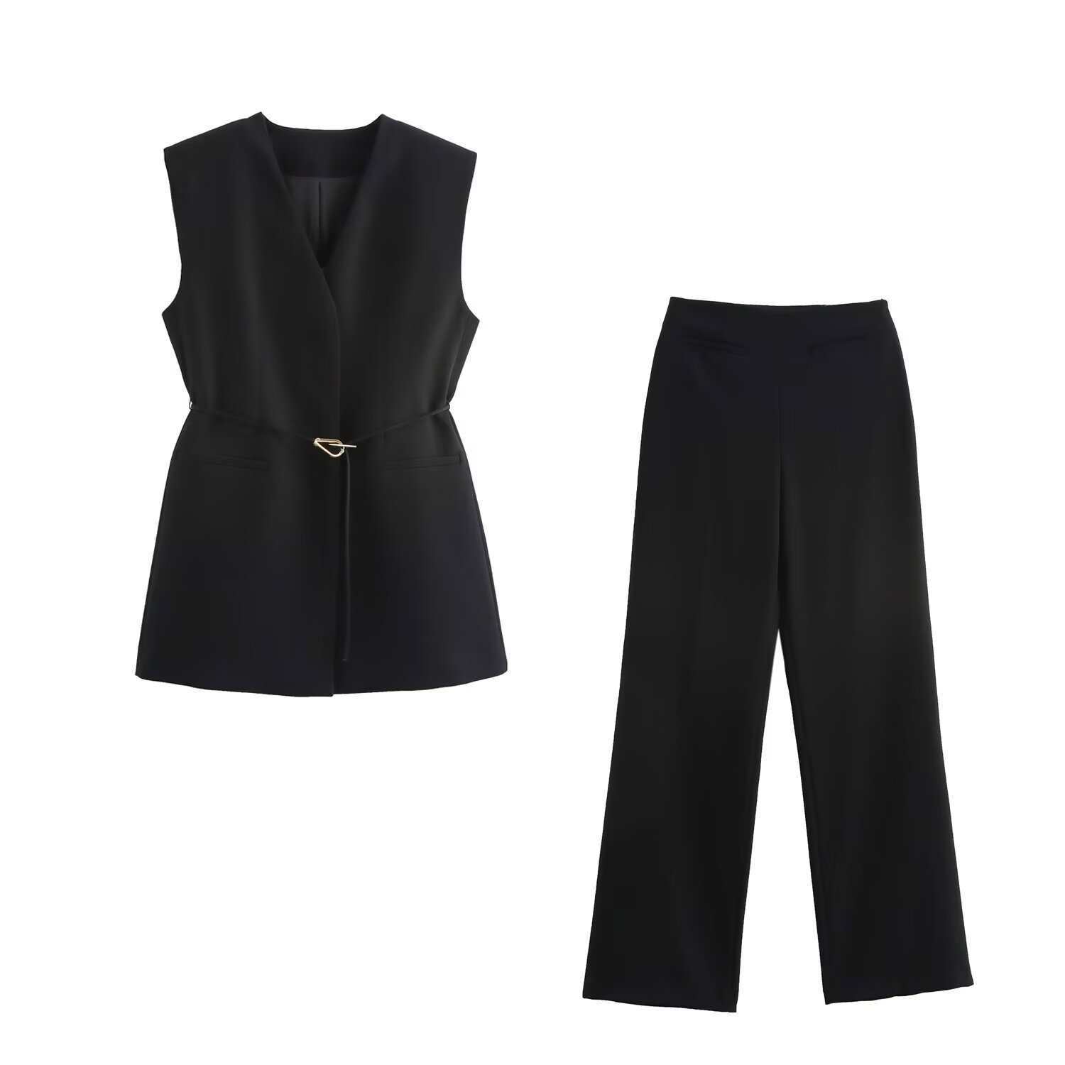 Chaleco de Bolsillo Estilo Europeo y Americano Pantalones Acampanados Cinturón Nuevo Abertura Diseño Ropa de Mujer Comercio Exterior