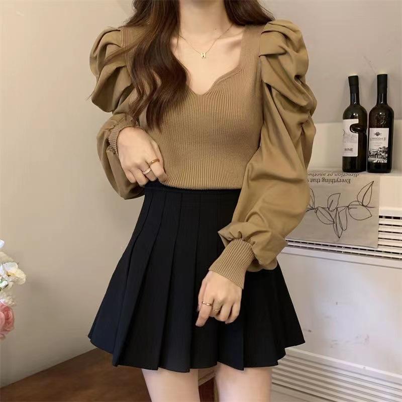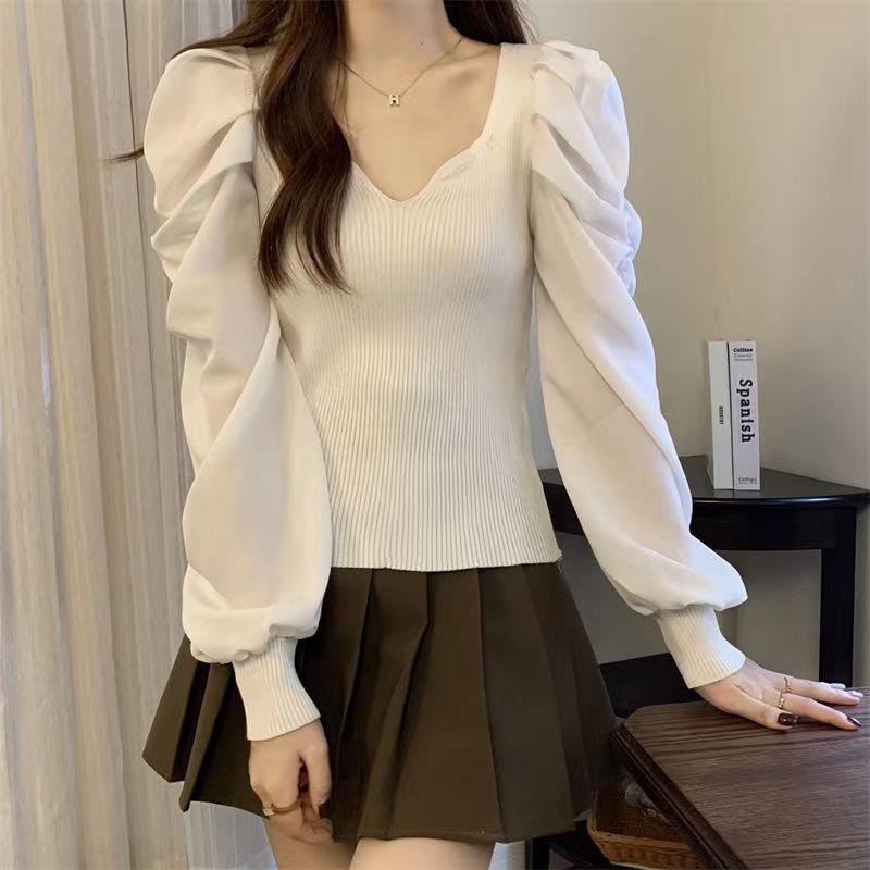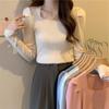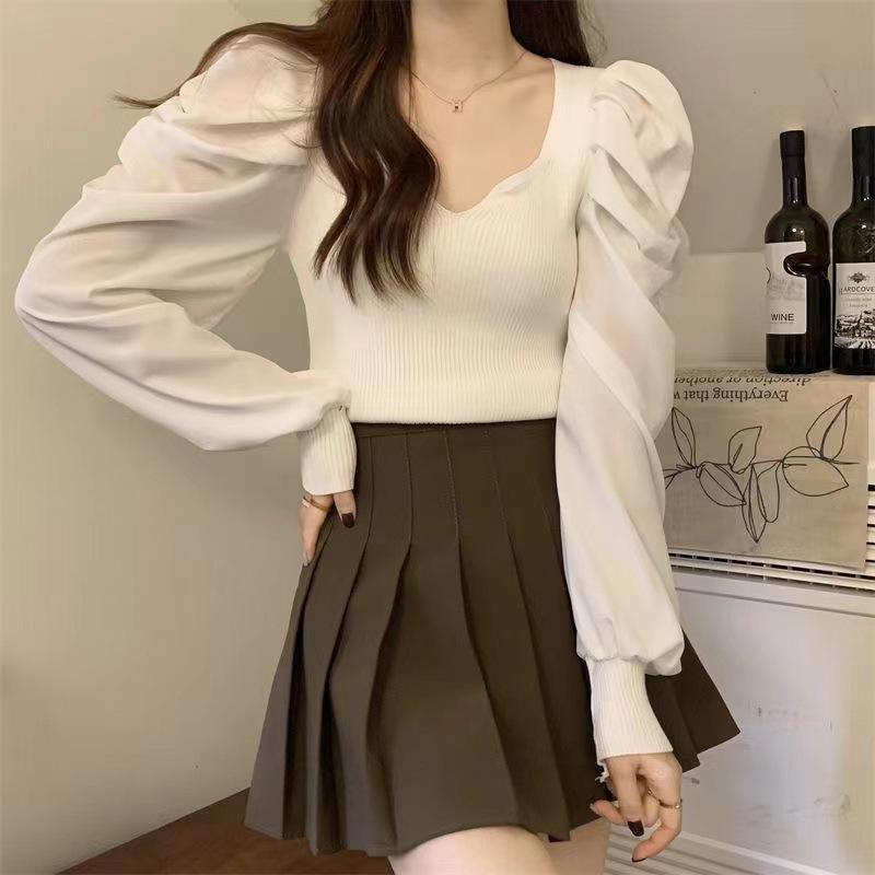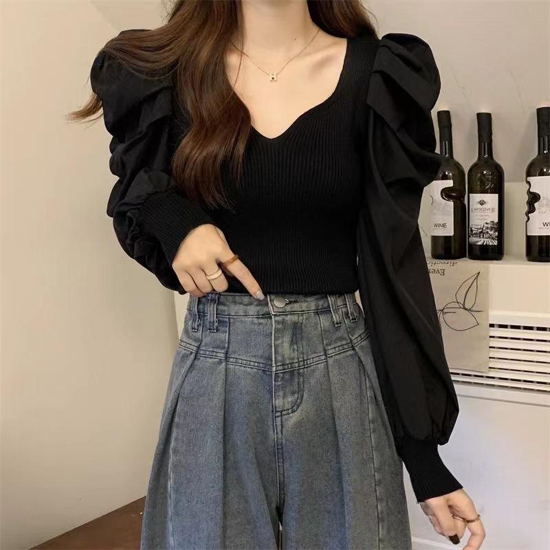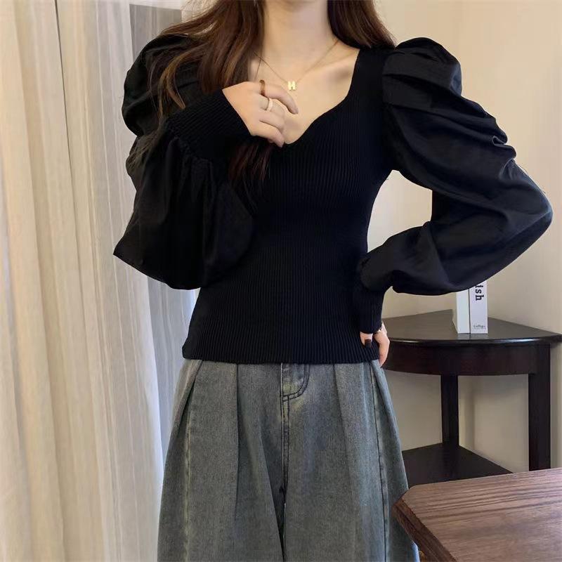 Suéter elegante de diseño francés con cuello cuadrado y manga larga para mujer, suéter de primavera ajustado con mangas abullonadas, blusa de fondo