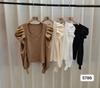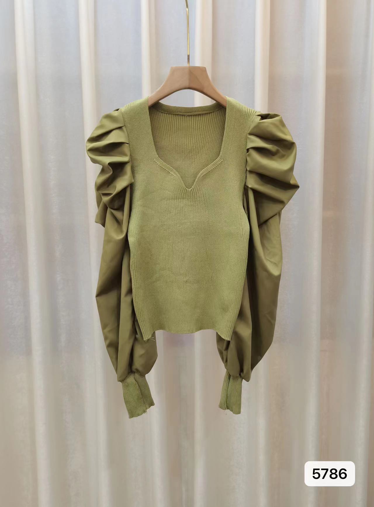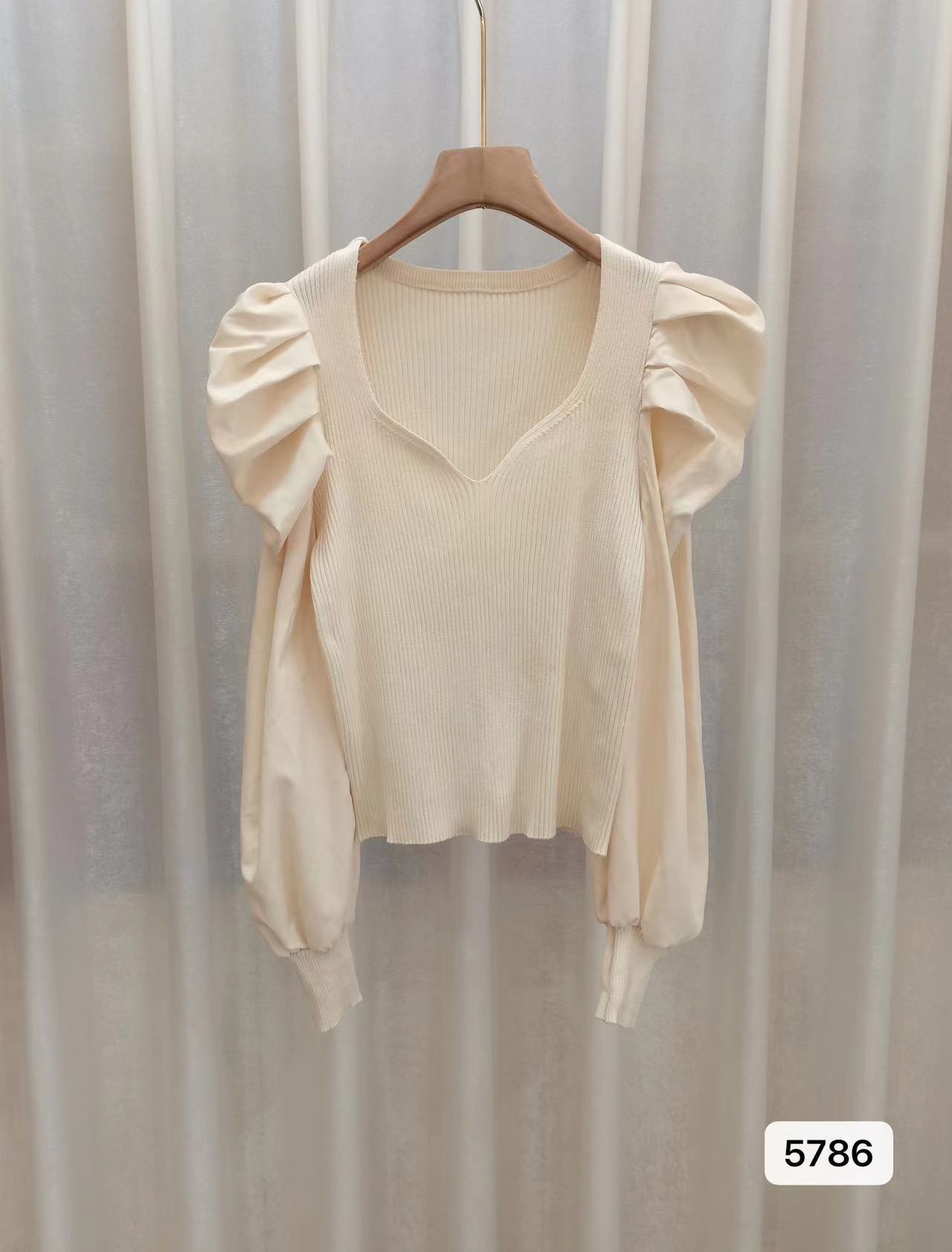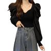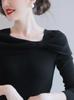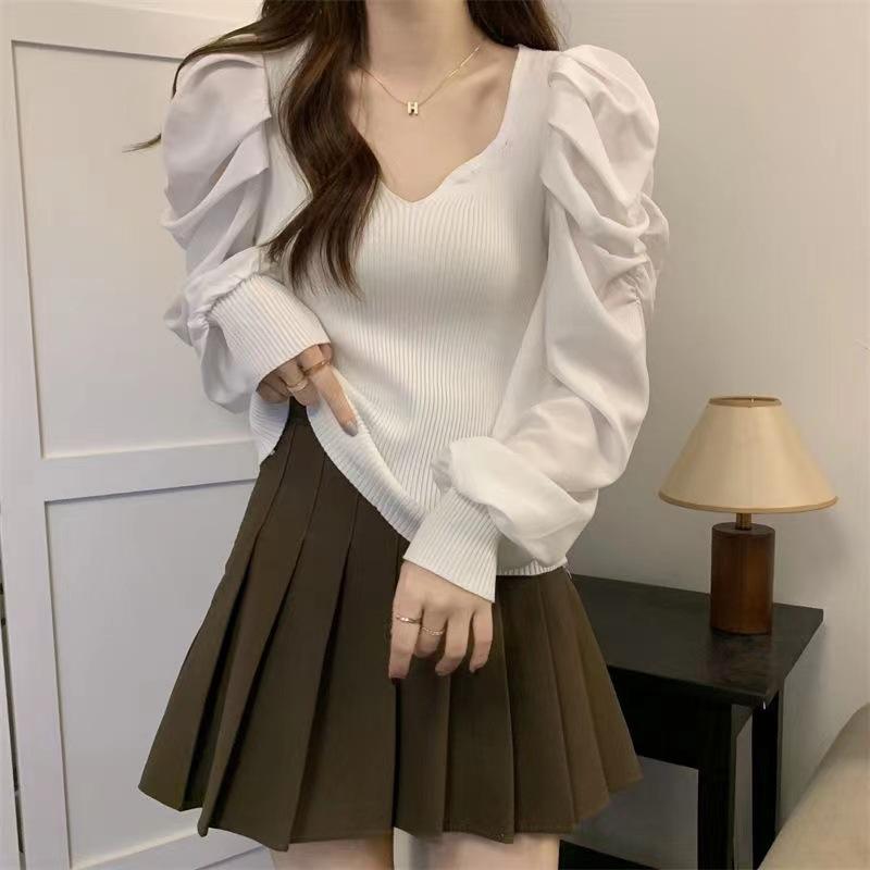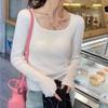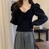 Suéter elegante de diseño francés con cuello cuadrado y manga larga para mujer, suéter de primavera ajustado con mangas abullonadas, blusa de fondo