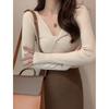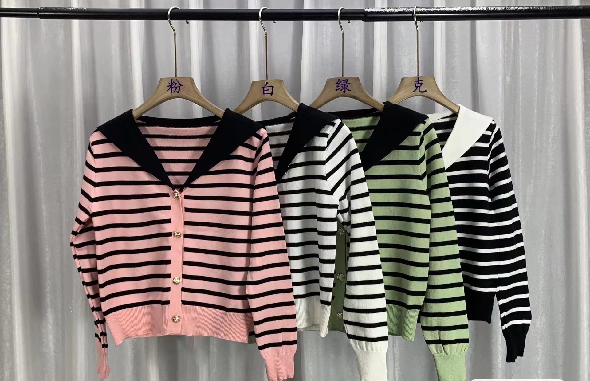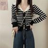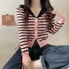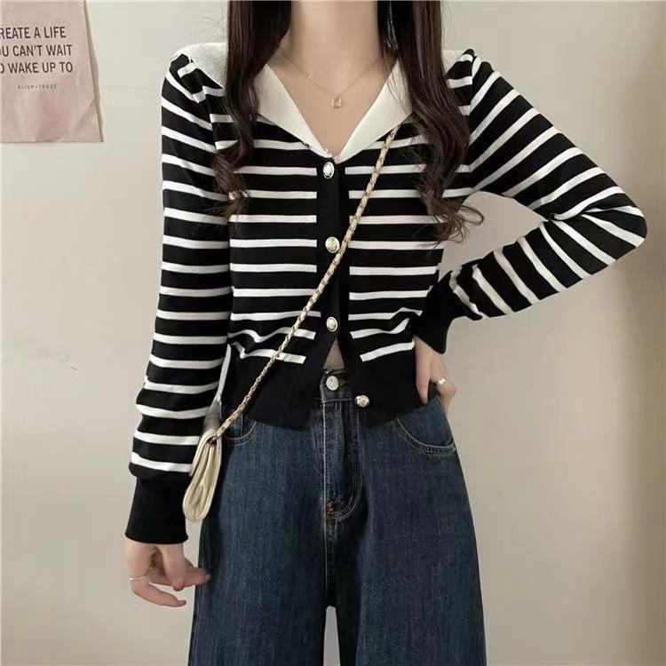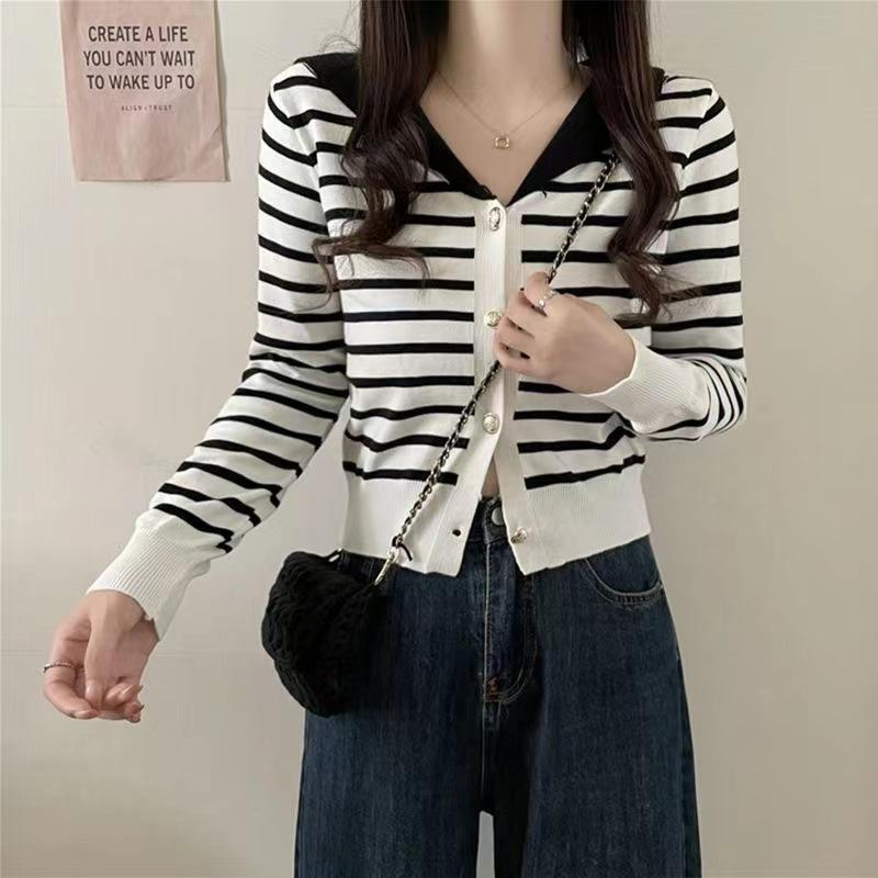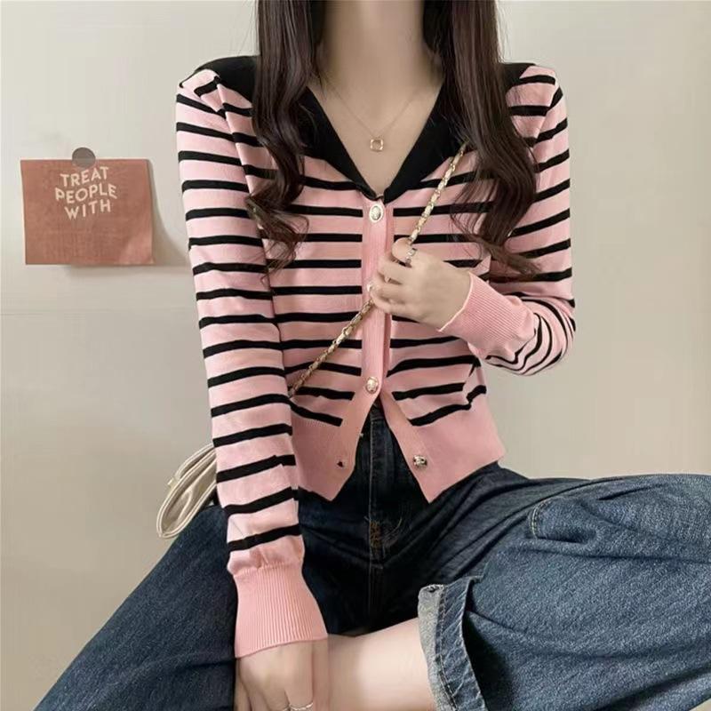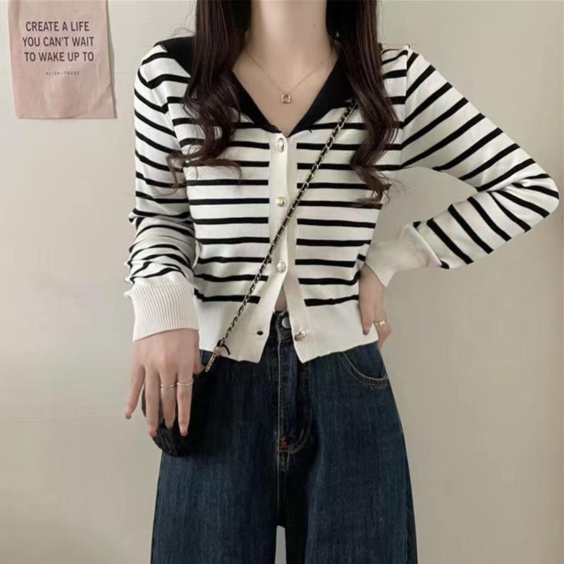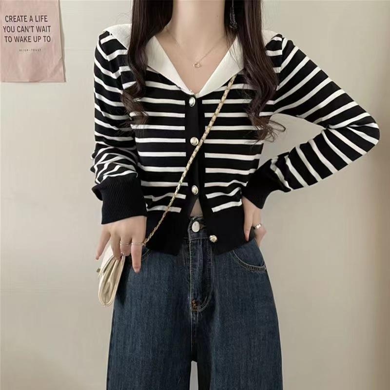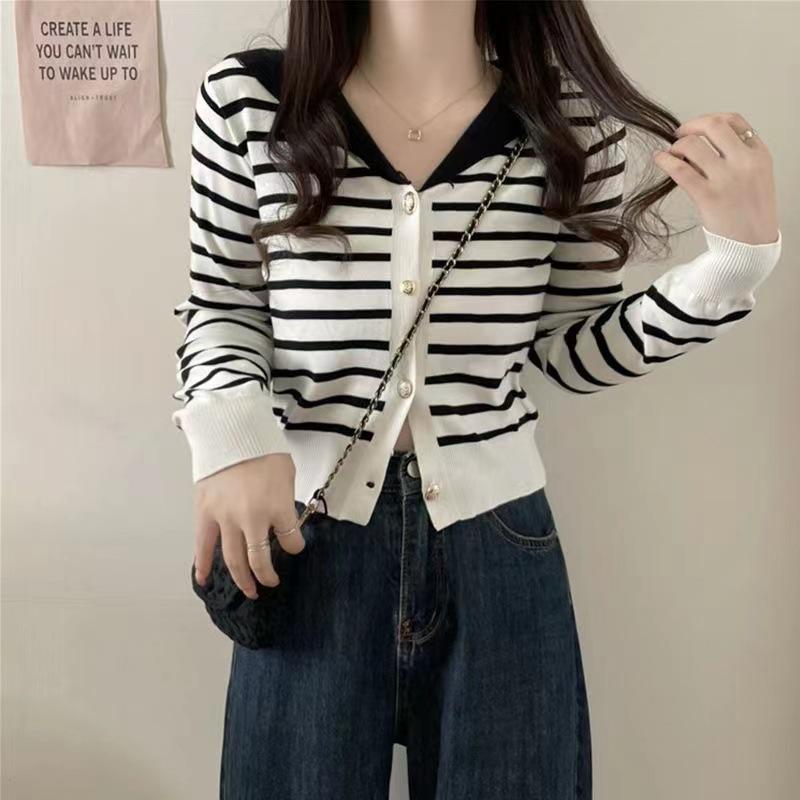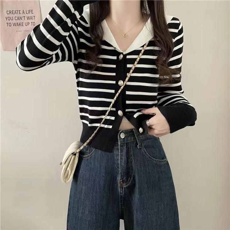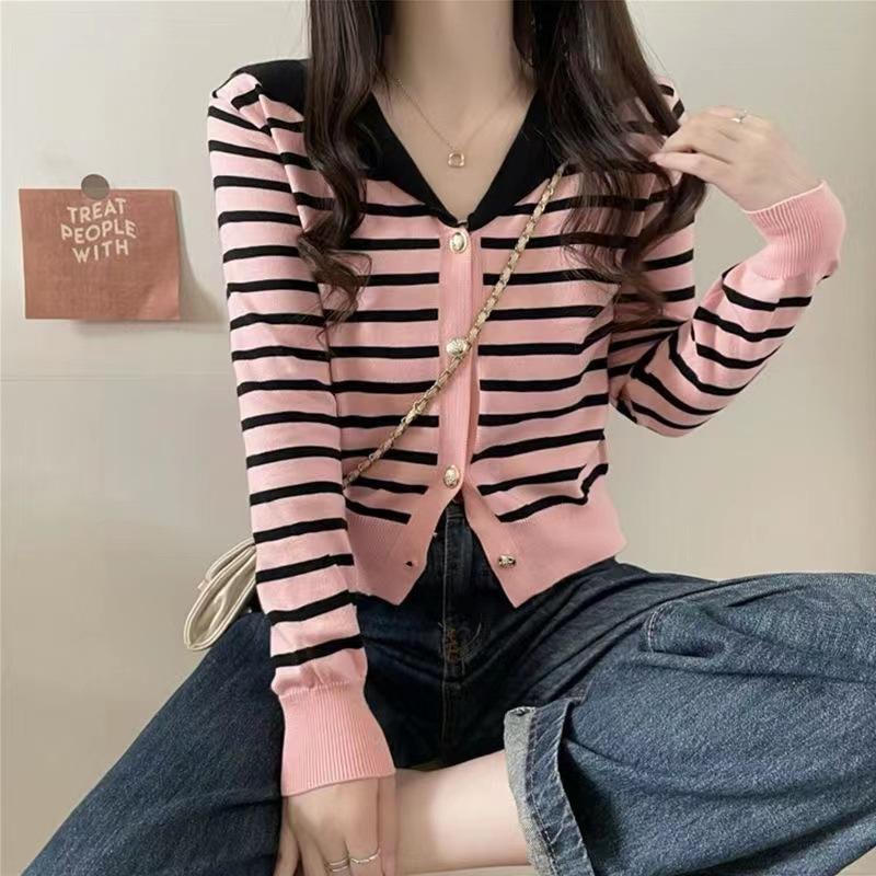 Cárdigan de Punto con Cuello en V y Rayas de Contraste para Mujer Primavera y Otoño Nuevo Estilo Top Básico de Manga Larga Corto para Personas Pequeñas
