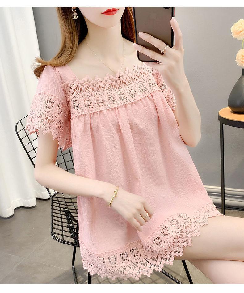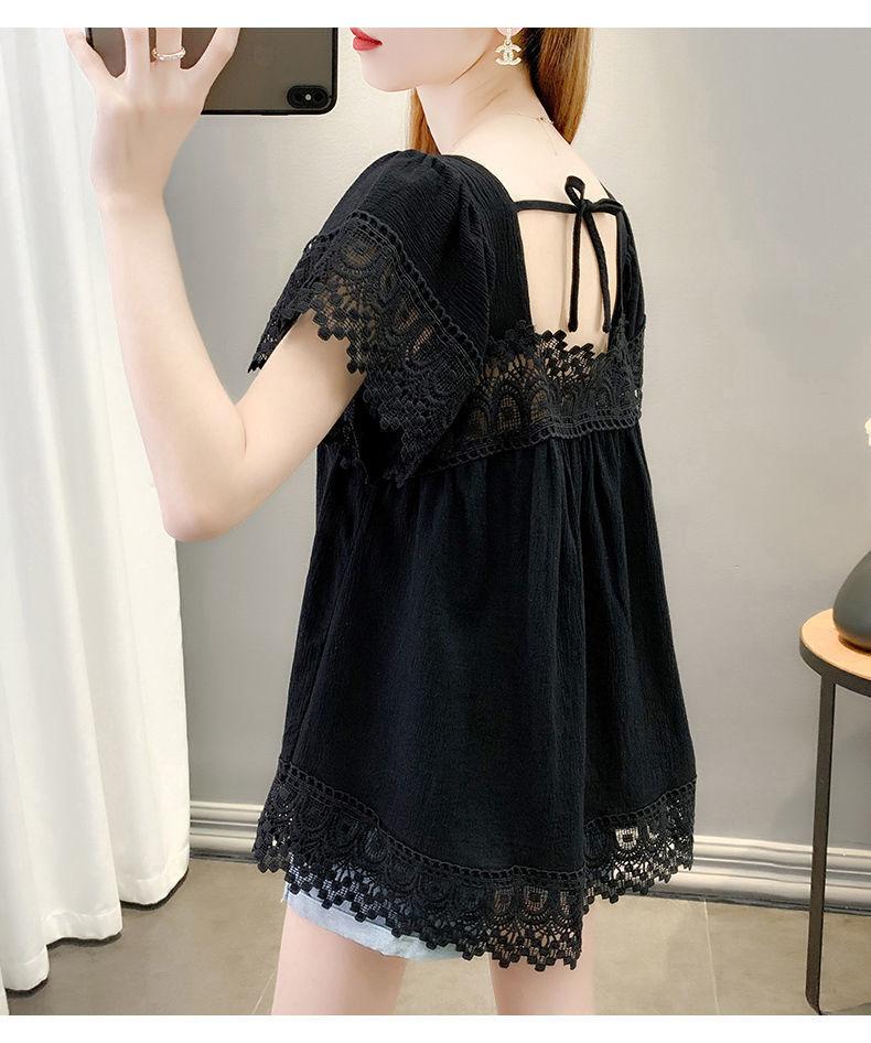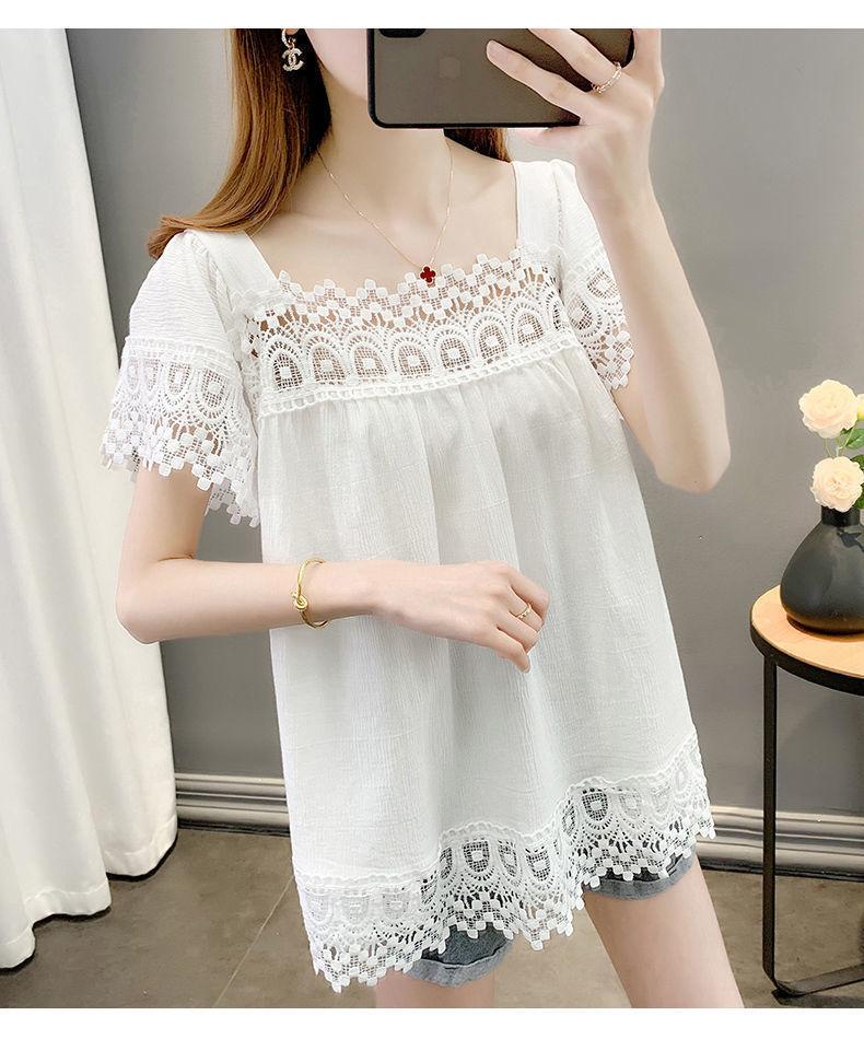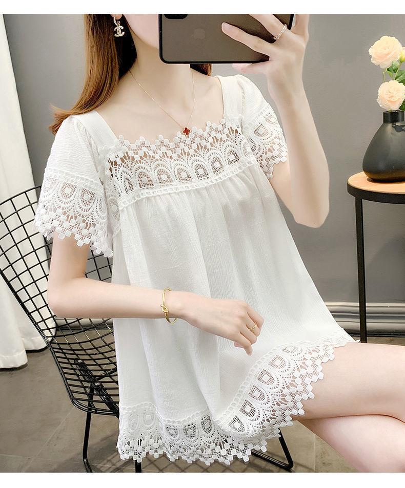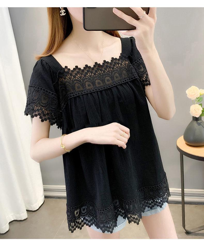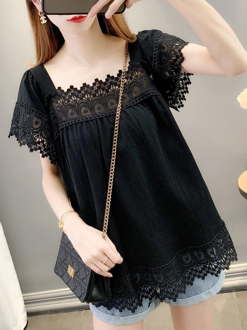 Camiseta de verano gordita nueva, holgada, adelgazante, de manga corta, con encaje hueco, que combina con todo, de gasa que cubre el vientre.