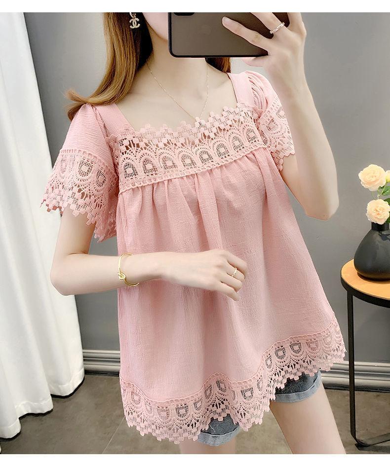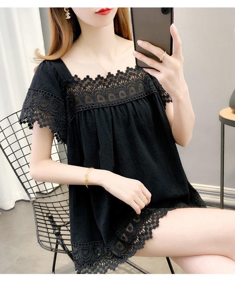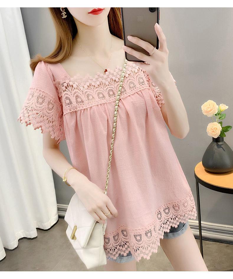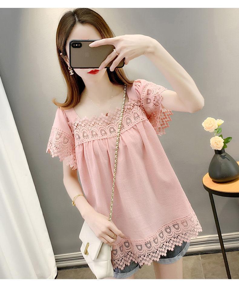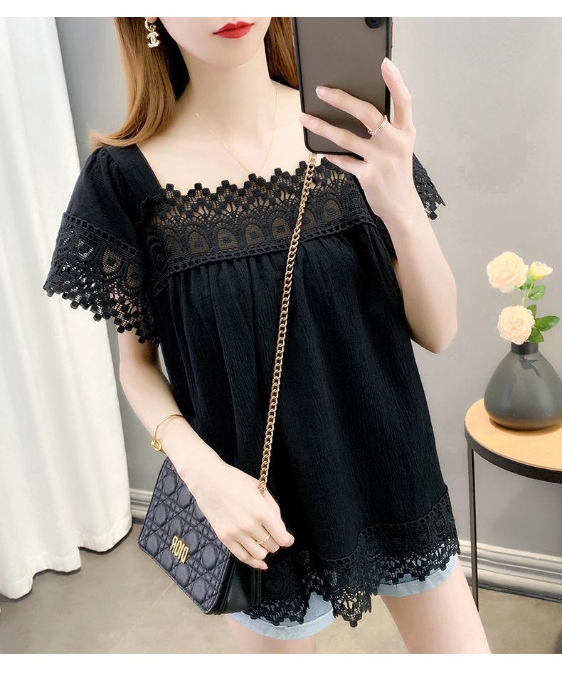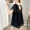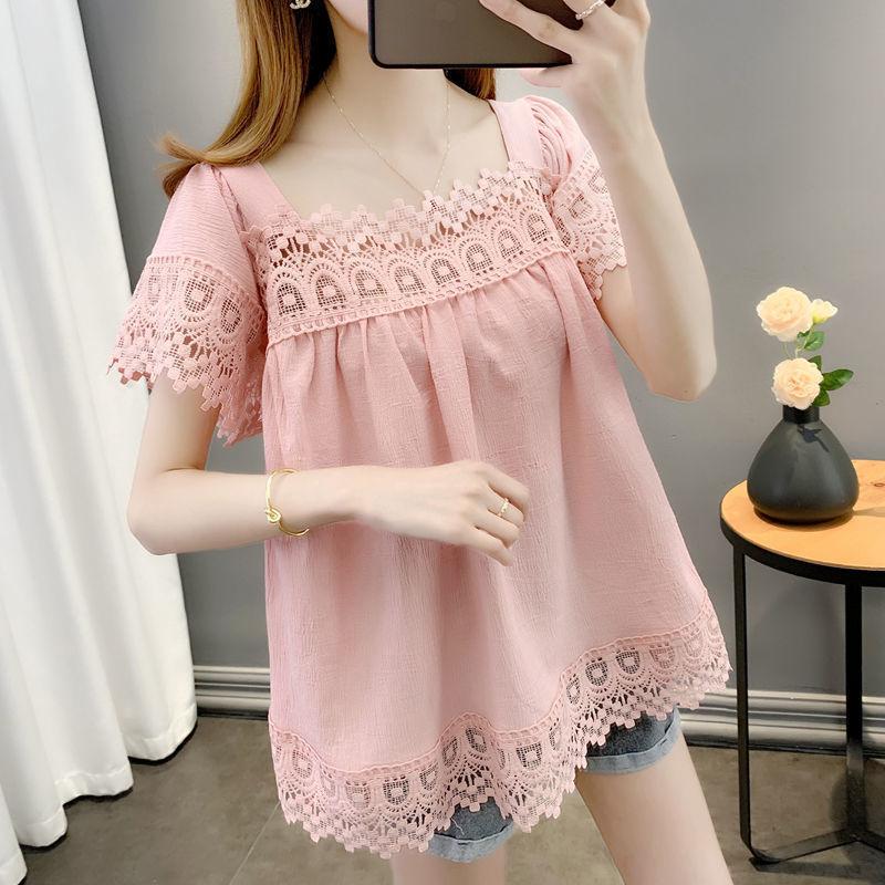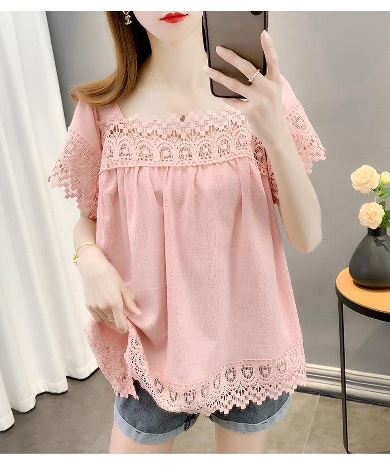 Camiseta de verano gordita nueva, holgada, adelgazante, de manga corta, con encaje hueco, que combina con todo, de gasa que cubre el vientre.