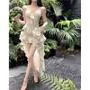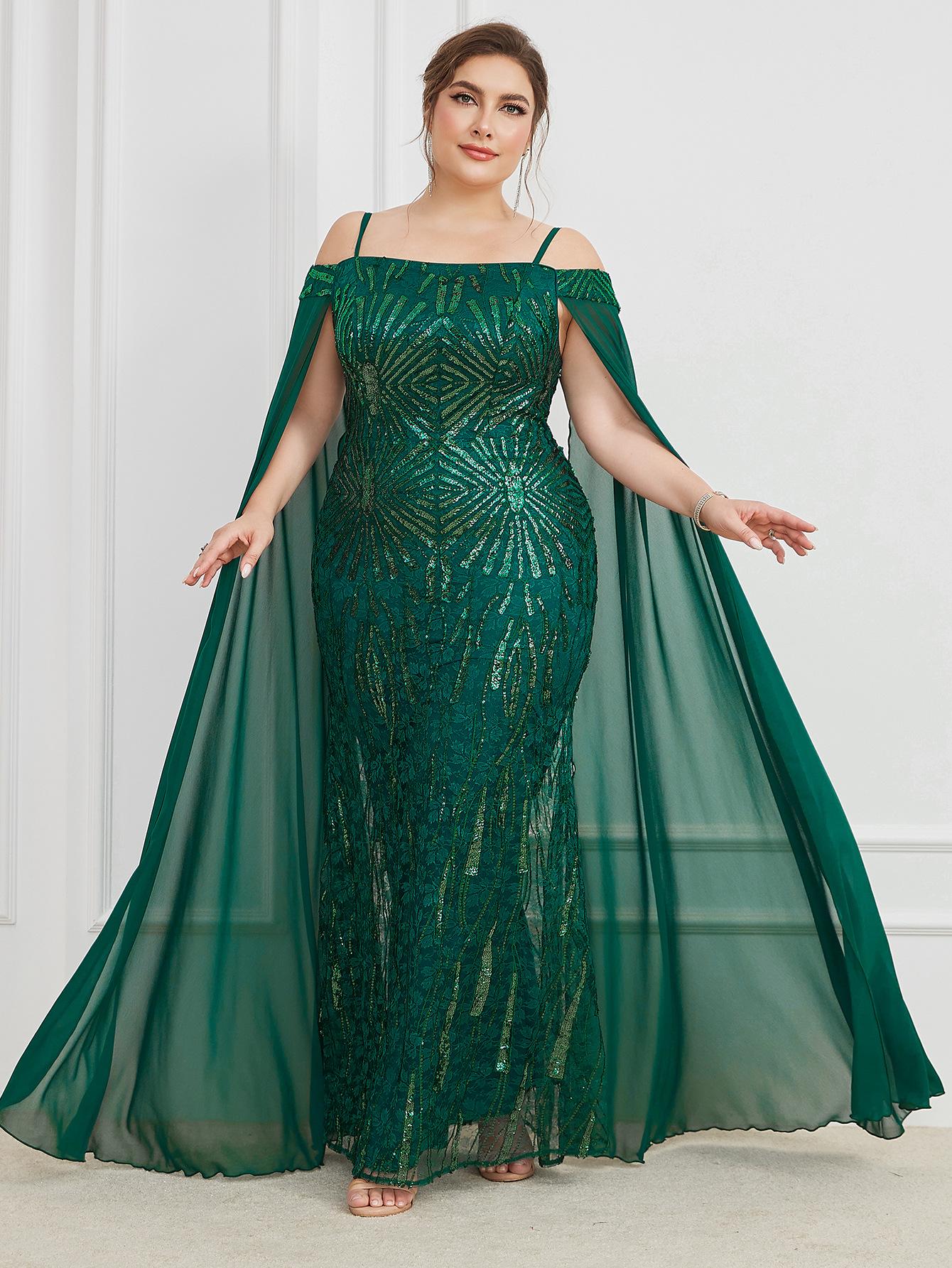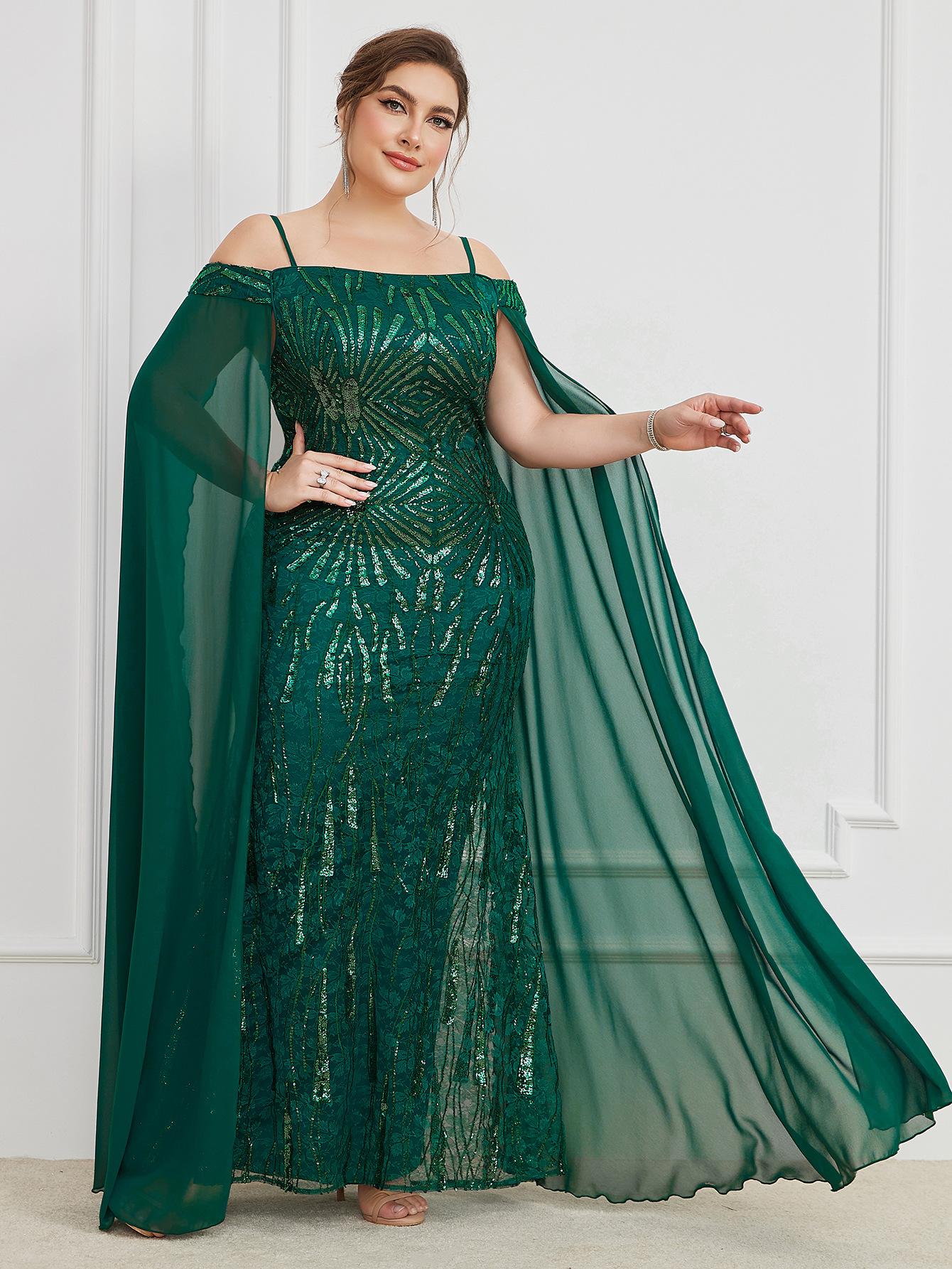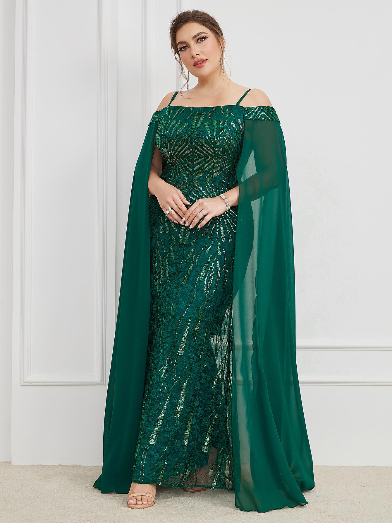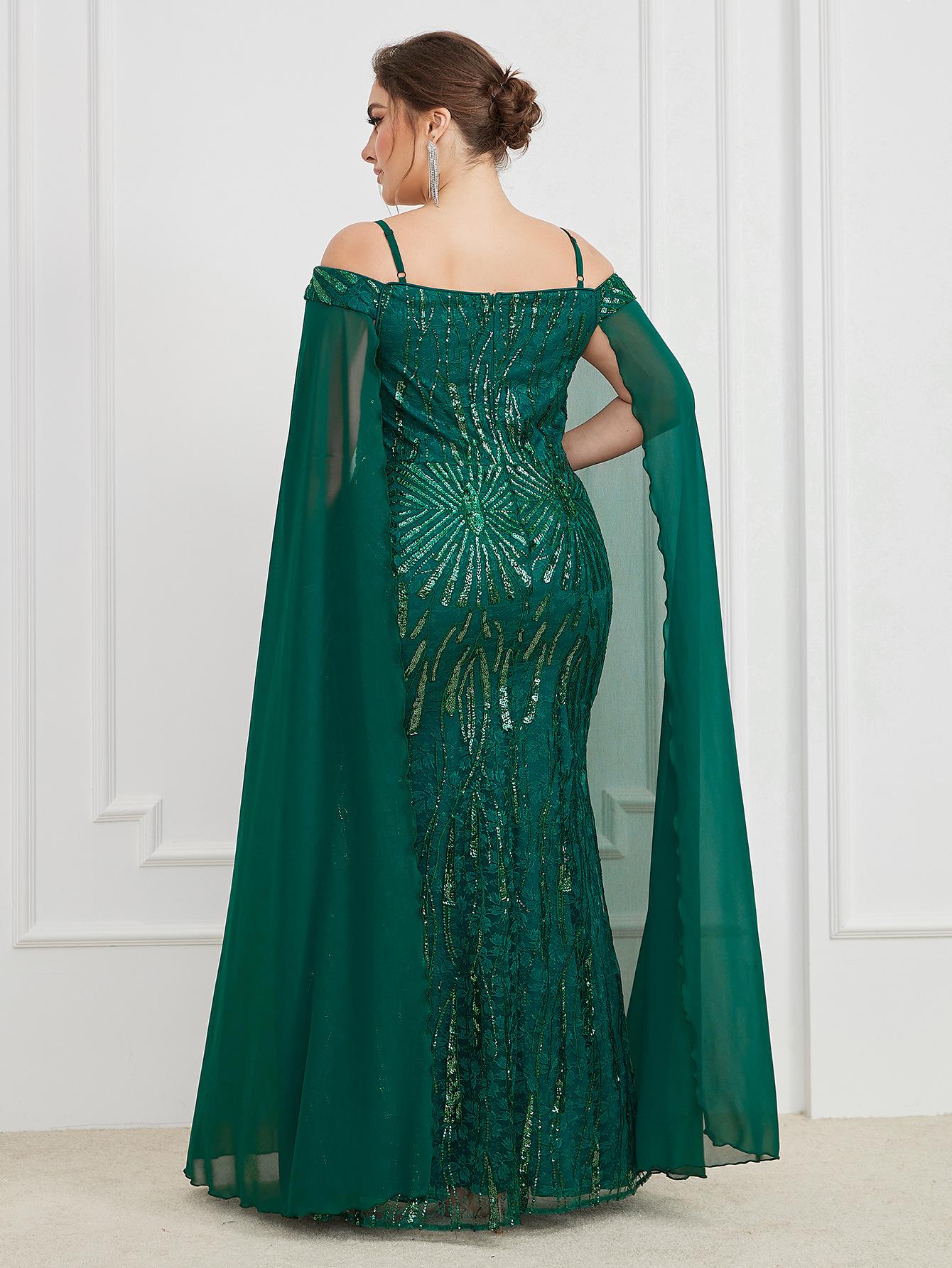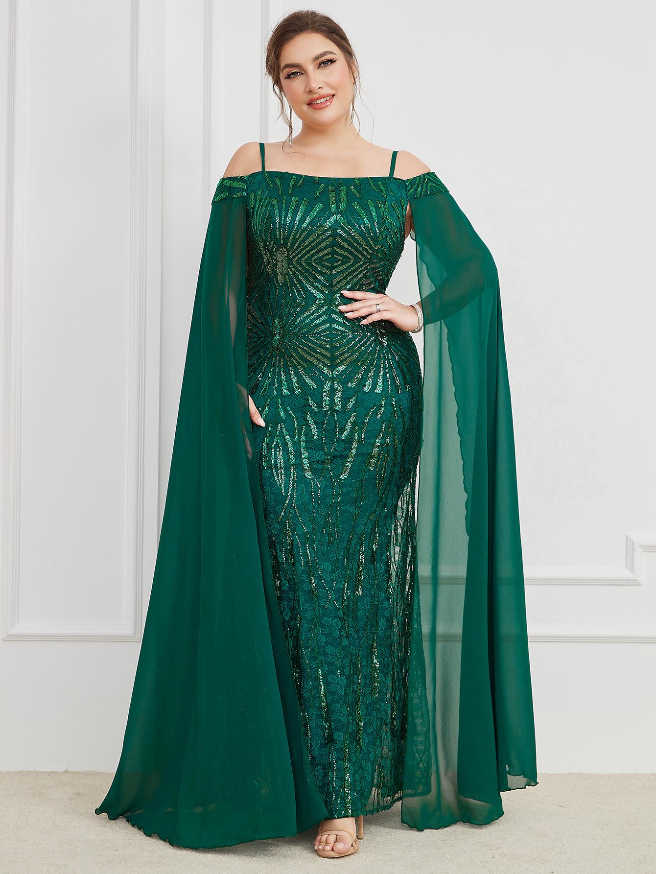 Hermoso vestido largo de gasa con hombros descubiertos, mangas flotantes, costuras y lentejuelas