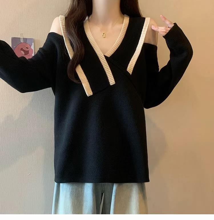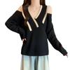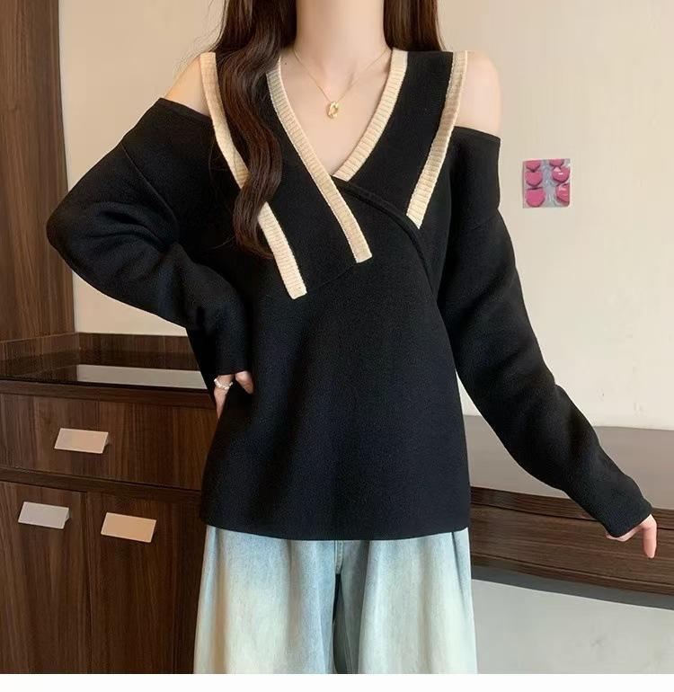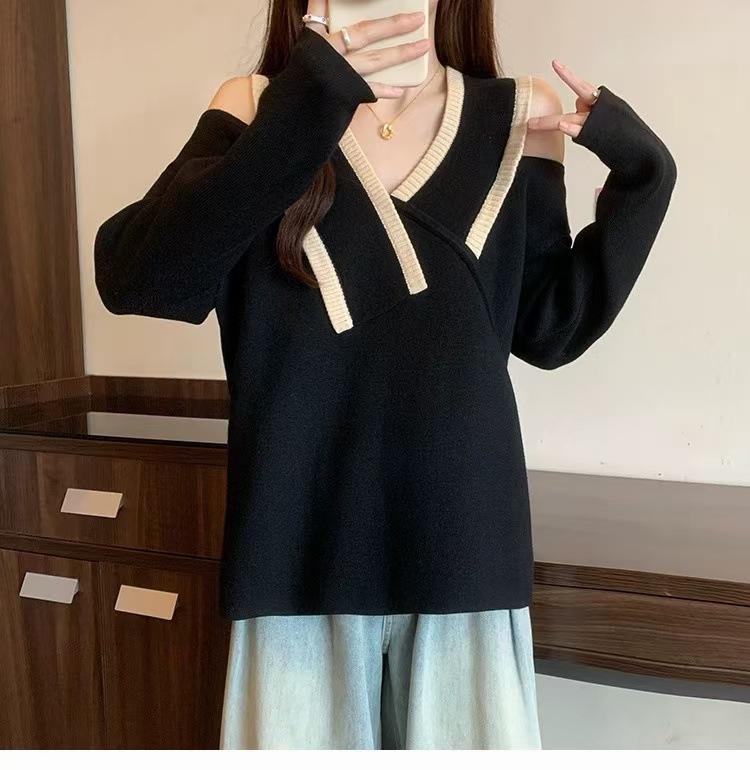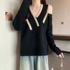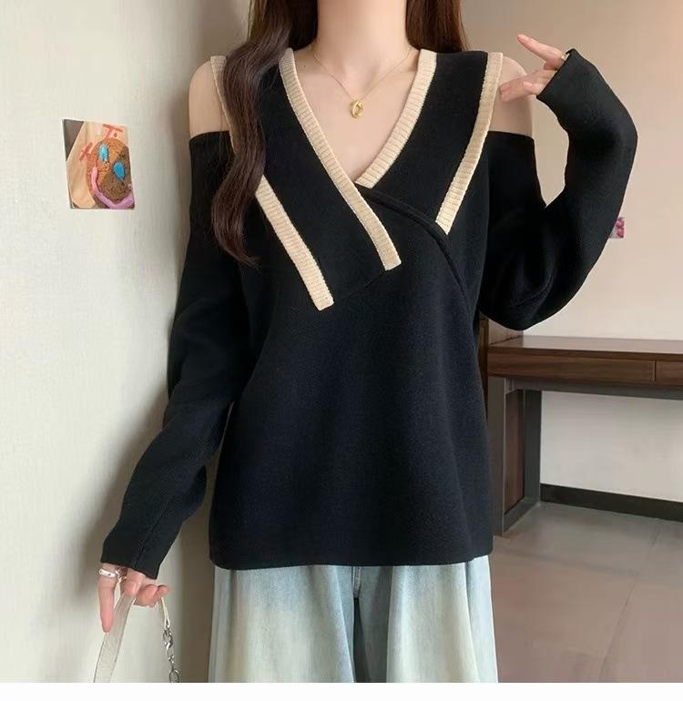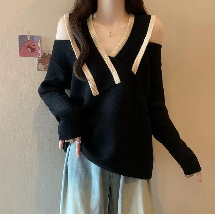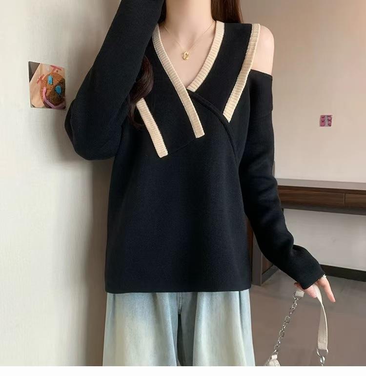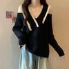 Suéter de cuello en V y hombros descubiertos para mujer, de Design Sense Niche, para otoño e invierno, nuevo, elegante, único, holgado y ajustado.