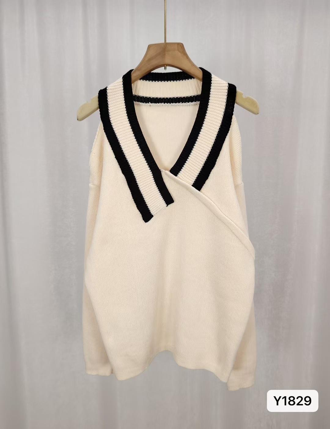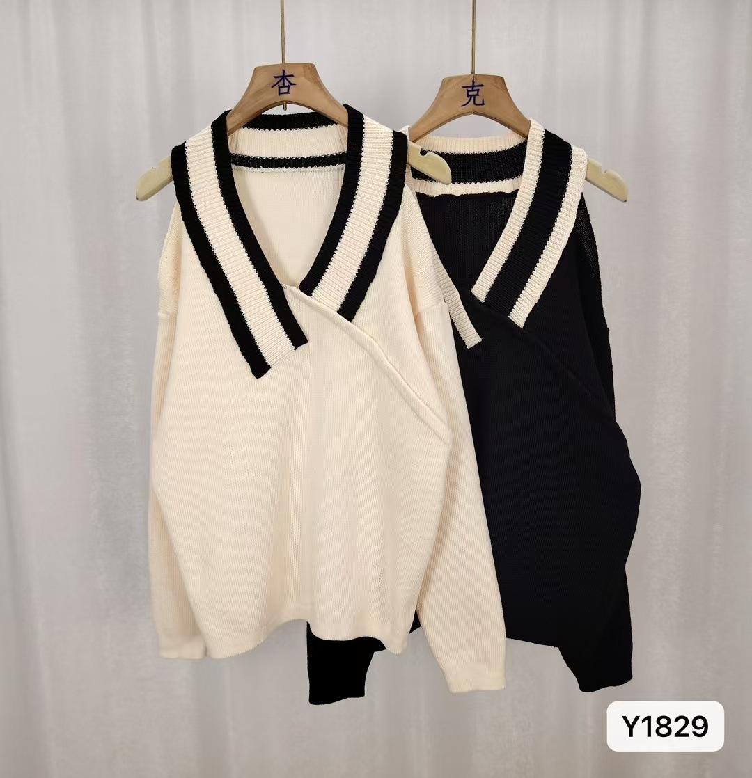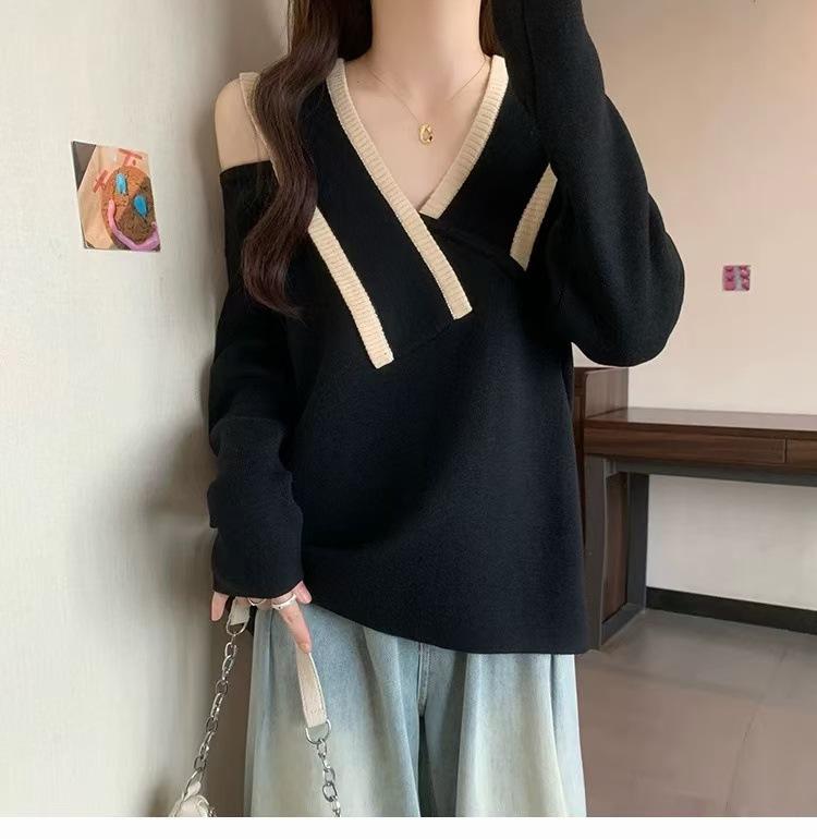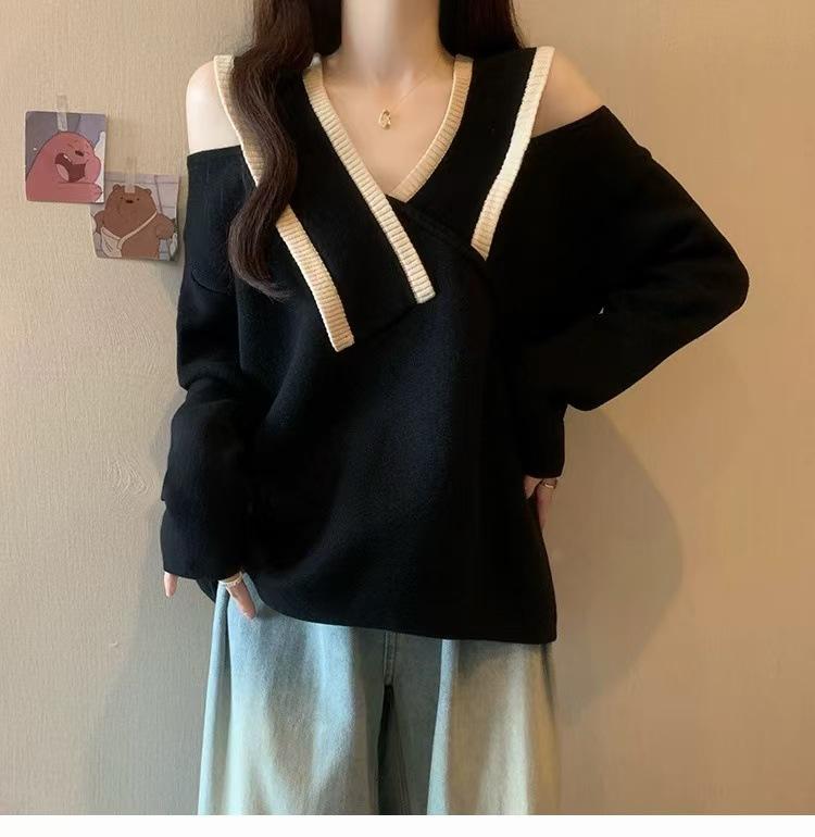 Suéter de cuello en V y hombros descubiertos para mujer, de Design Sense Niche, para otoño e invierno, nuevo, elegante, único, holgado y ajustado.