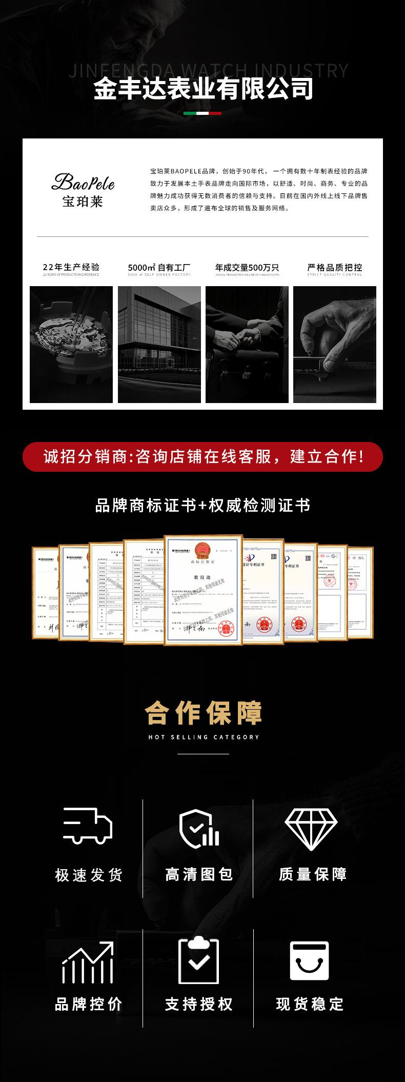 Contamos con nuestra propia fábrica de relojes, y la calidad de nuestros acabados es inigualable con productos de bajo precio. Nos centramos en el desarrollo y la producción de productos para el mercado de relojes de gama media. Con una excelente relación calidad-precio, controlamos estrictamente la calidad de nuestros productos y utilizamos exclusivamente movimientos de alta calidad. Las cajas y correas de los relojes están fabricadas con materiales de alta calidad. Gozamos de gran popularidad y una excelente reputación en el mercado nacional e internacional, y no nos preocupa la comparación con relojes de la misma calidad.