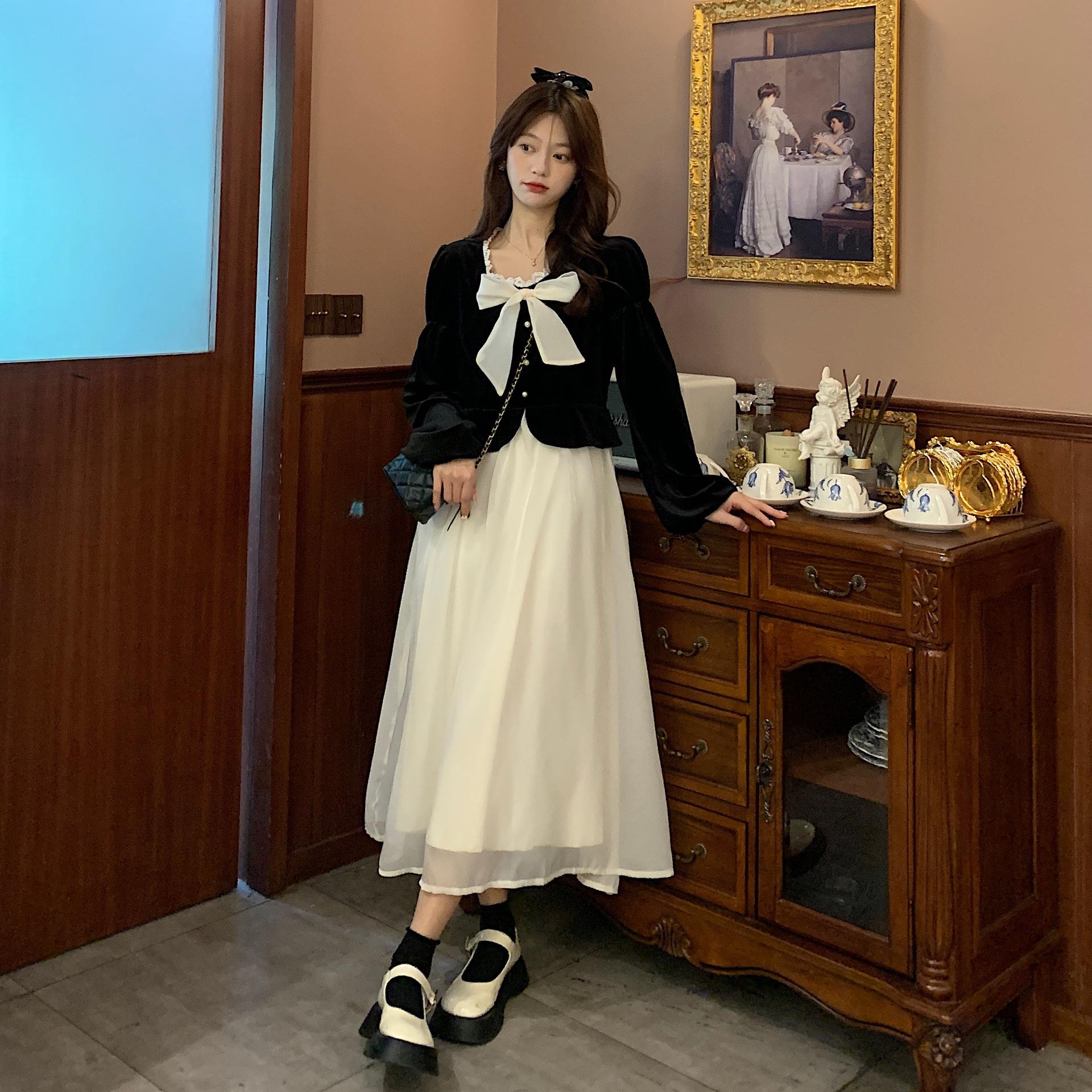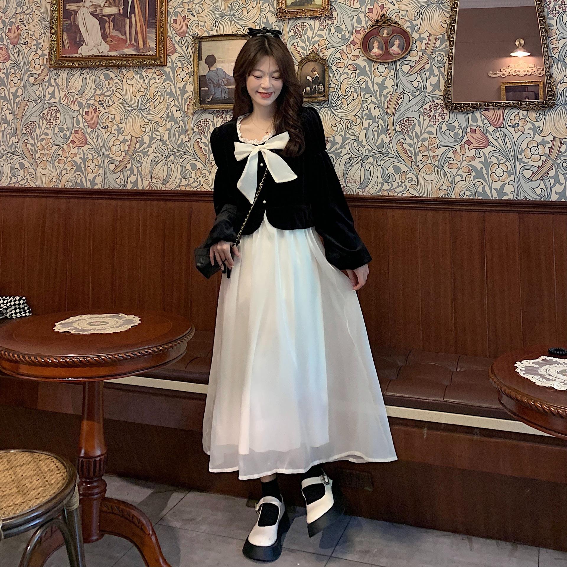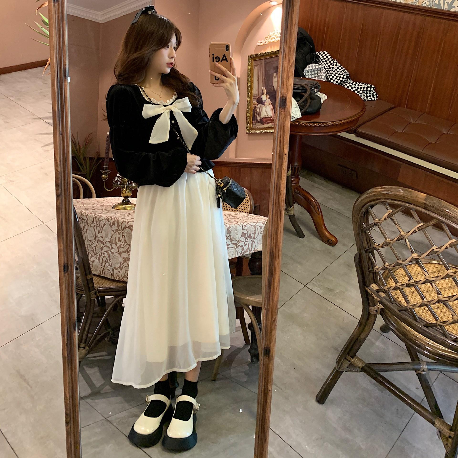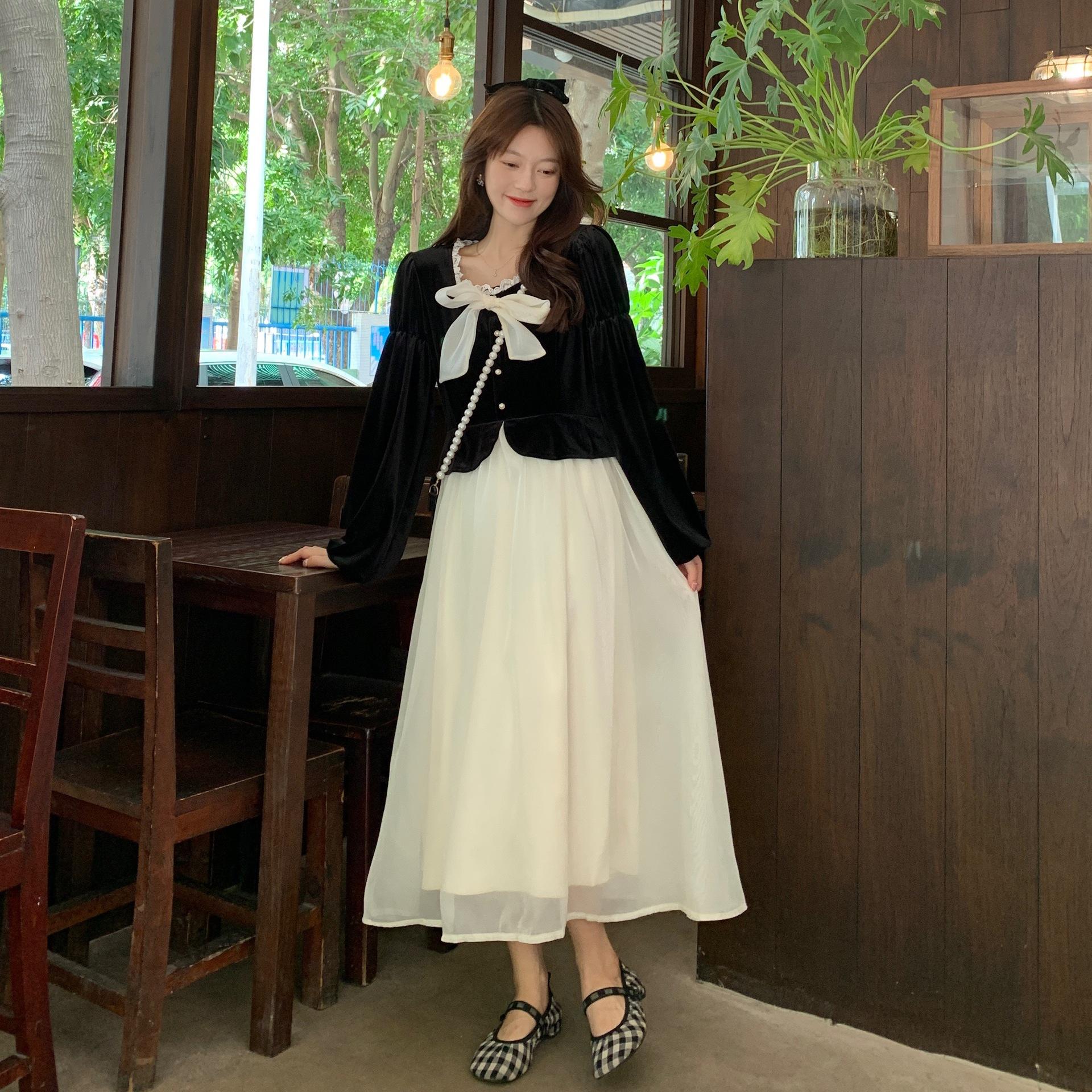 Ropa para Mujer de Talla Grande 2025 Principios de Primavera Nuevo Gordo mm Vestido de Terciopelo de Dos Piezas Falso para Mujer Top con Lazo Falda Empalmada