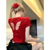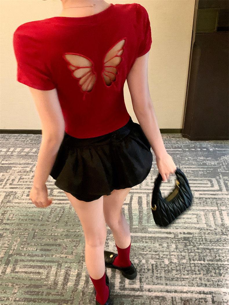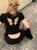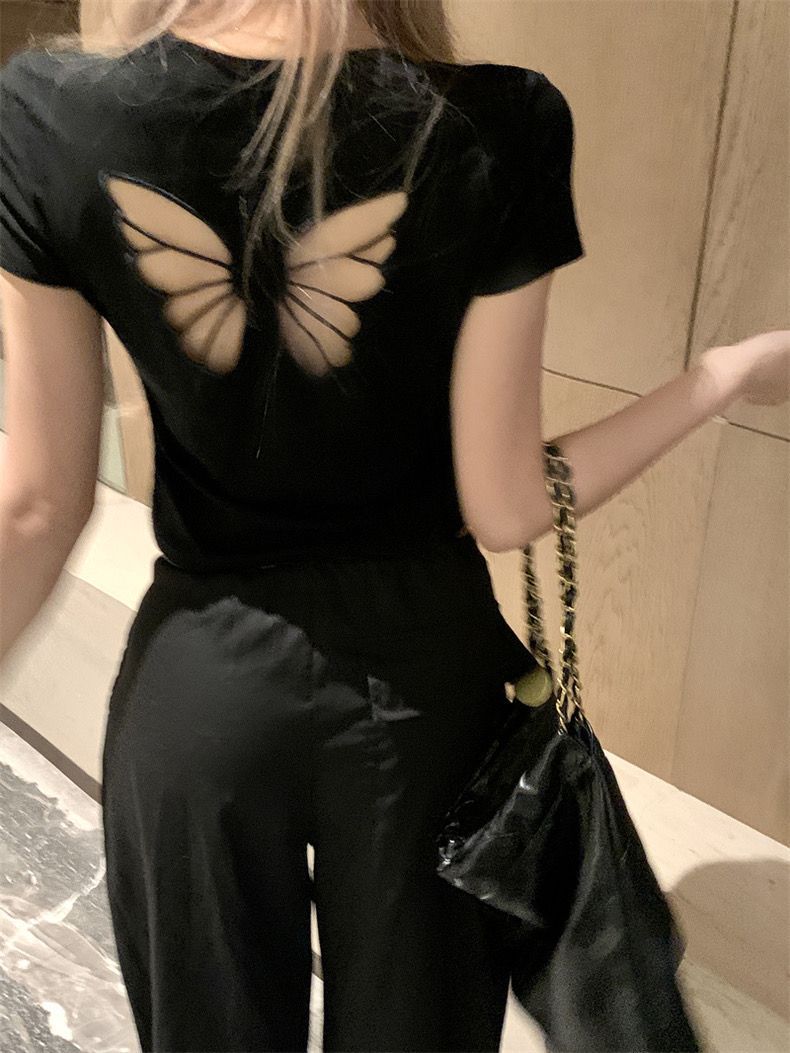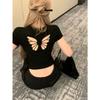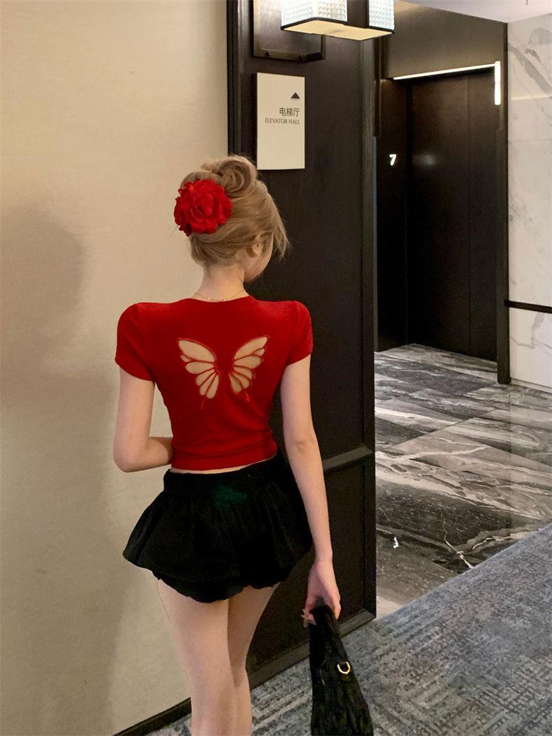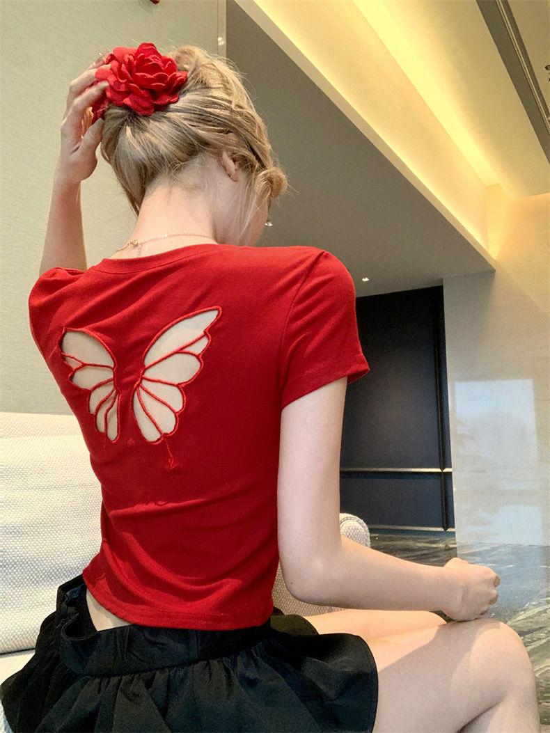 Playera de manga corta con hombros descubiertos de mariposa hueca dulce y picante para mujer, verano, sexy, nicho, entallada, adelgazante, corta hasta el ombligo