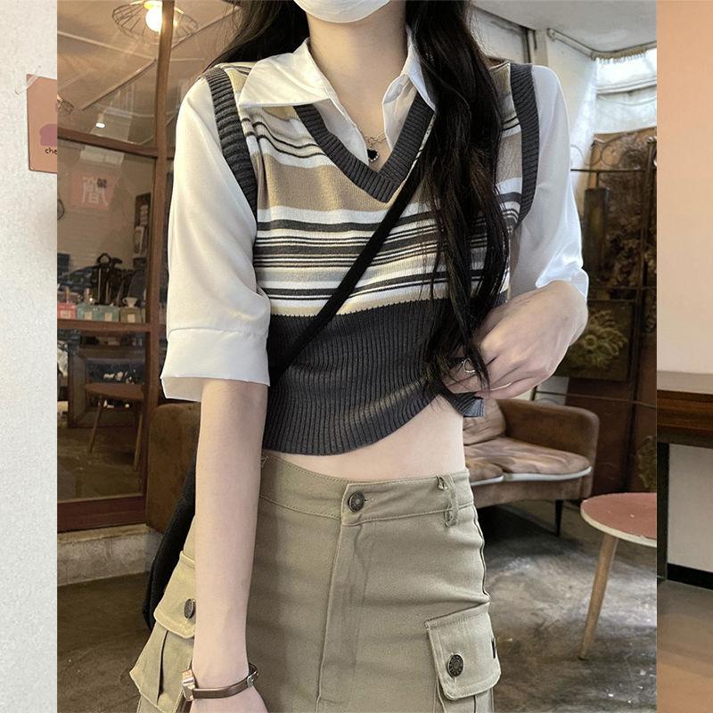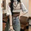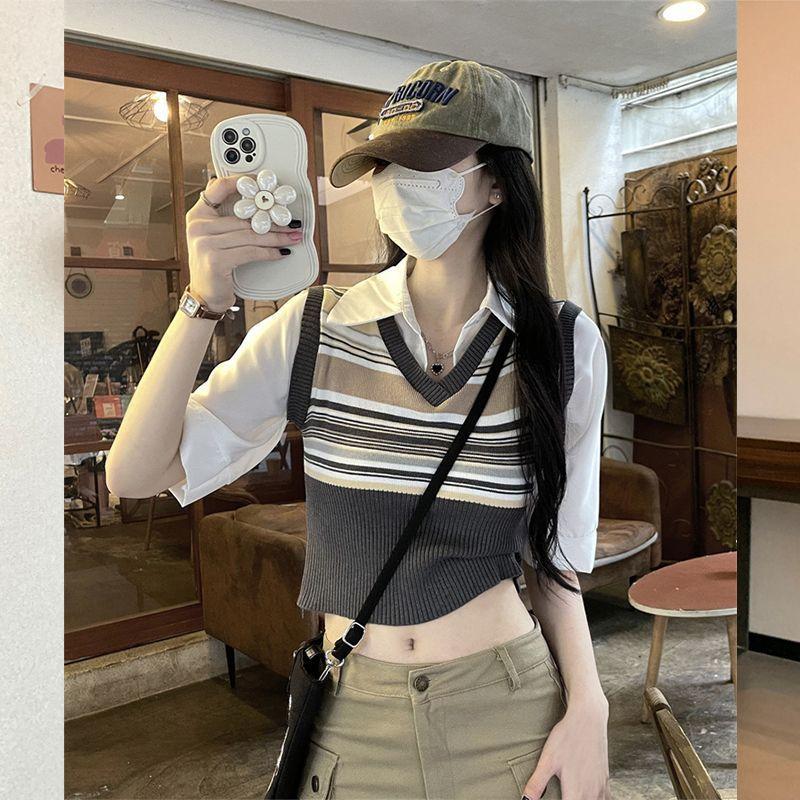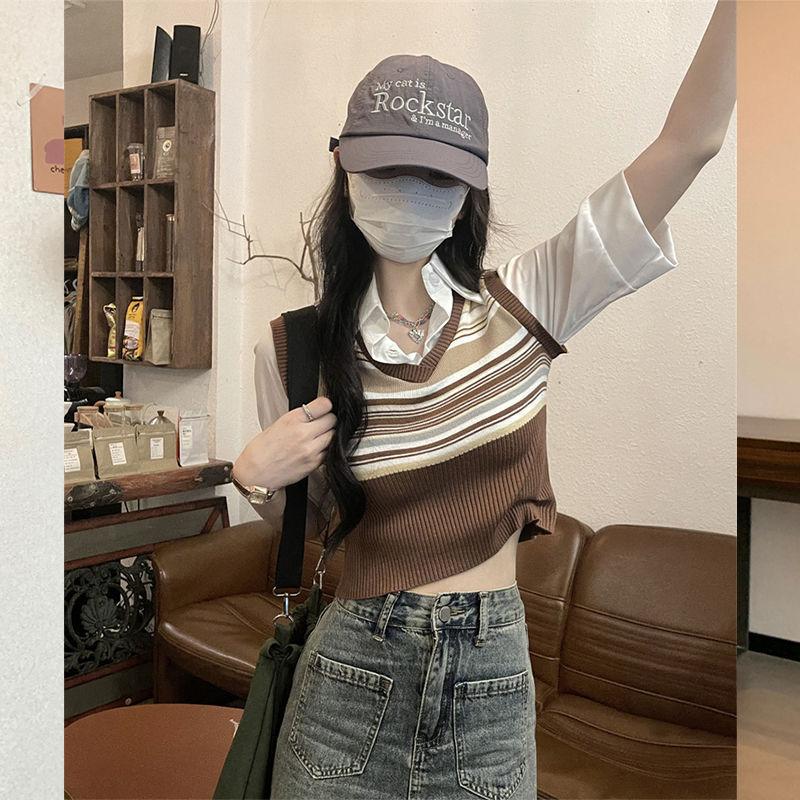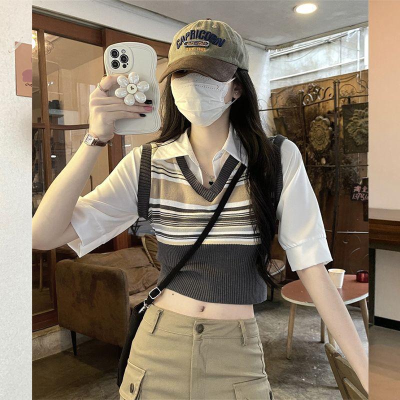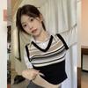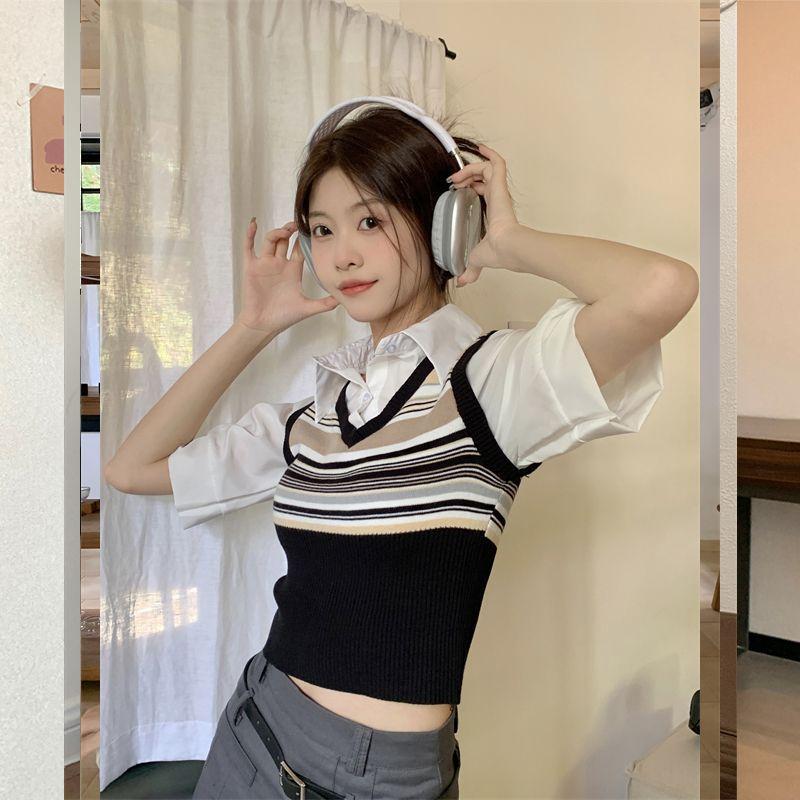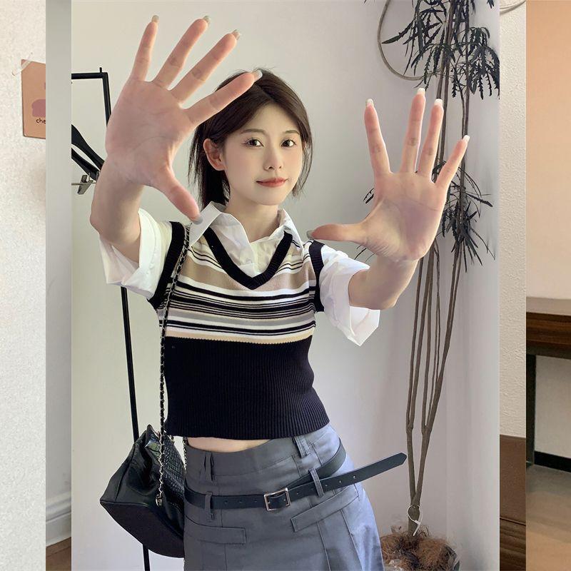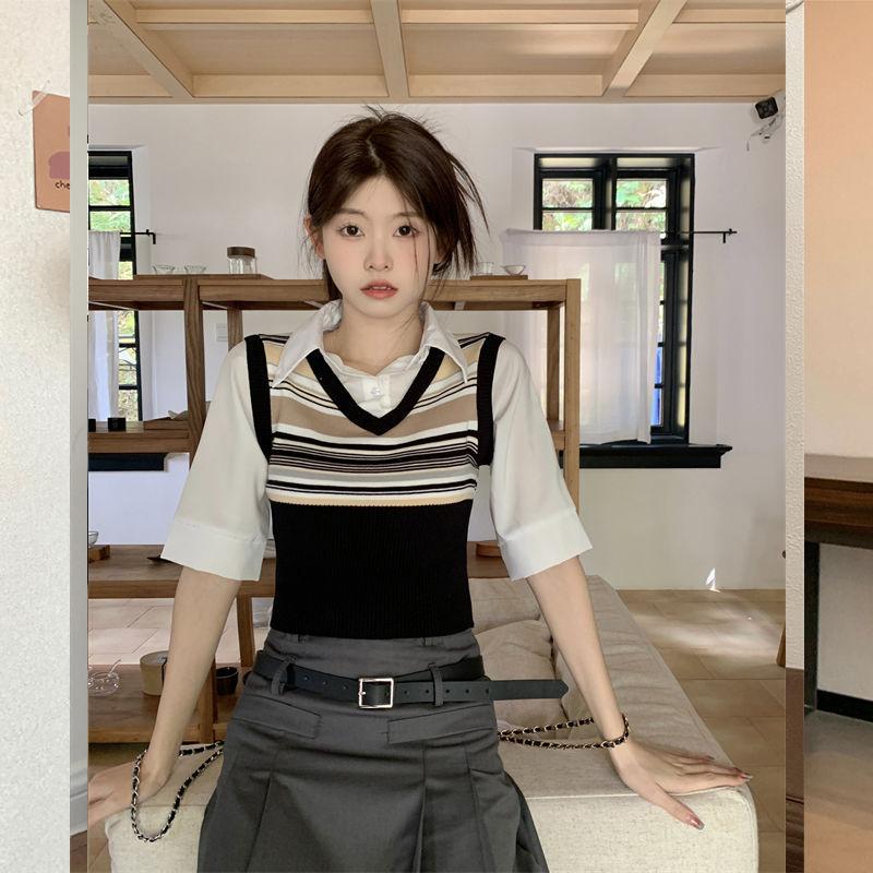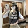 Top de Punto Rayado Estilo Universitario Patchwork Falso Dos Piezas Versión Coreana Otoño 2025 Cuello Polo Ajustado Corto Nicho Top para Mujer