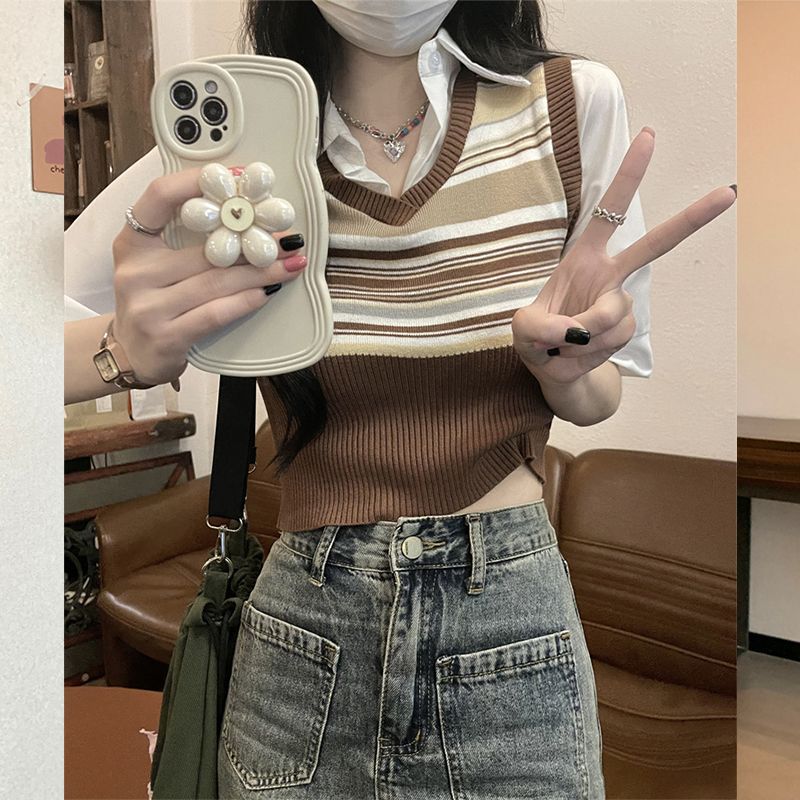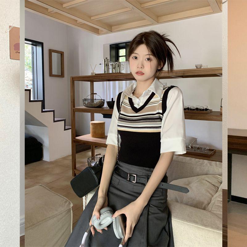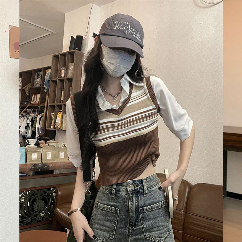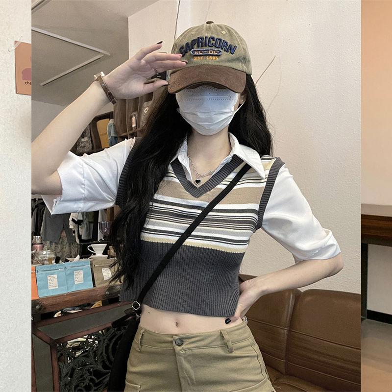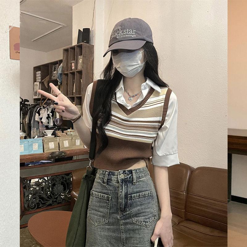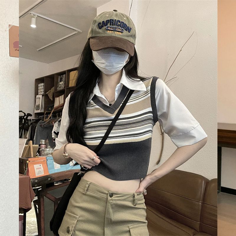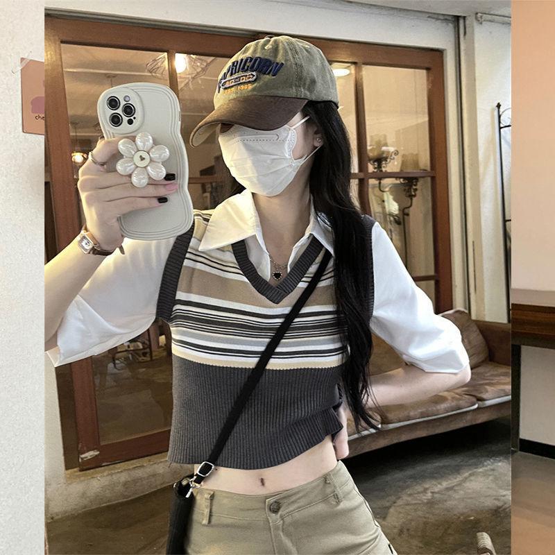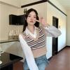 Top de Punto Rayado Estilo Universitario Patchwork Falso Dos Piezas Versión Coreana Otoño 2025 Cuello Polo Ajustado Corto Nicho Top para Mujer
