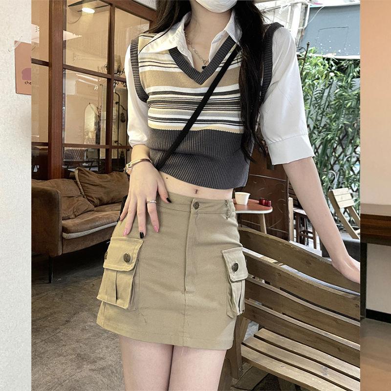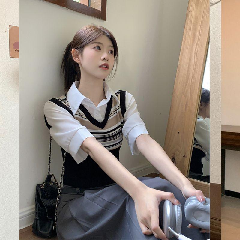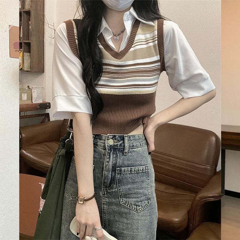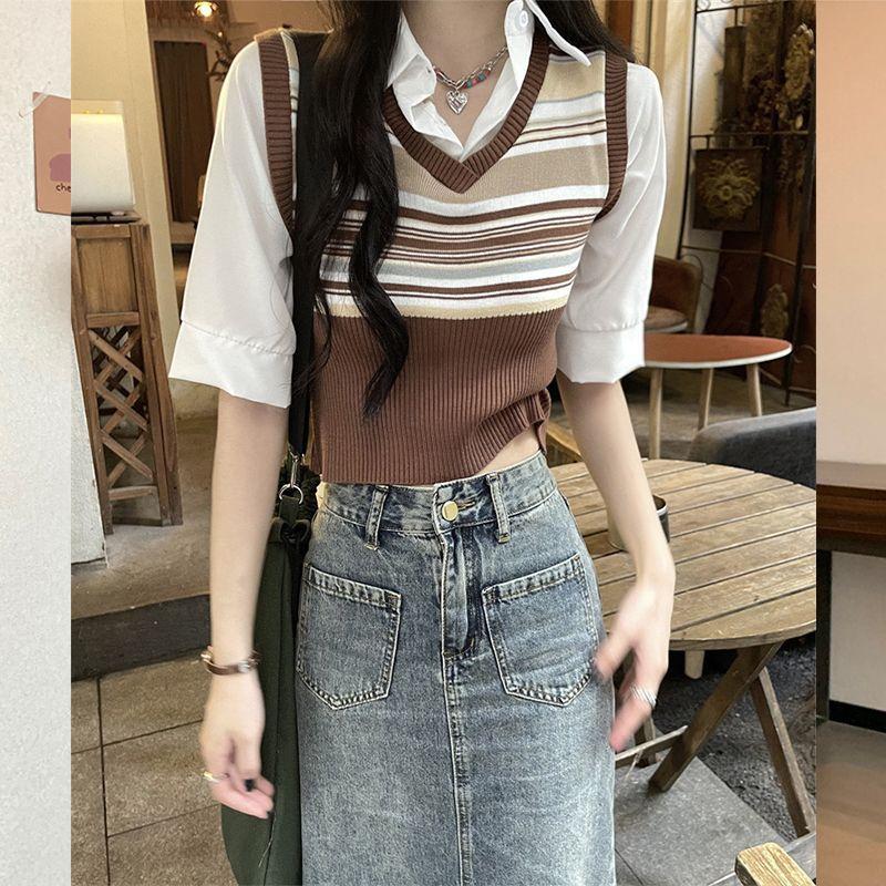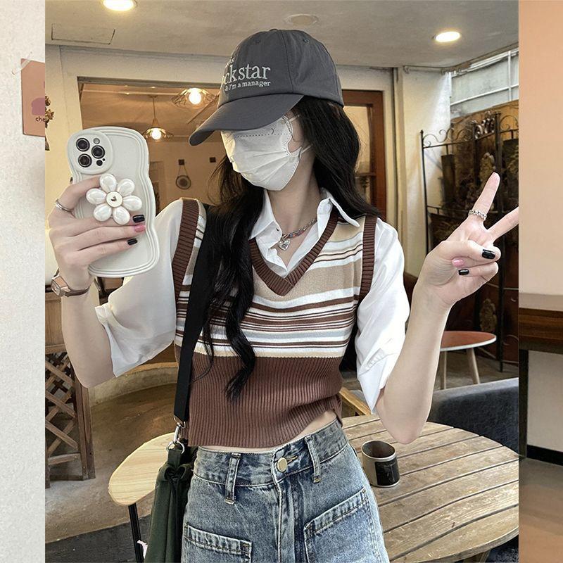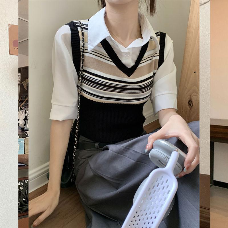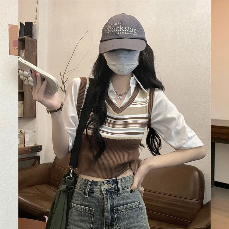 Top de Punto Rayado Estilo Universitario Patchwork Falso Dos Piezas Versión Coreana Otoño 2025 Cuello Polo Ajustado Corto Nicho Top para Mujer