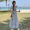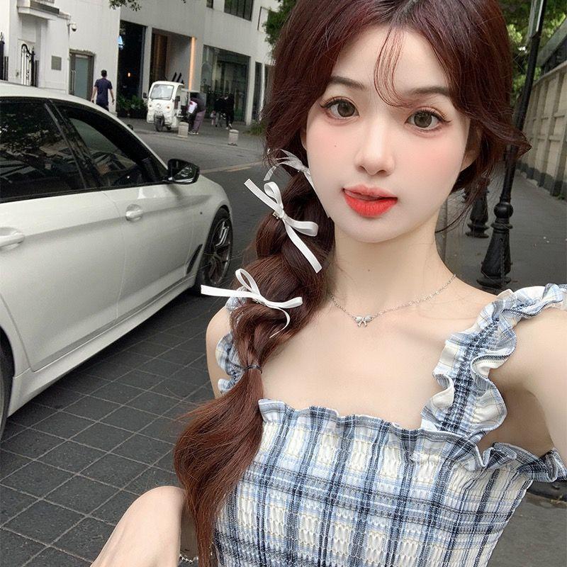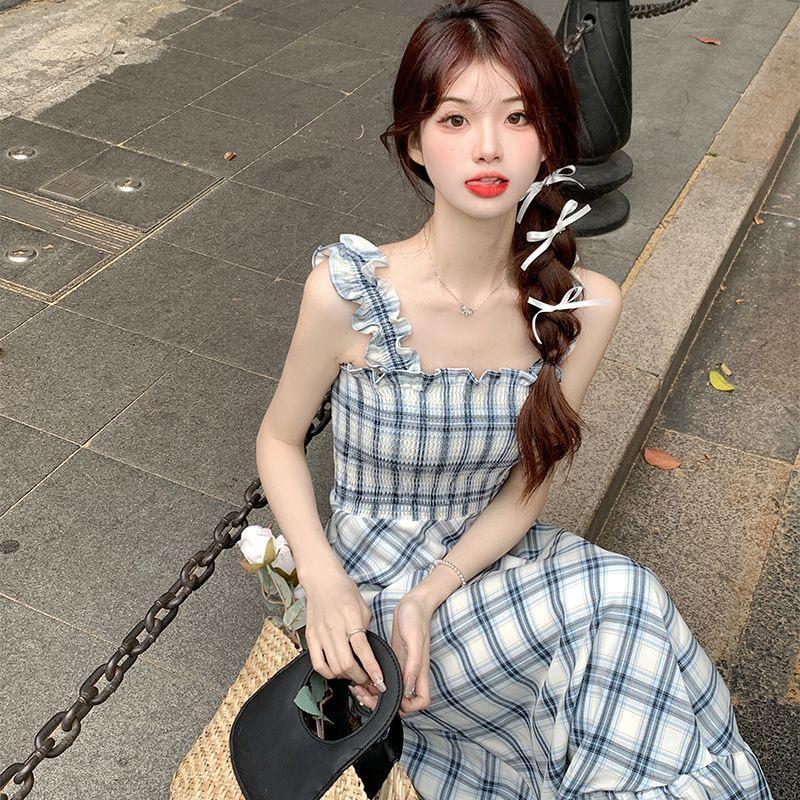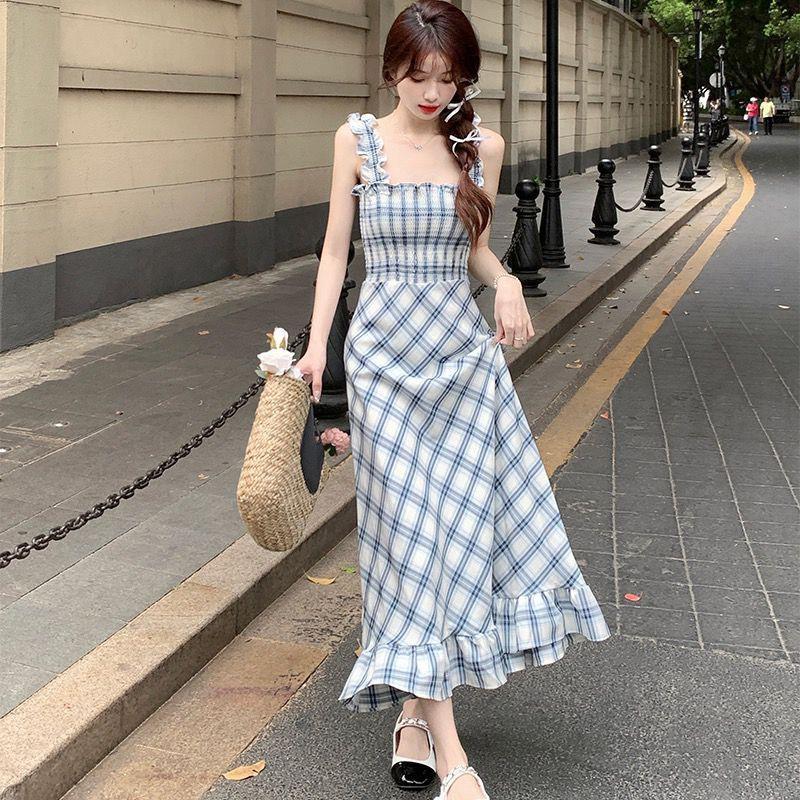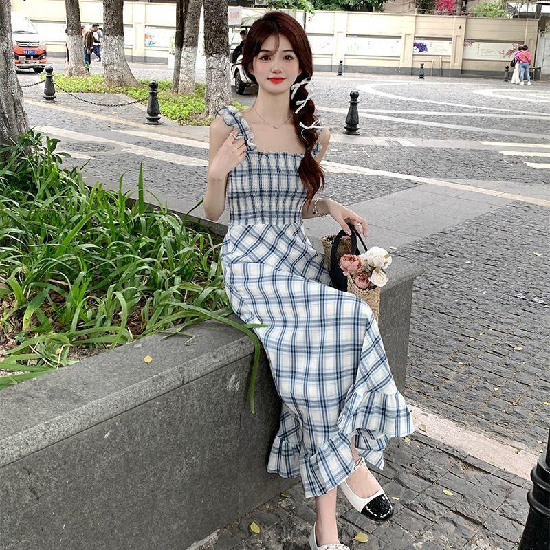Vestido adelgazante estampado a cuadros, falda con tirantes, falda de playa, vacaciones junto al mar, chica guapa alta, vestido chaleco sin mangas