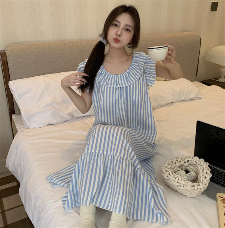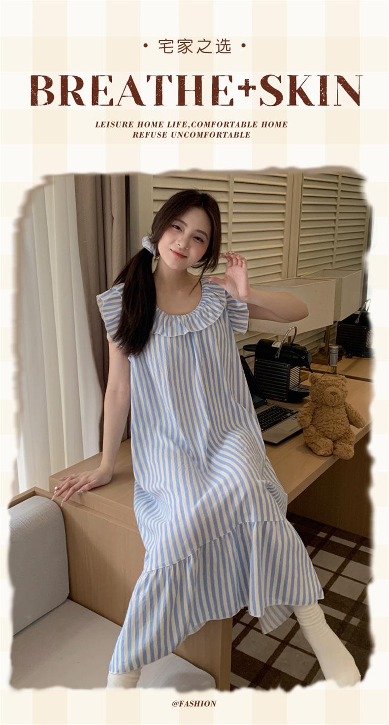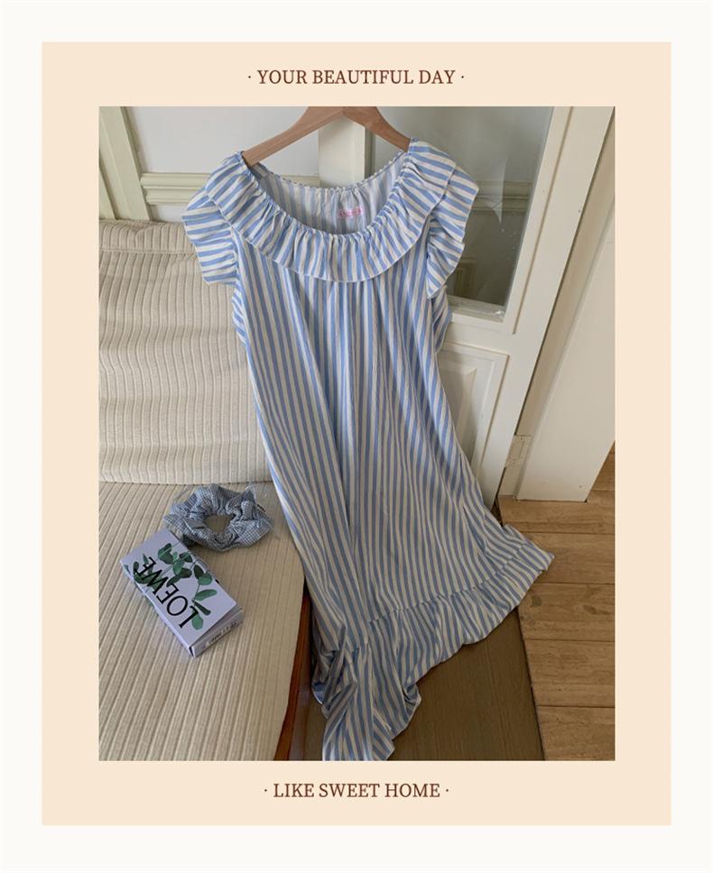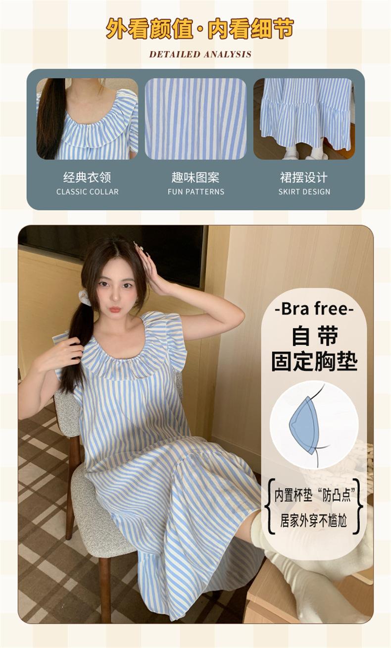 Camisón de verano para mujer, sin mangas, con almohadilla en el pecho, estilo dulce, a rayas, de algodón con nubes, con falda y mangas pequeñas, pijama para el hogar