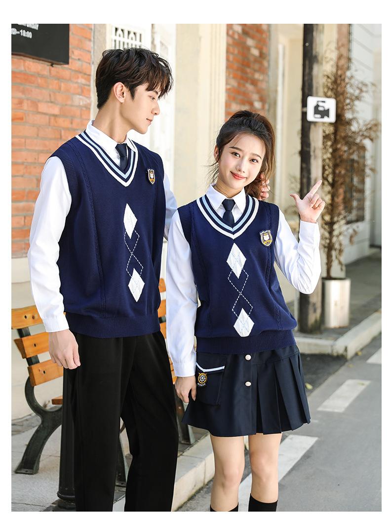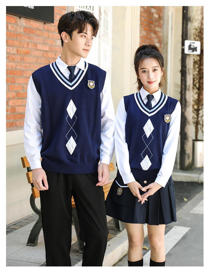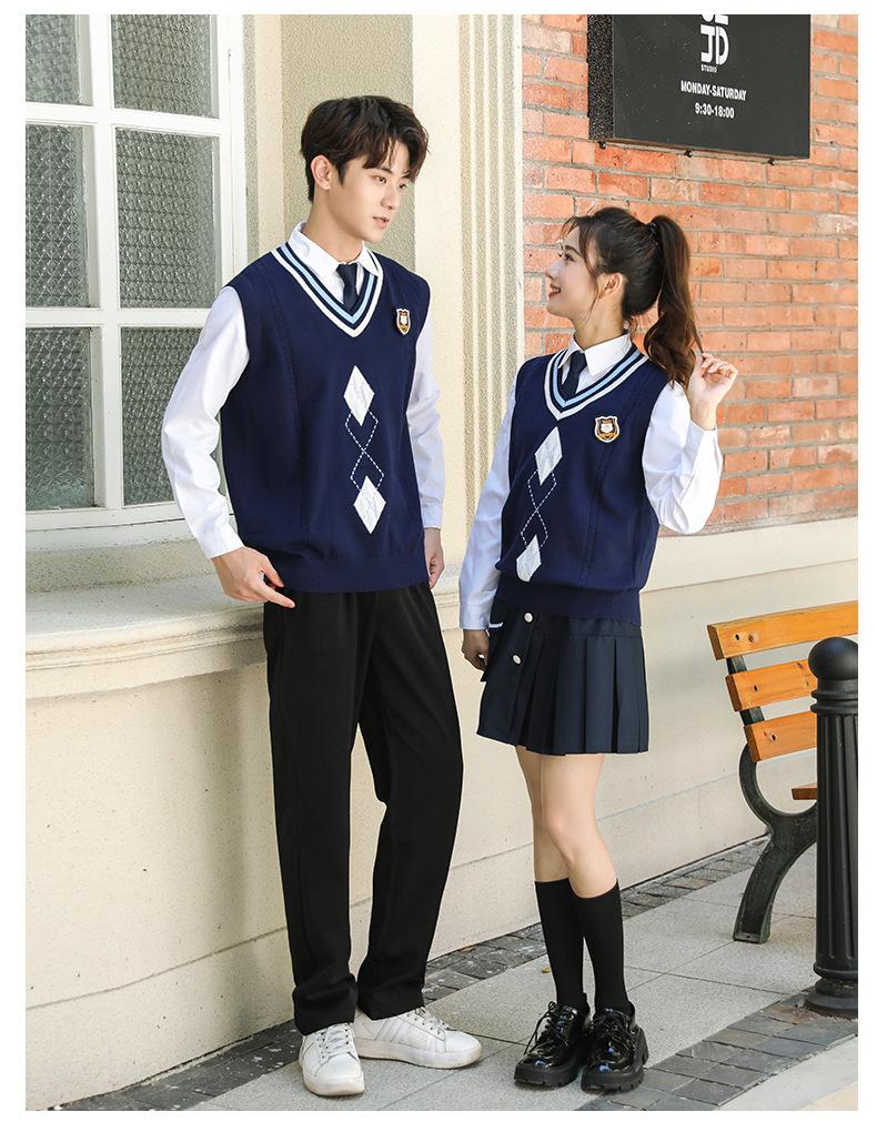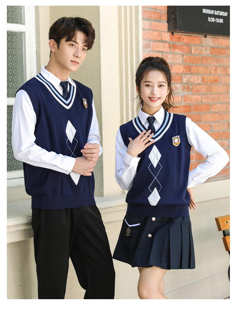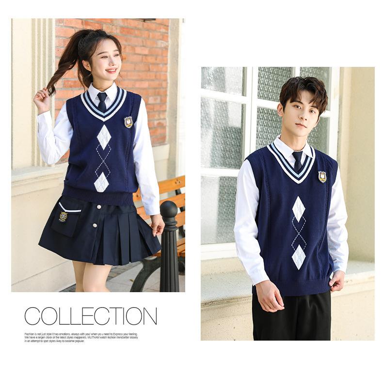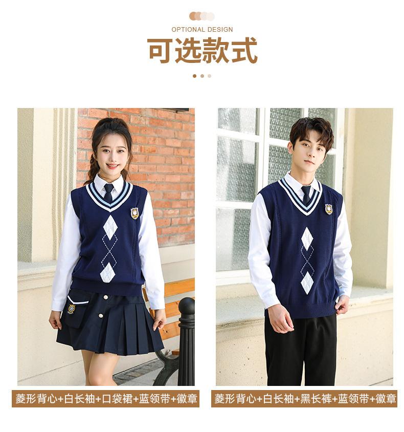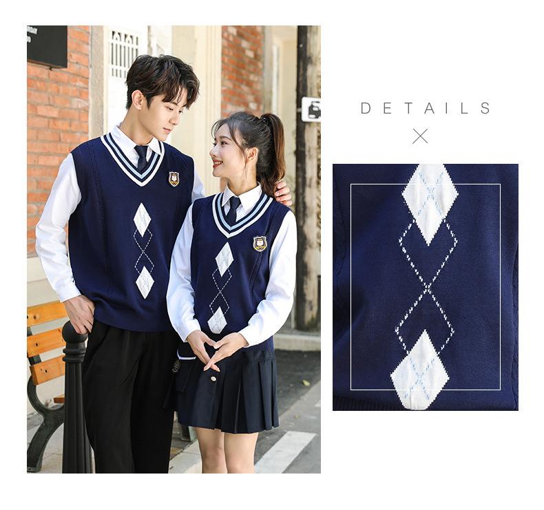 Women's diamond vest + white long sleeve + Pocket Skirt + Blue Tie + badge, Men's rhombus vest + white long sl...