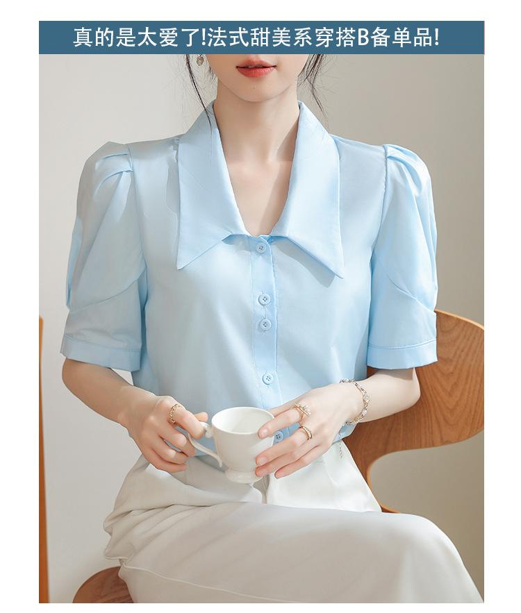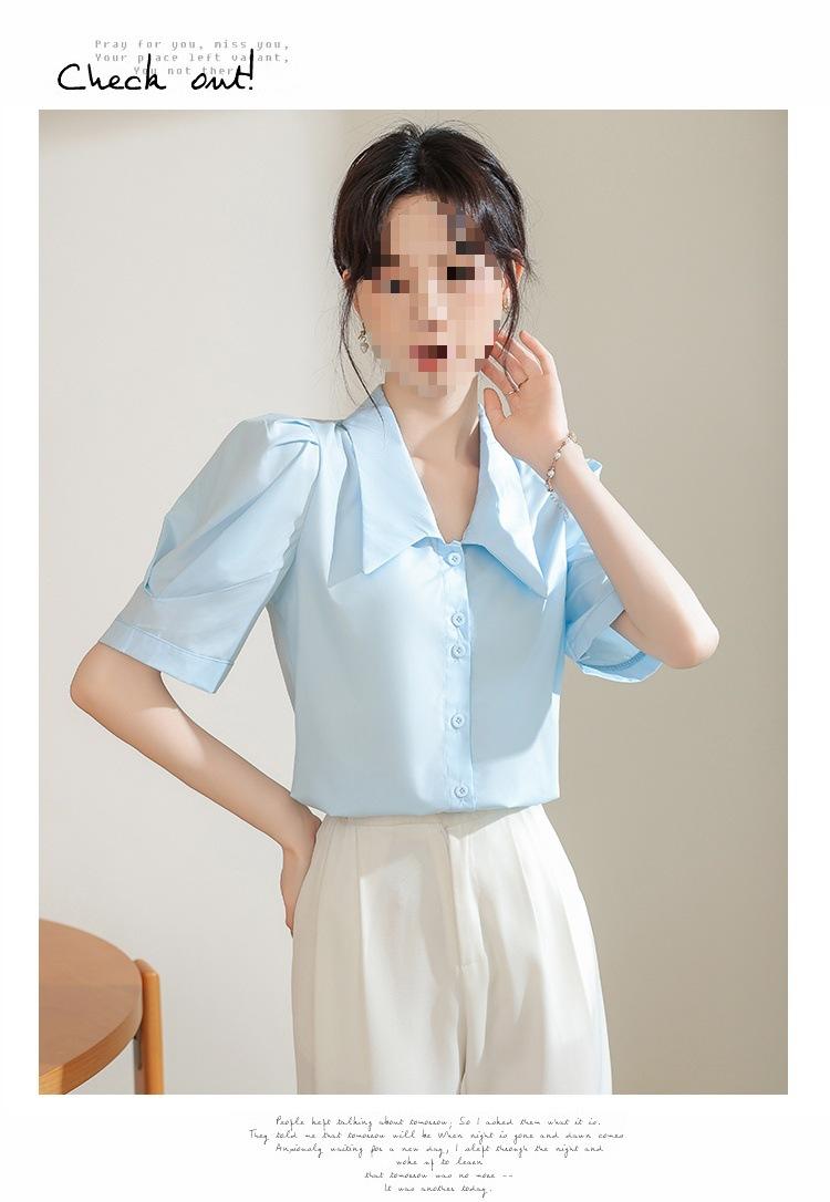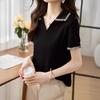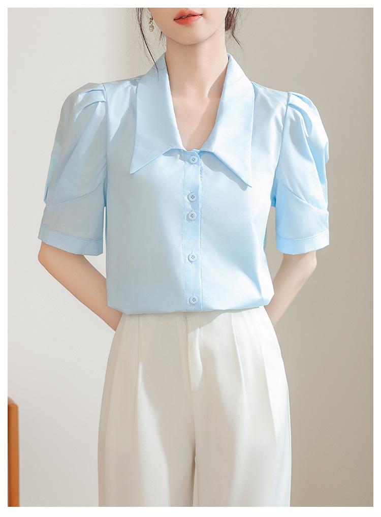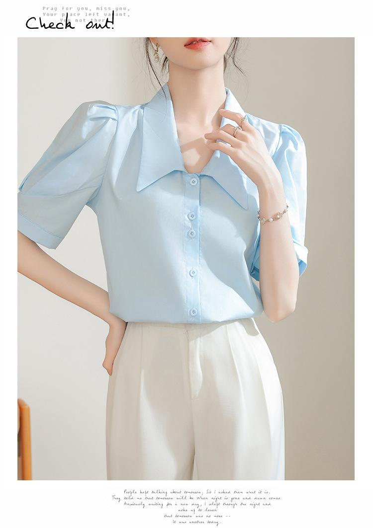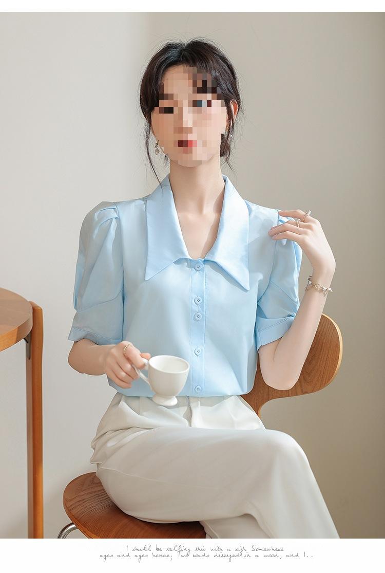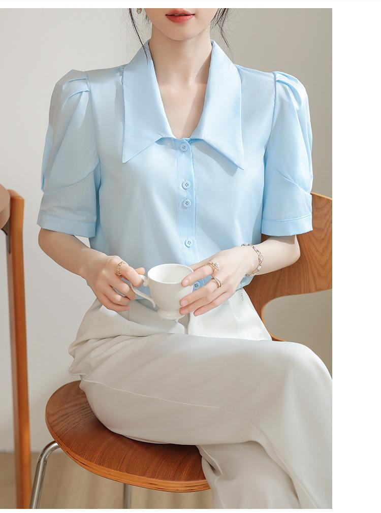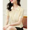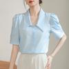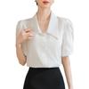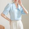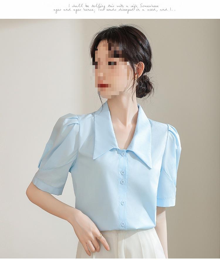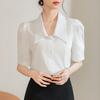 2025 Camisa Tencel Elegante Simple de Cuello de Punta Pequeño para Mujer Verano Nuevo Look Adelgazante Top de Manga Corta