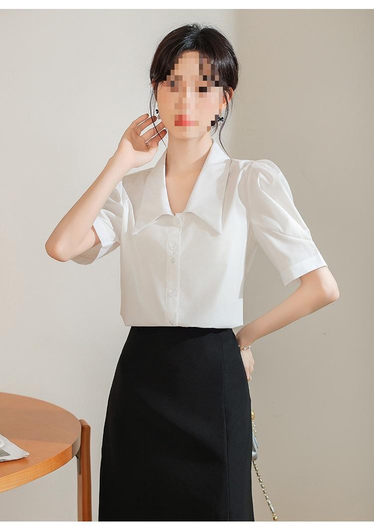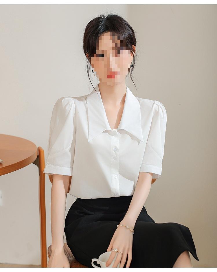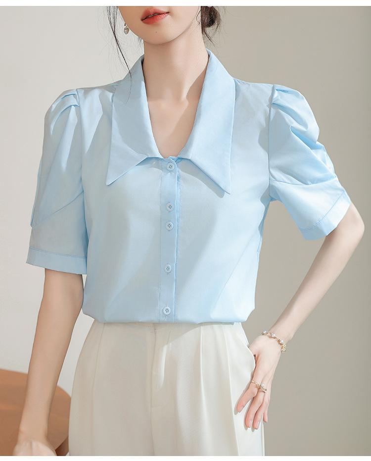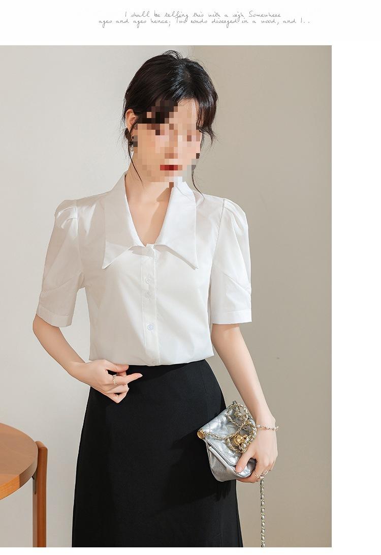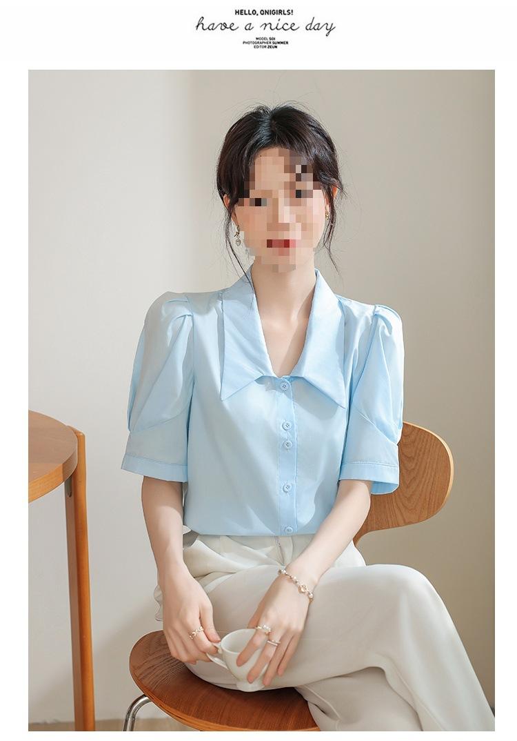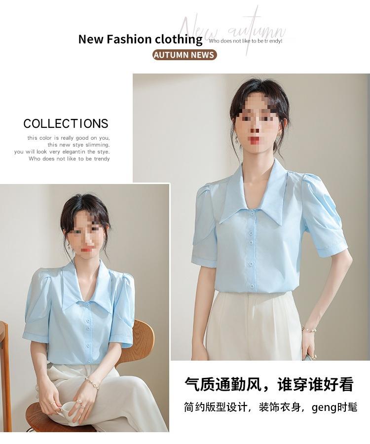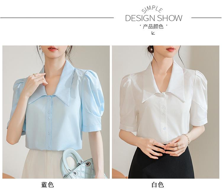 2025 Camisa Tencel Elegante Simple de Cuello de Punta Pequeño para Mujer Verano Nuevo Look Adelgazante Top de Manga Corta