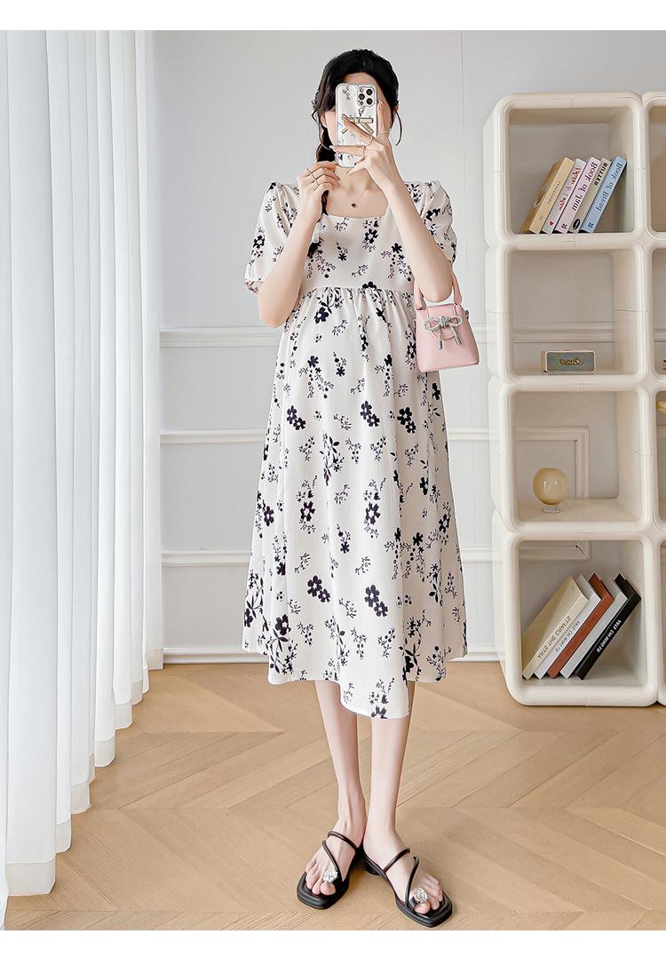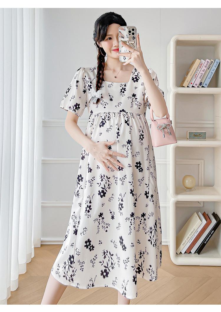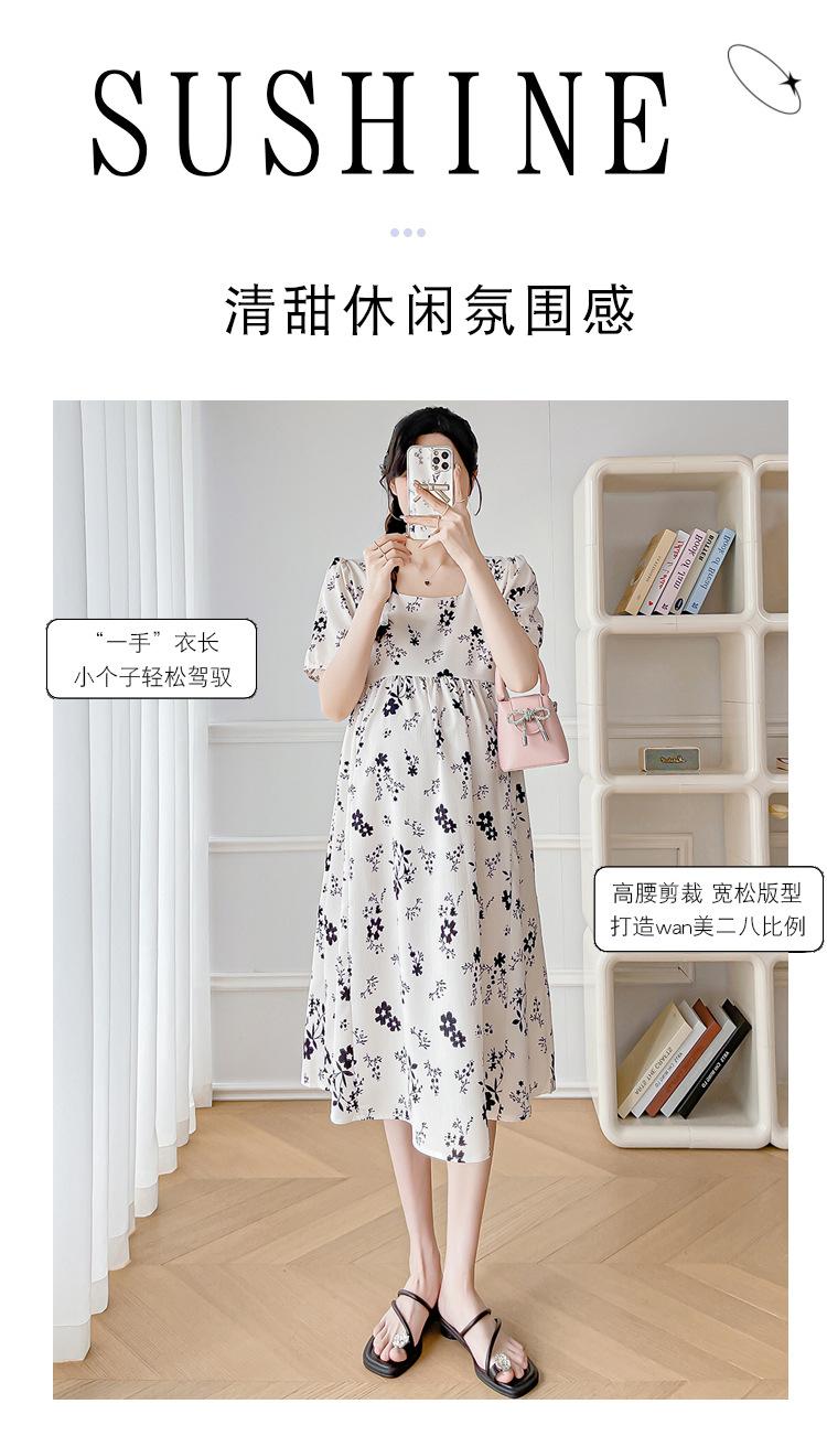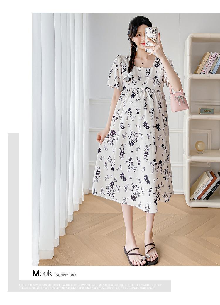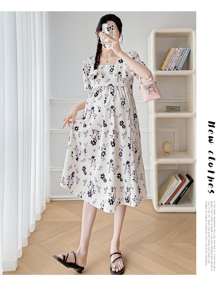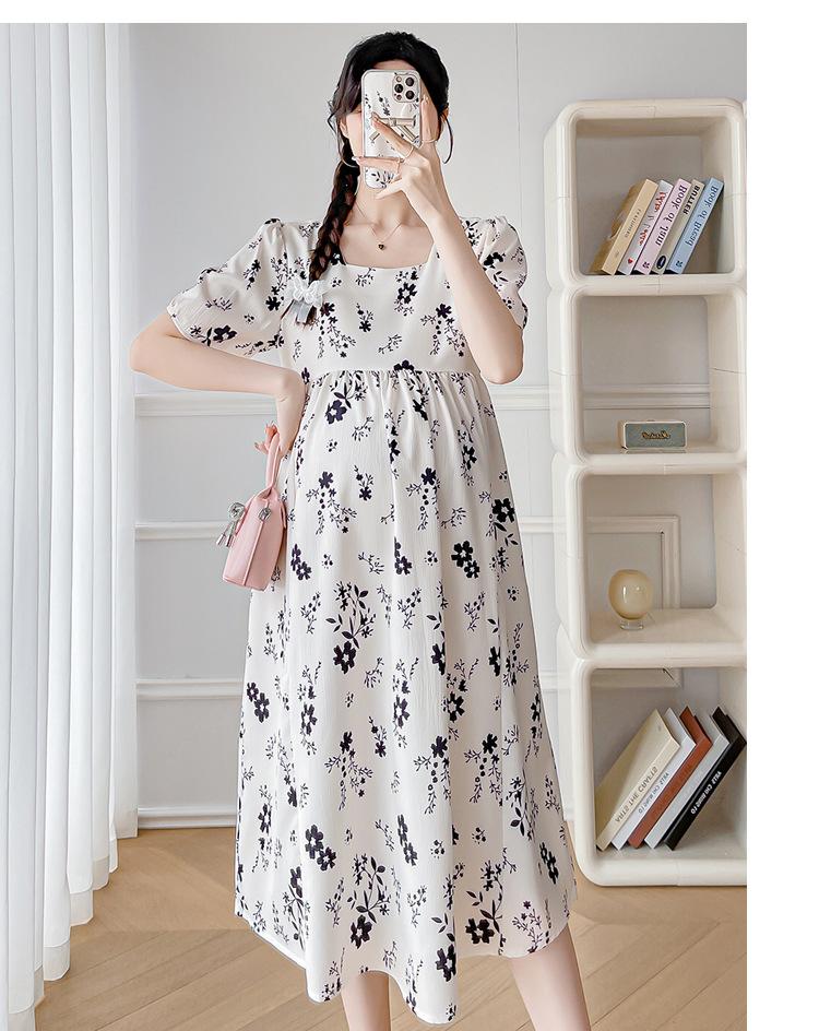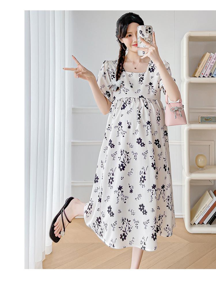 Vestido de Maternidad Verano Nuevo Dulce y a la Moda Pequeño Fresco Cuello Cuadrado Largo Medio Suelto Cubre Vientre Vestido de Maternidad