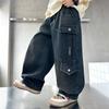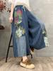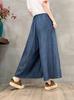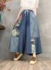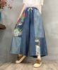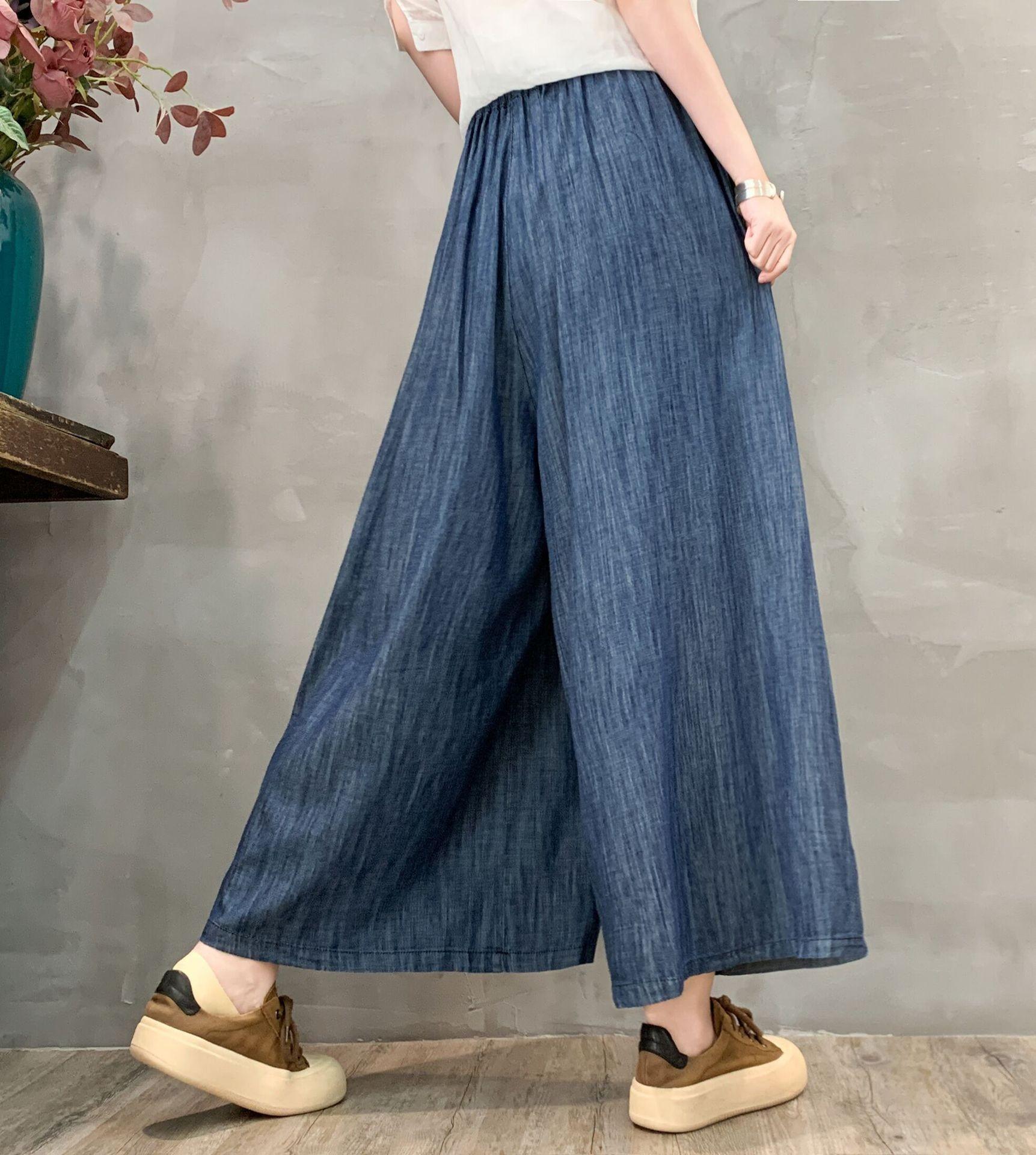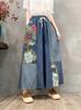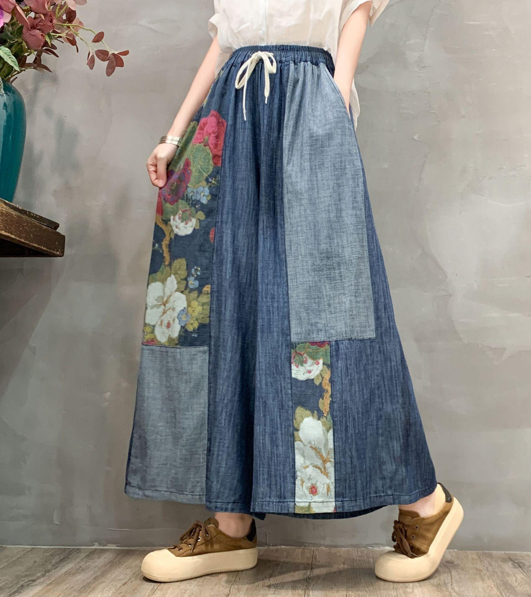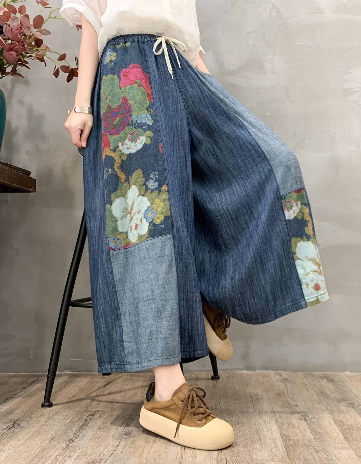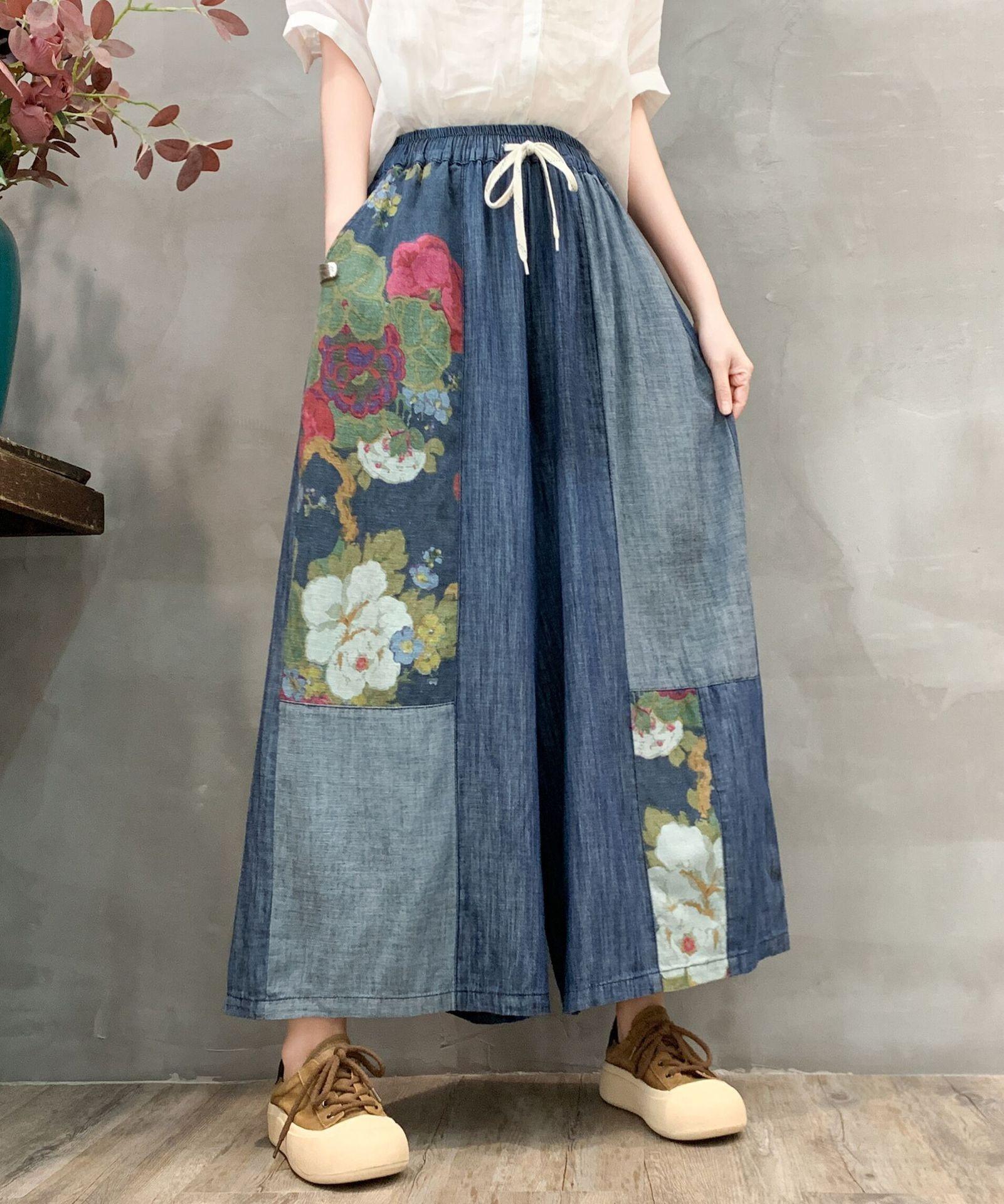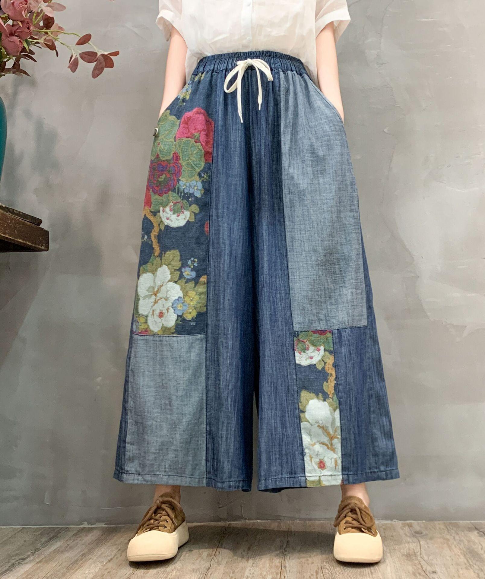 Pantalones vaqueros de pierna ancha 2025 Primavera Nuevo estilo Artístico Cintura elástica Empalmado Estampado Casual Pantalones de nueve puntos