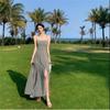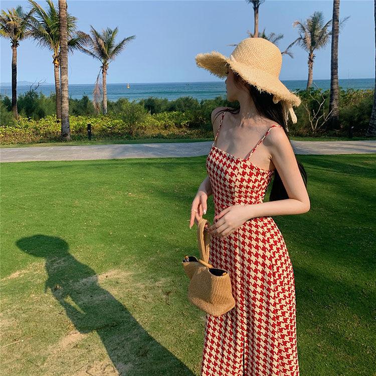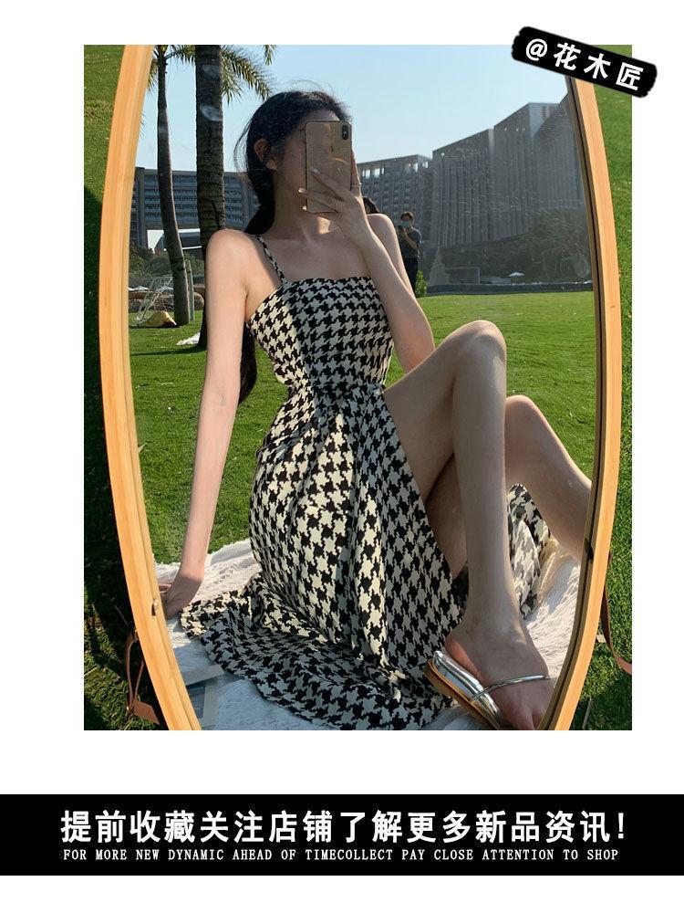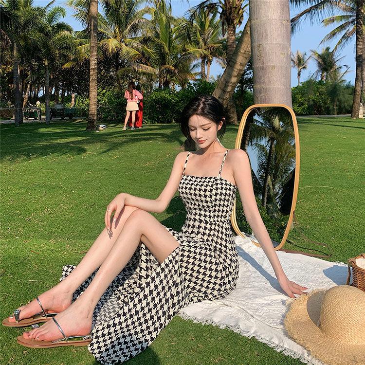 Vestido con tirantes de cuadros de pata de gallo para mujer, primavera y verano 2025, nuevo estilo, diseño de aspecto adelgazante, elegante falda larga con abertura, a la moda.