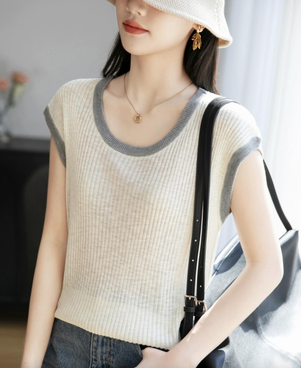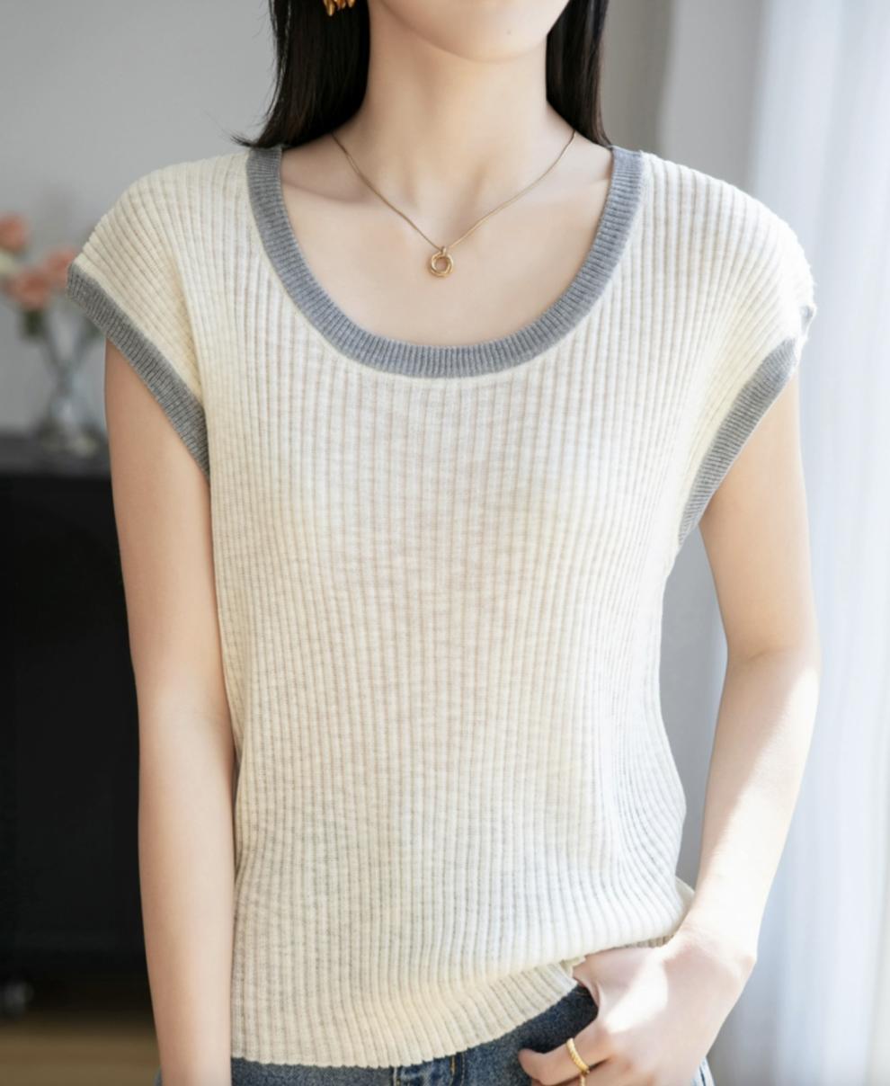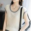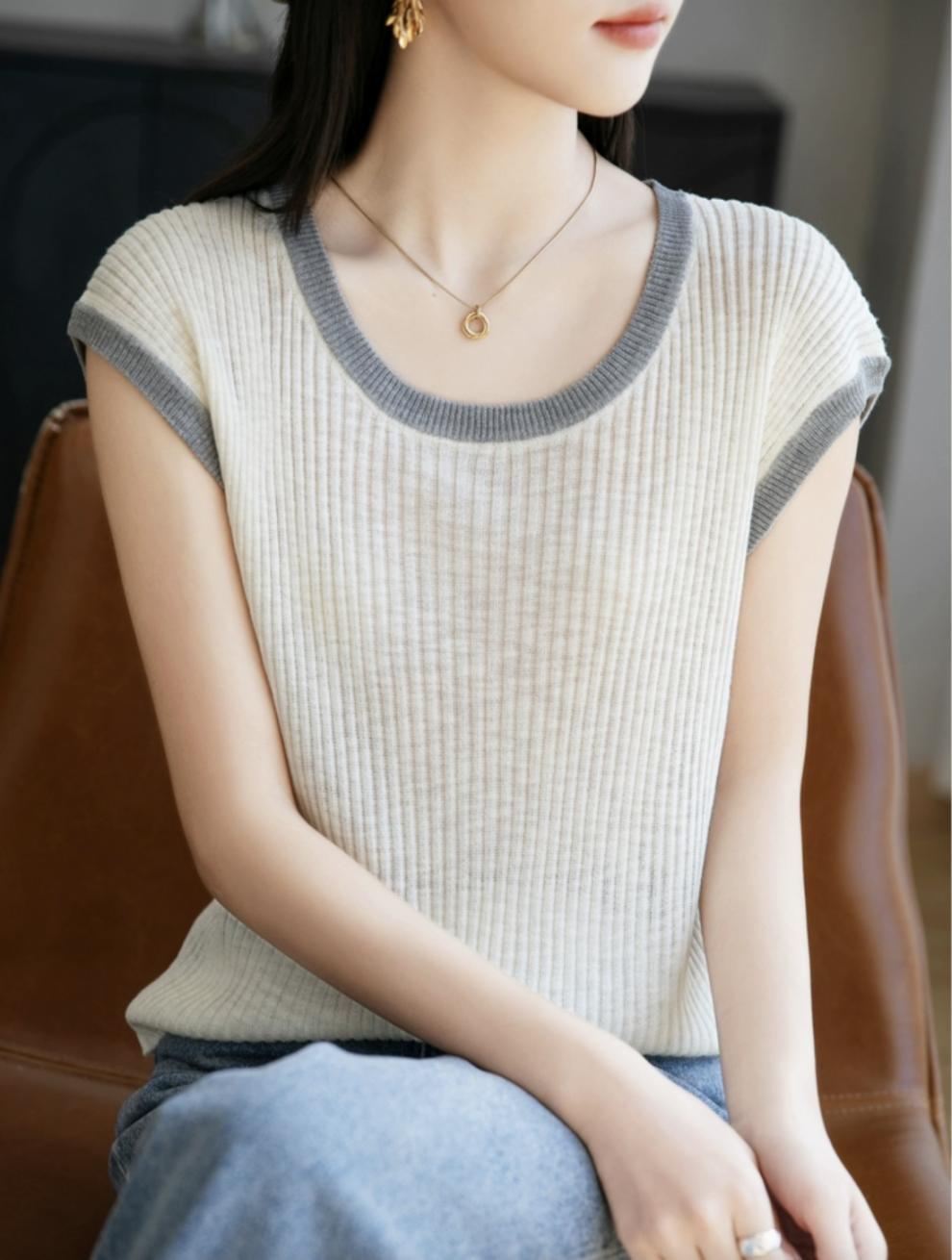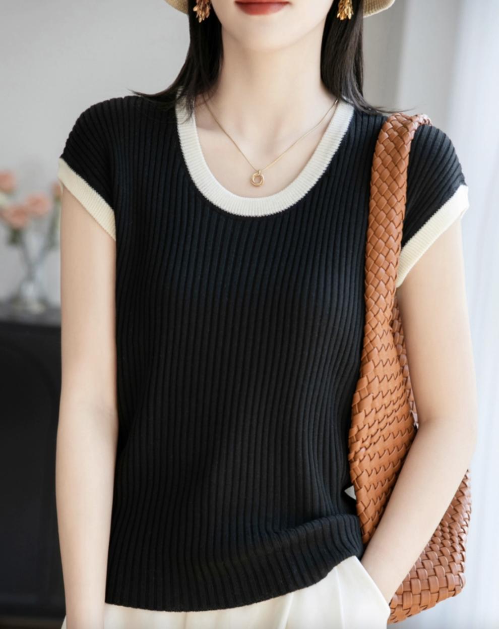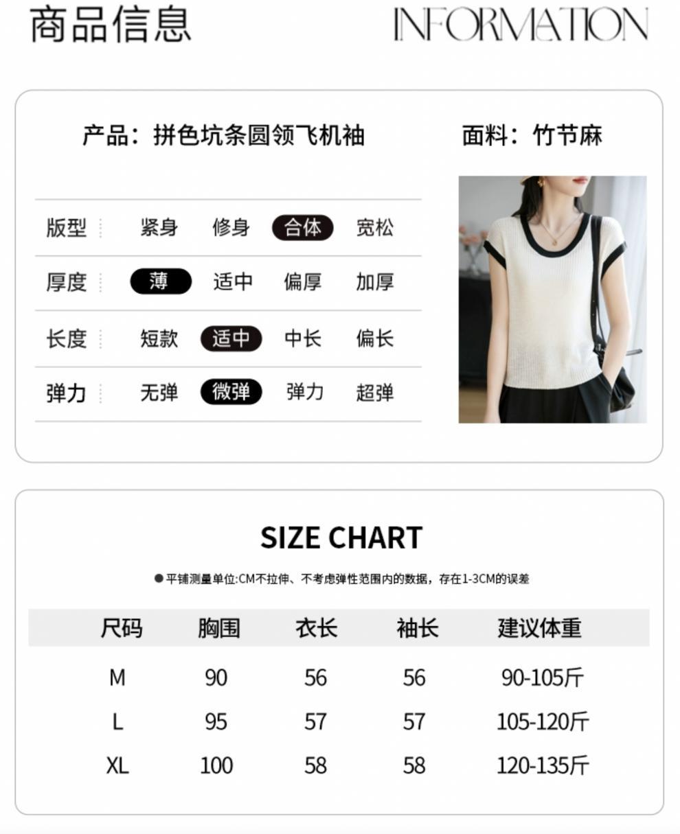 25 Verano Cuello Redondo Slub Color Contraste Chaleco sin Mangas Suéter Ajustado Casual para Mujer Top Básico de Punto Manga Volante