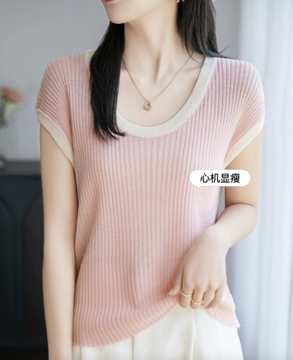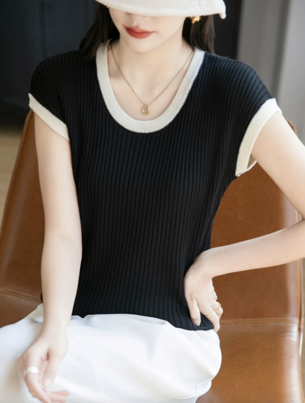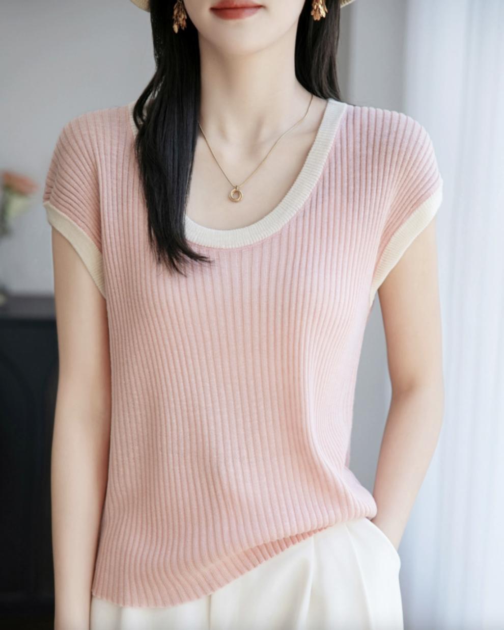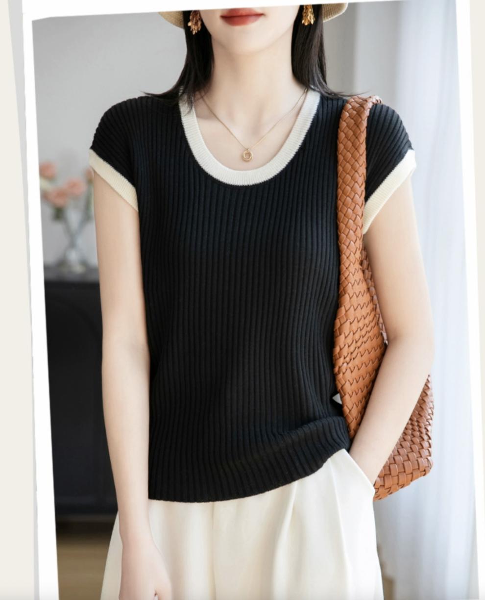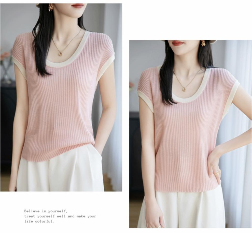 25 Verano Cuello Redondo Slub Color Contraste Chaleco sin Mangas Suéter Ajustado Casual para Mujer Top Básico de Punto Manga Volante