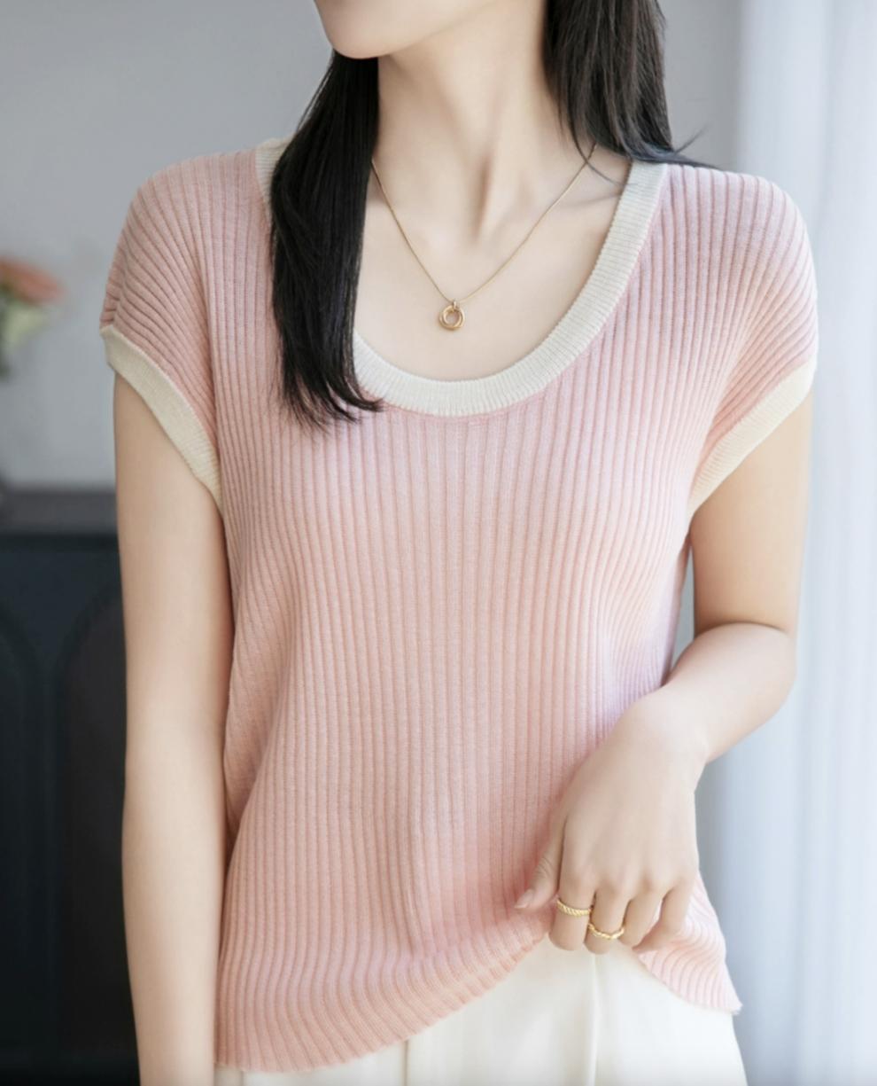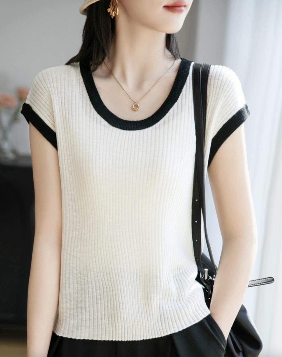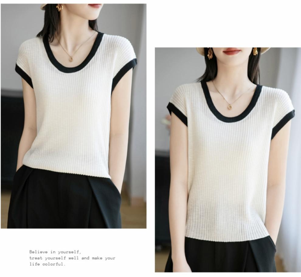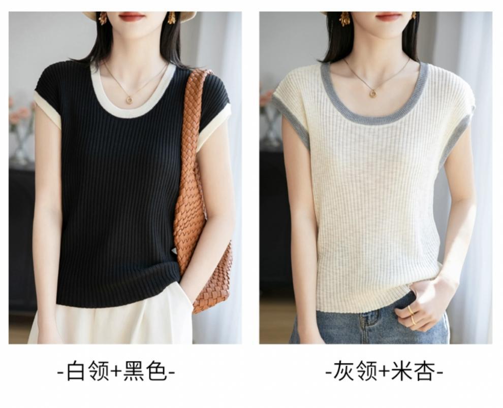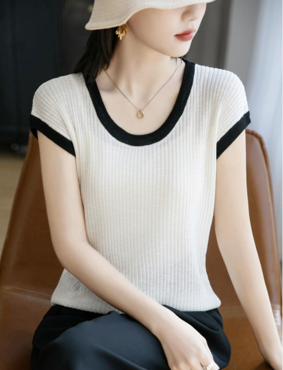 25 Verano Cuello Redondo Slub Color Contraste Chaleco sin Mangas Suéter Ajustado Casual para Mujer Top Básico de Punto Manga Volante