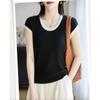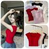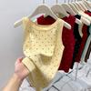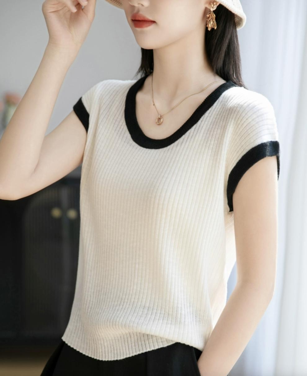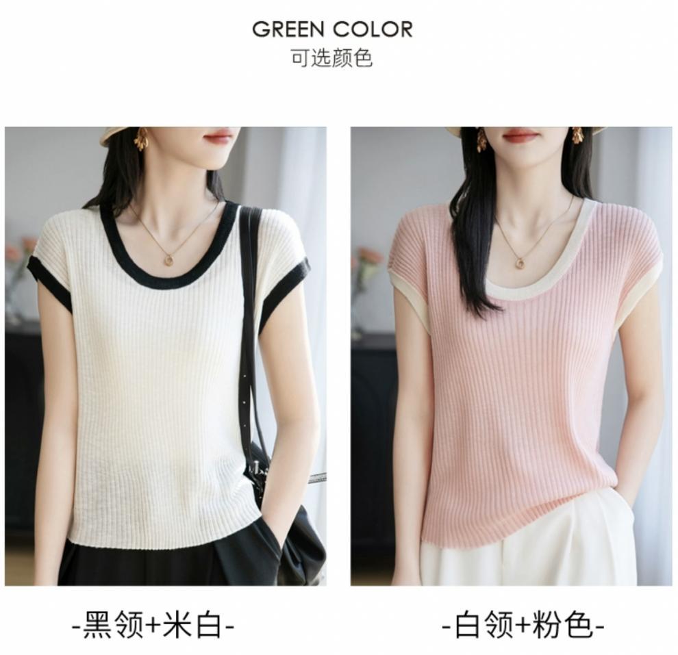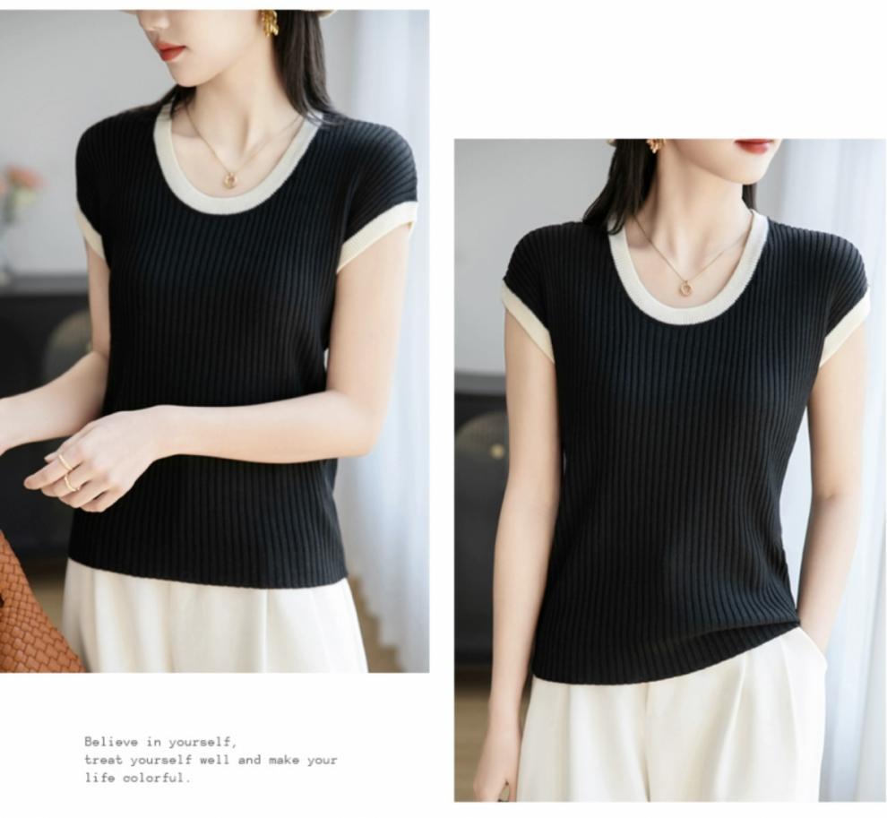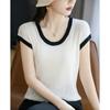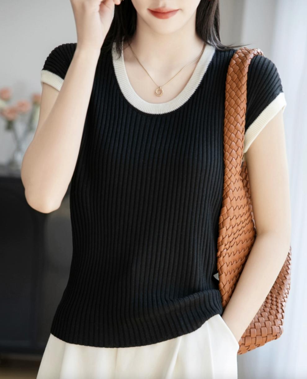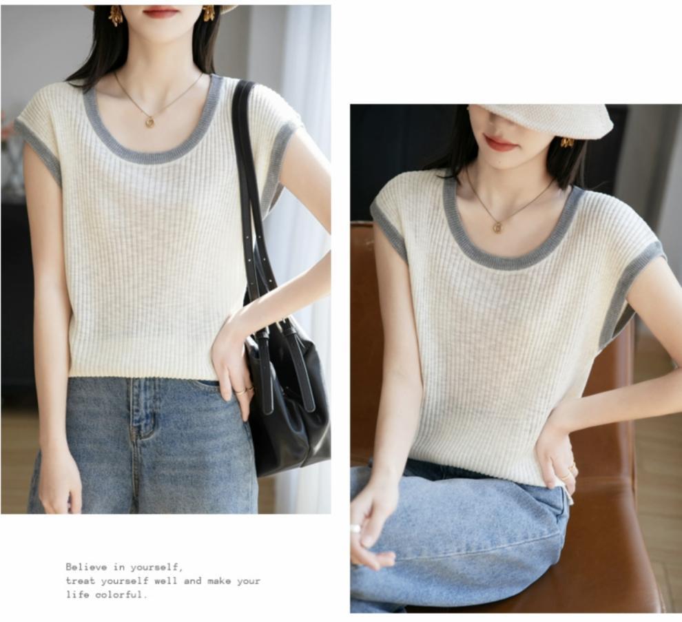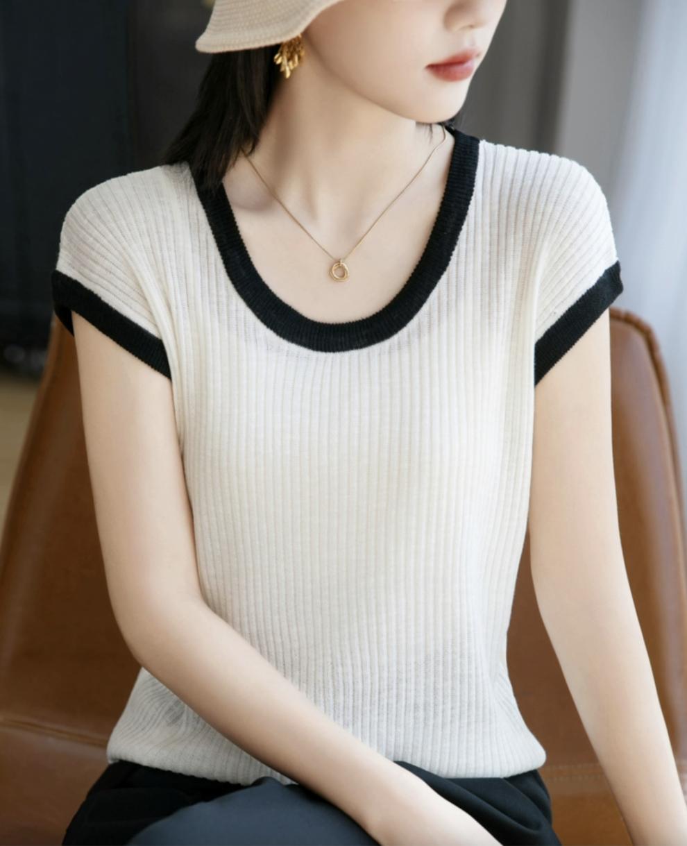 25 Verano Cuello Redondo Slub Color Contraste Chaleco sin Mangas Suéter Ajustado Casual para Mujer Top Básico de Punto Manga Volante