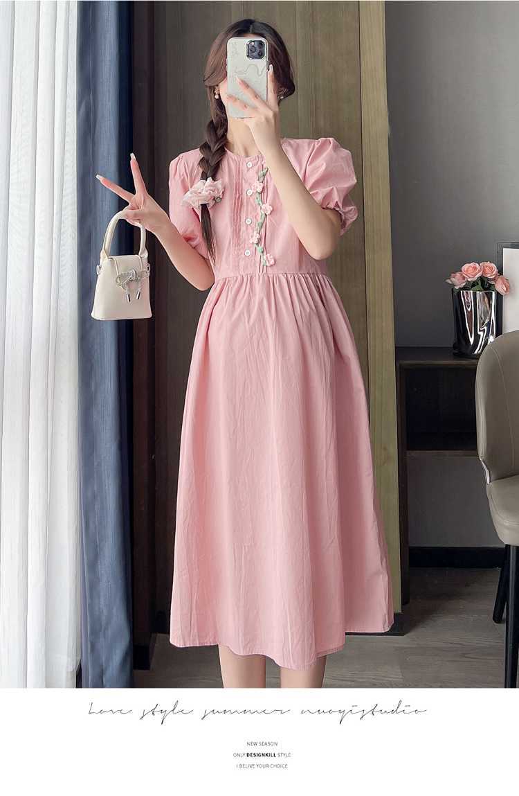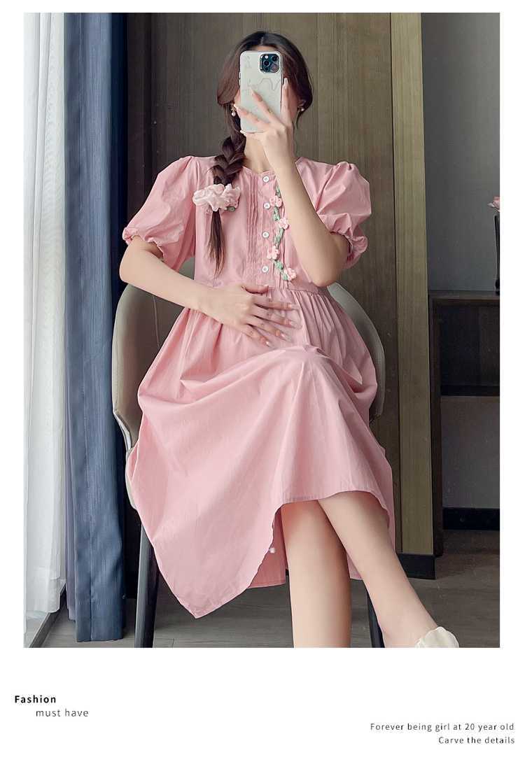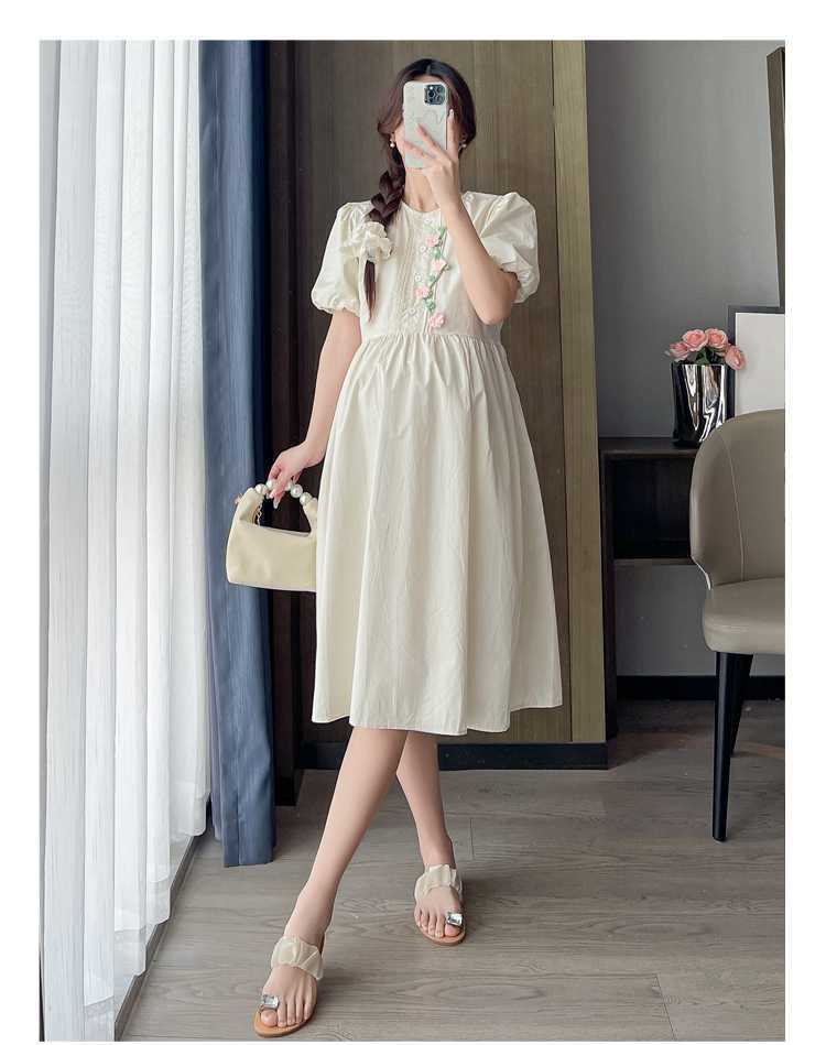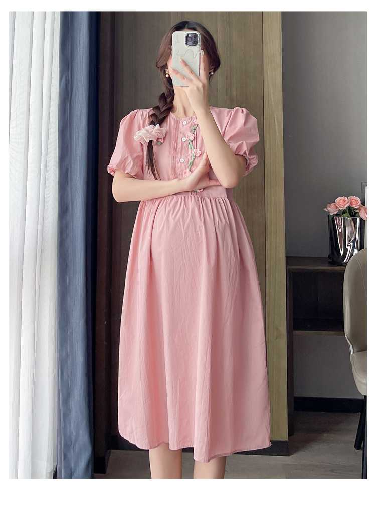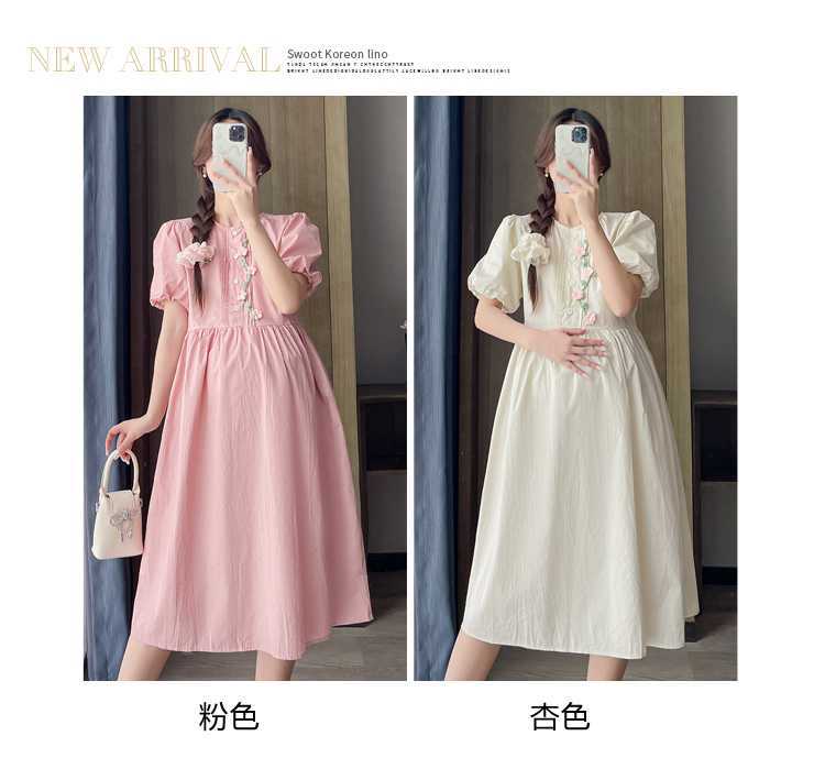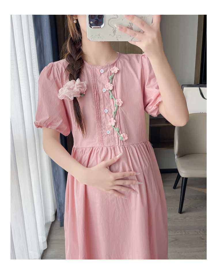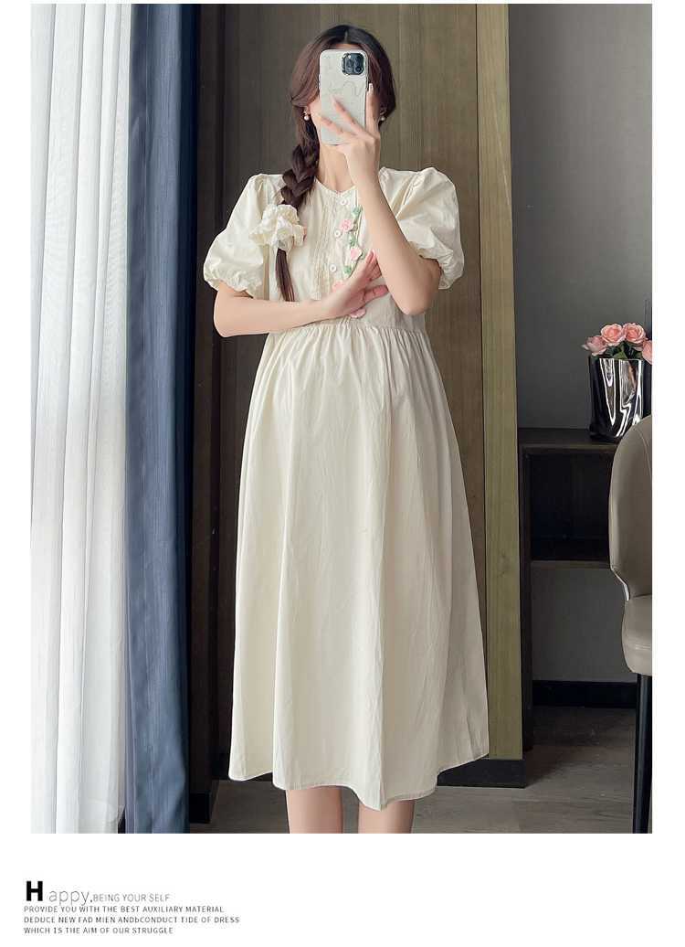 Vestido de verano de moda para embarazadas 2024, nuevo estilo, de algodón y lino, con crochet dulce, cintura alta y mangas abullonadas.