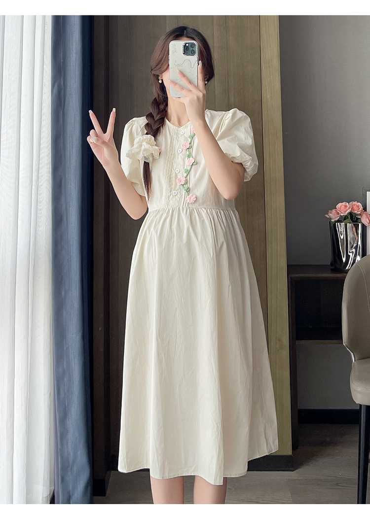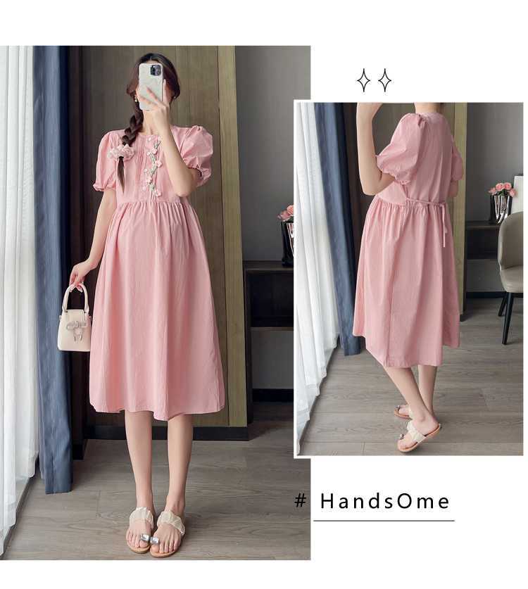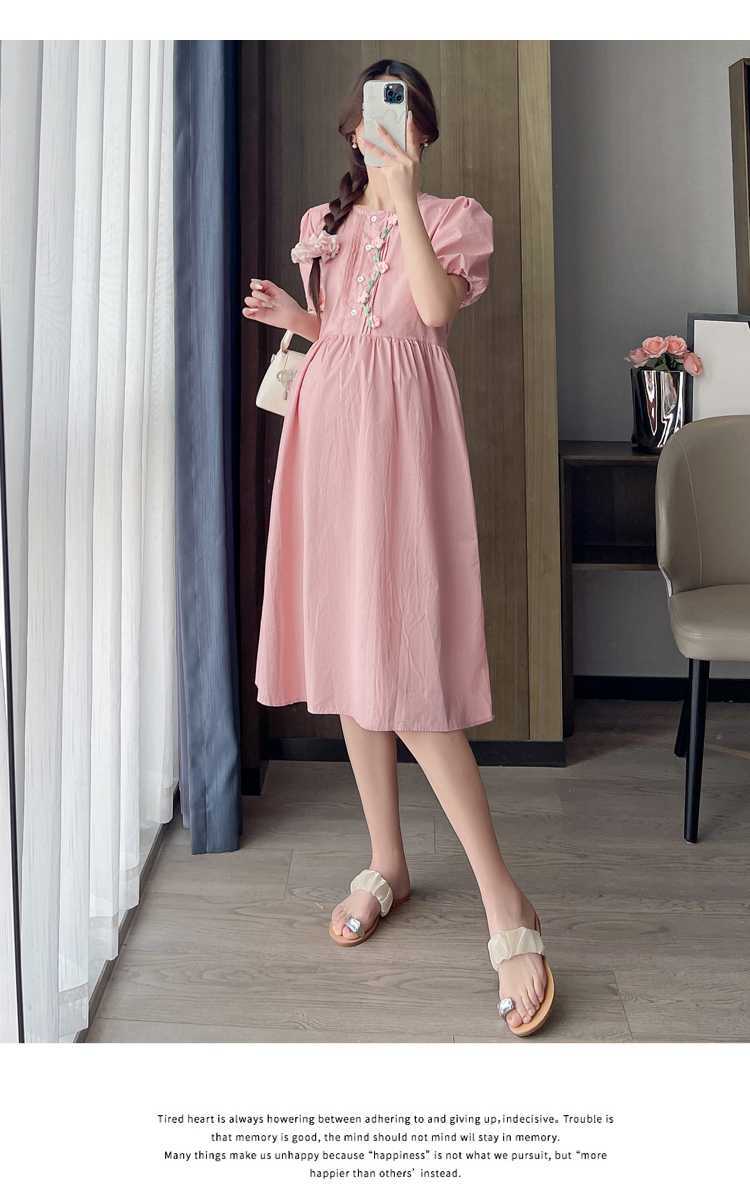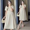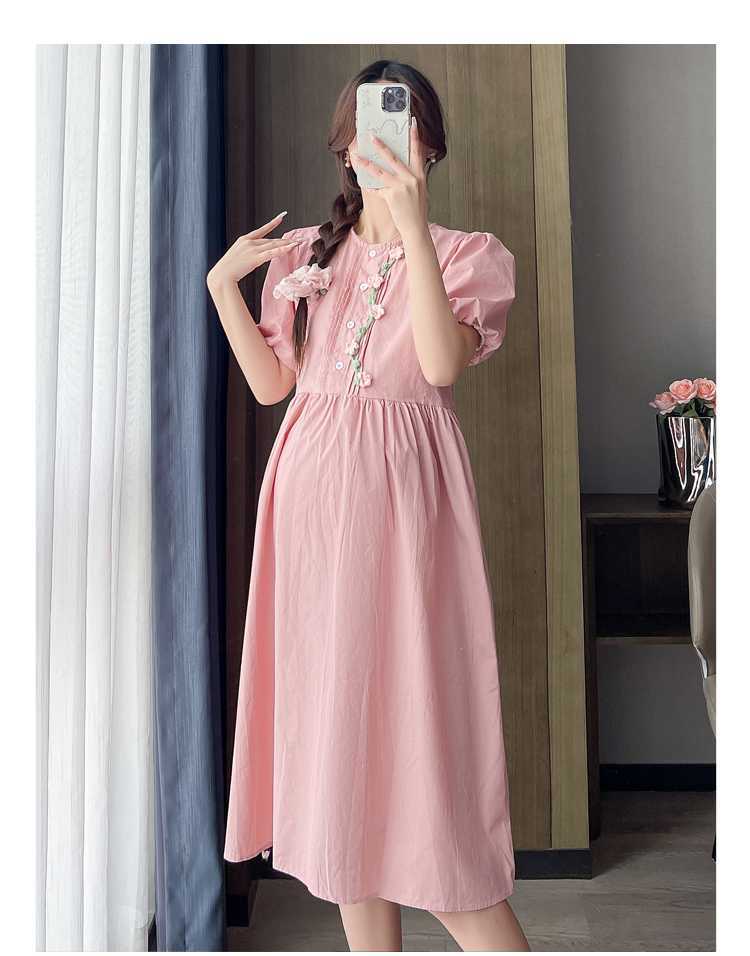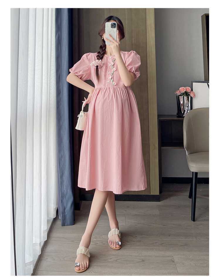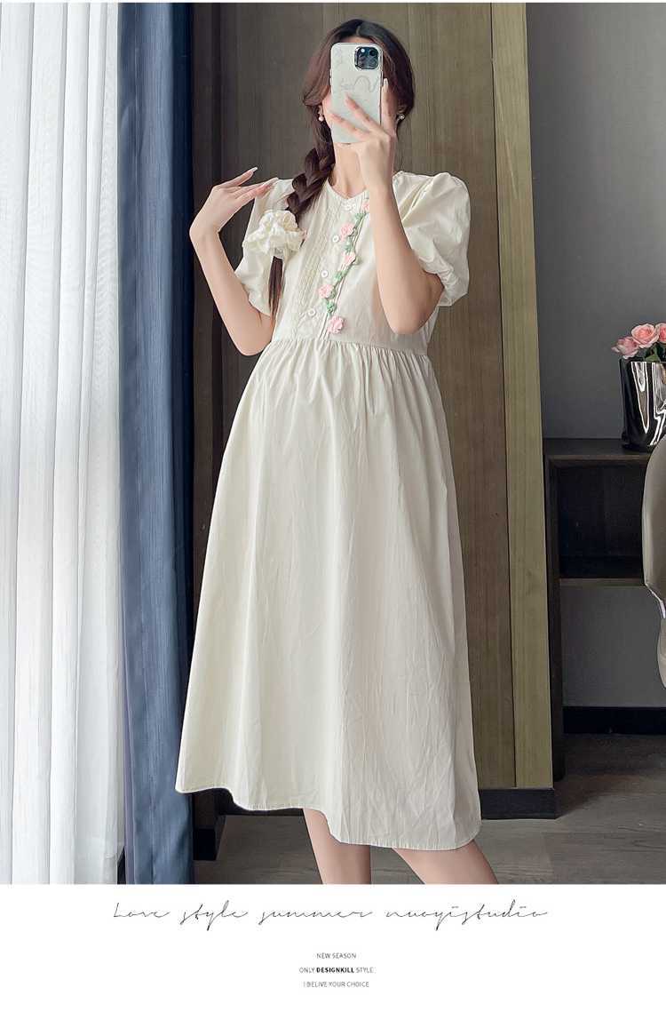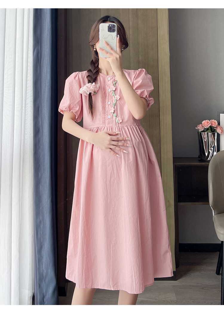 Vestido de verano de moda para embarazadas 2024, nuevo estilo, de algodón y lino, con crochet dulce, cintura alta y mangas abullonadas.