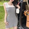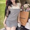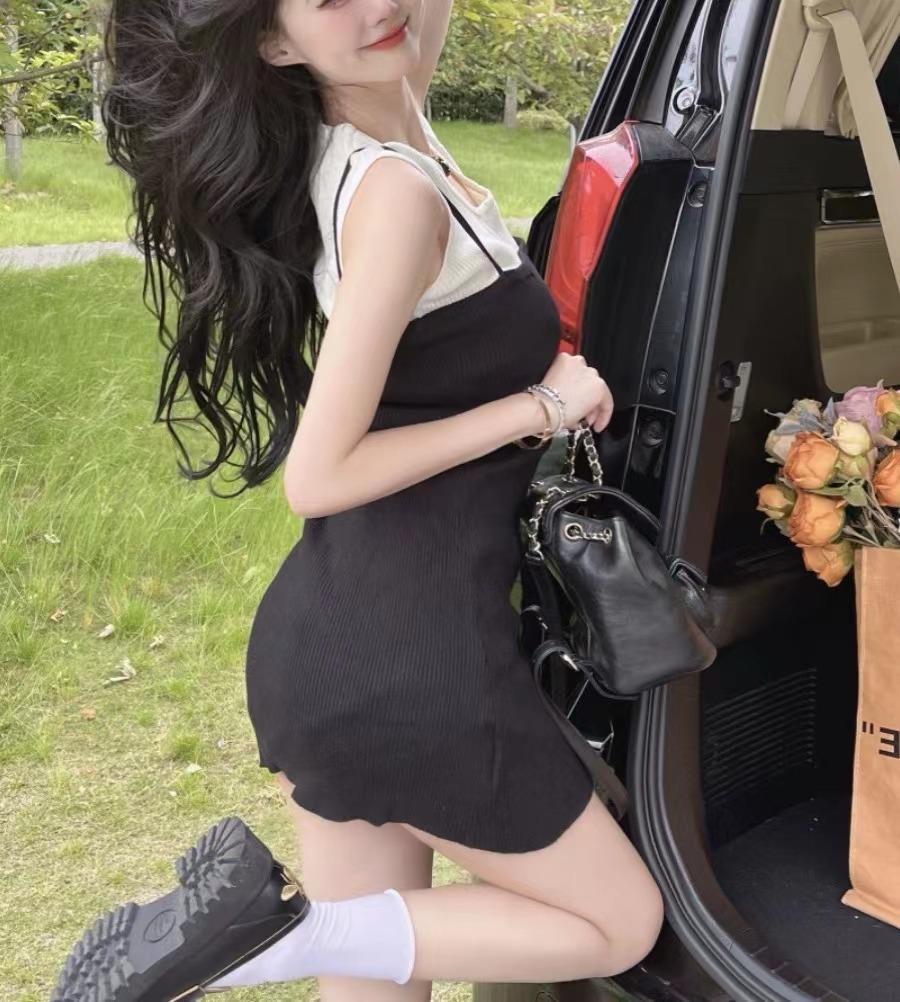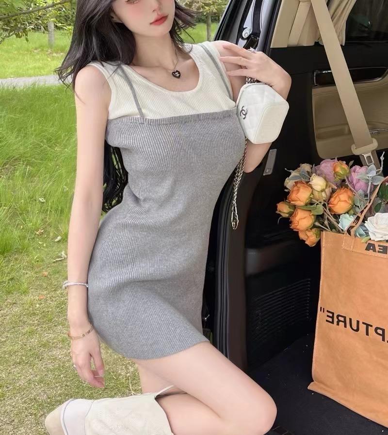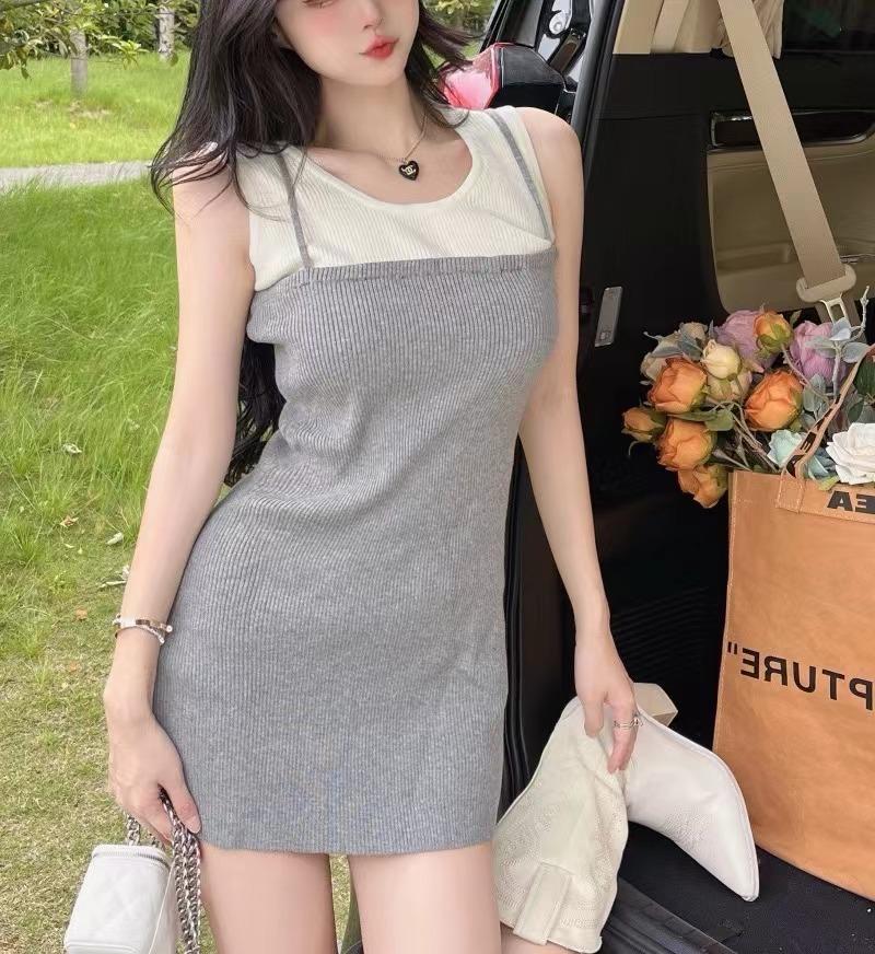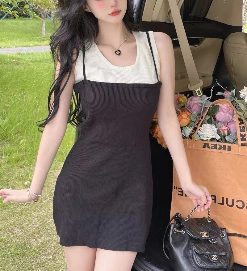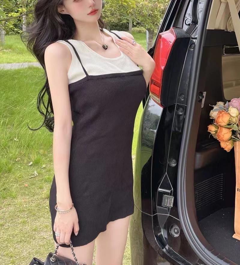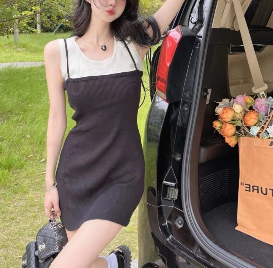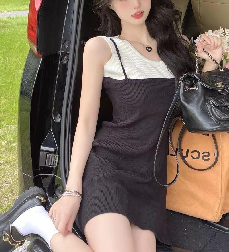 Falda de tirantes de dos piezas falsa de alta calidad, estilo maduro ligero para mujer, vestido sin mangas elástico de color en contraste de temperamento dulce de verano nuevo