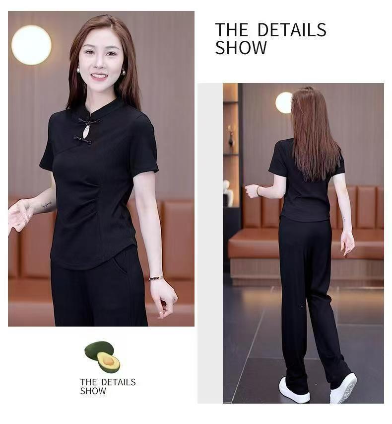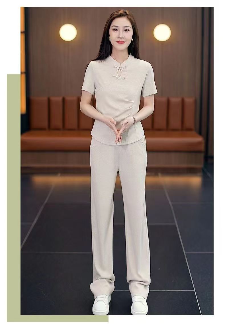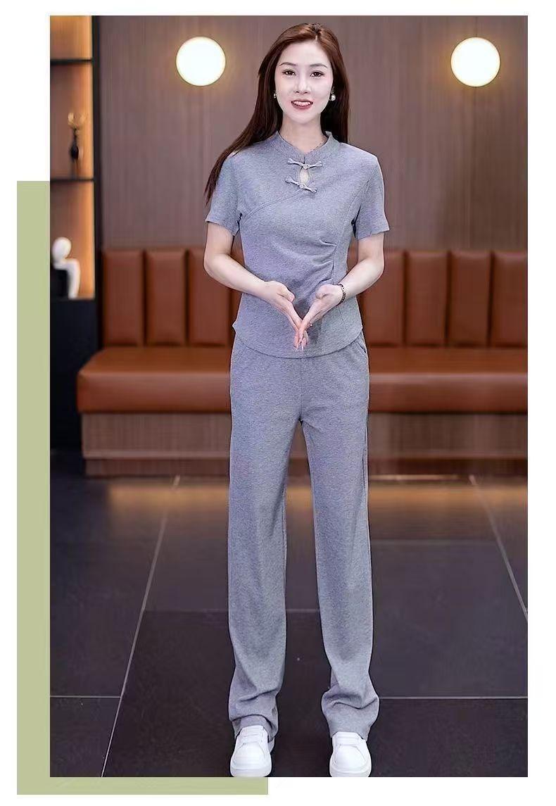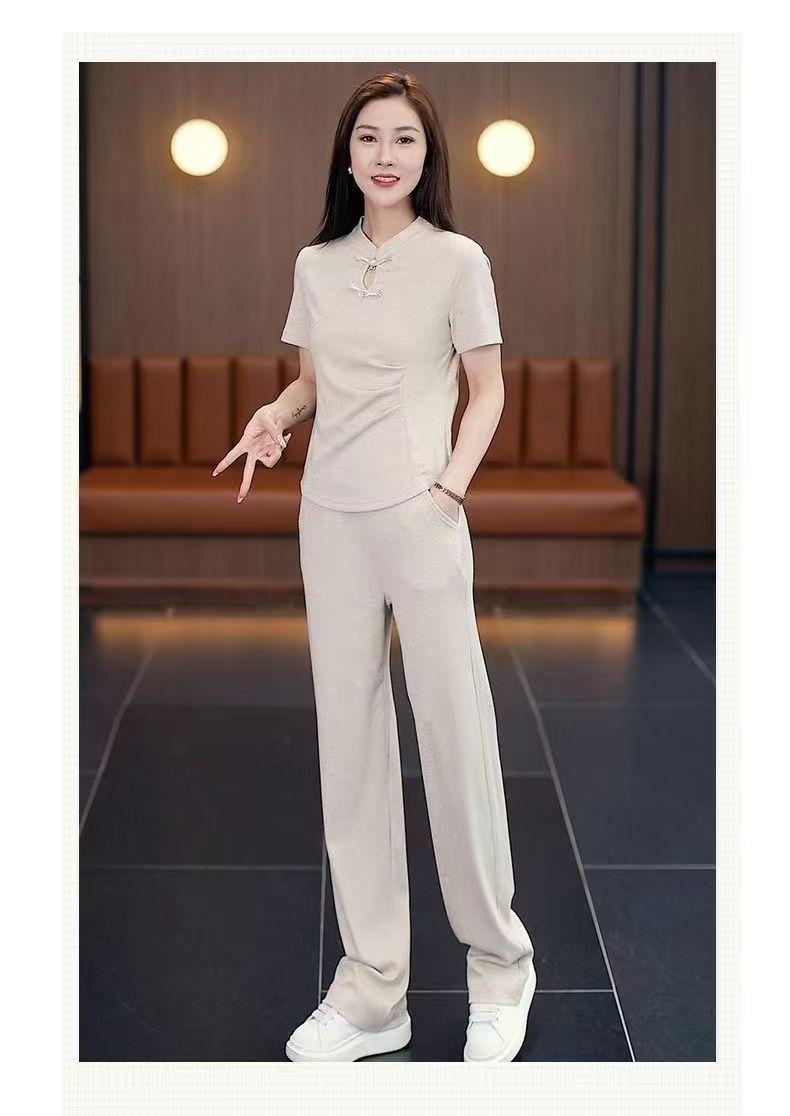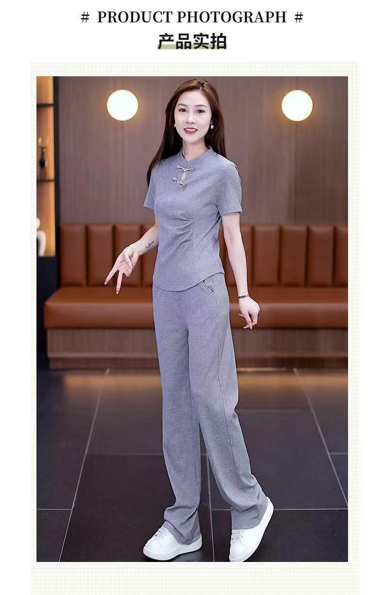 Traje deportivo de ocio de verano 2025 para mujer, manga corta, estilo chino nuevo, estilo nacional, top con hebilla, pantalones de pierna ancha, conjunto de dos piezas para comercio exterior