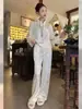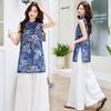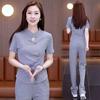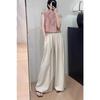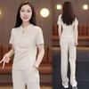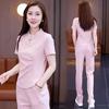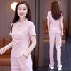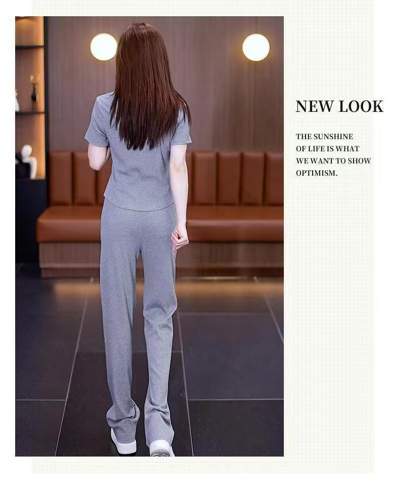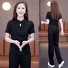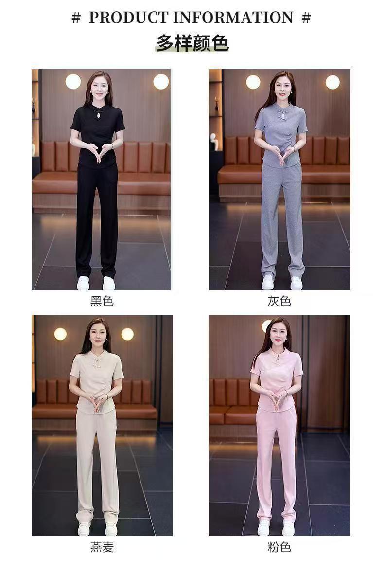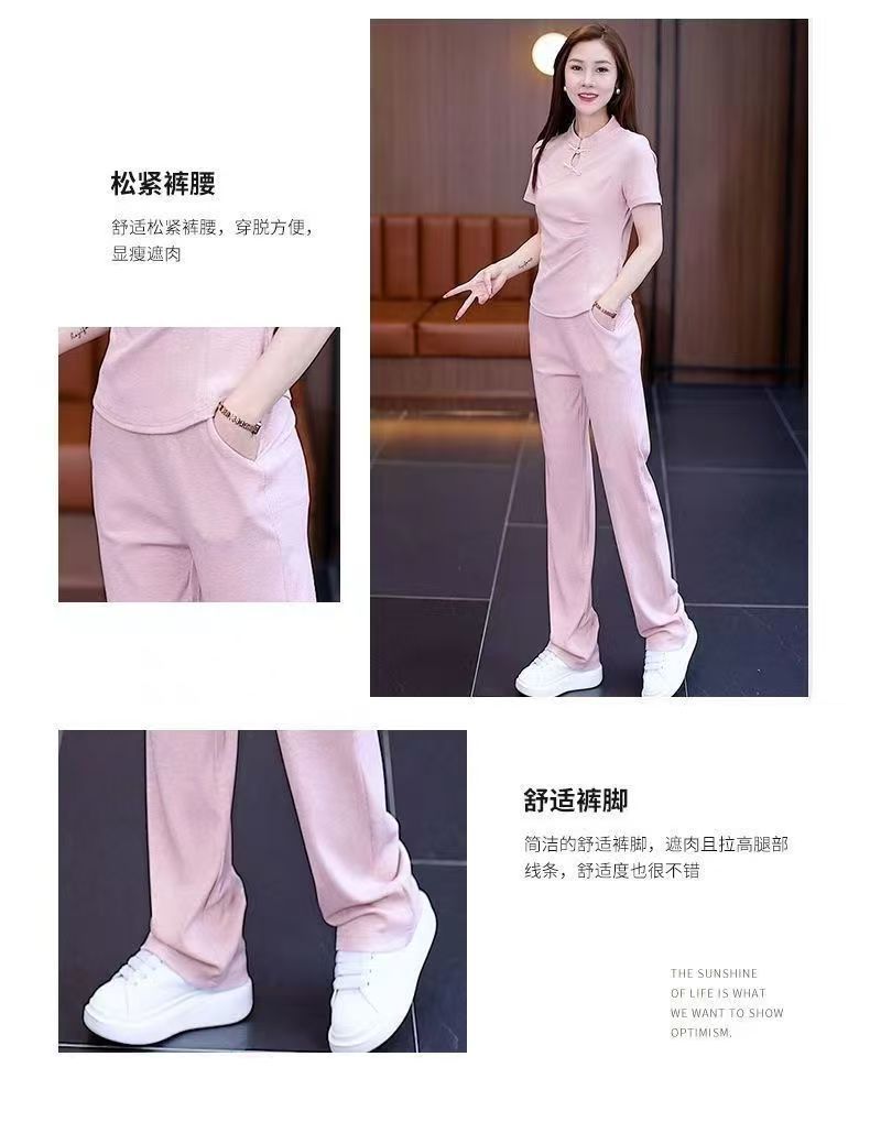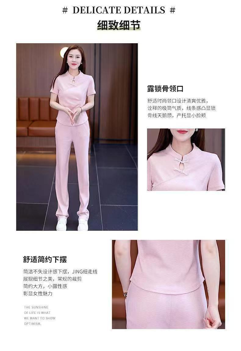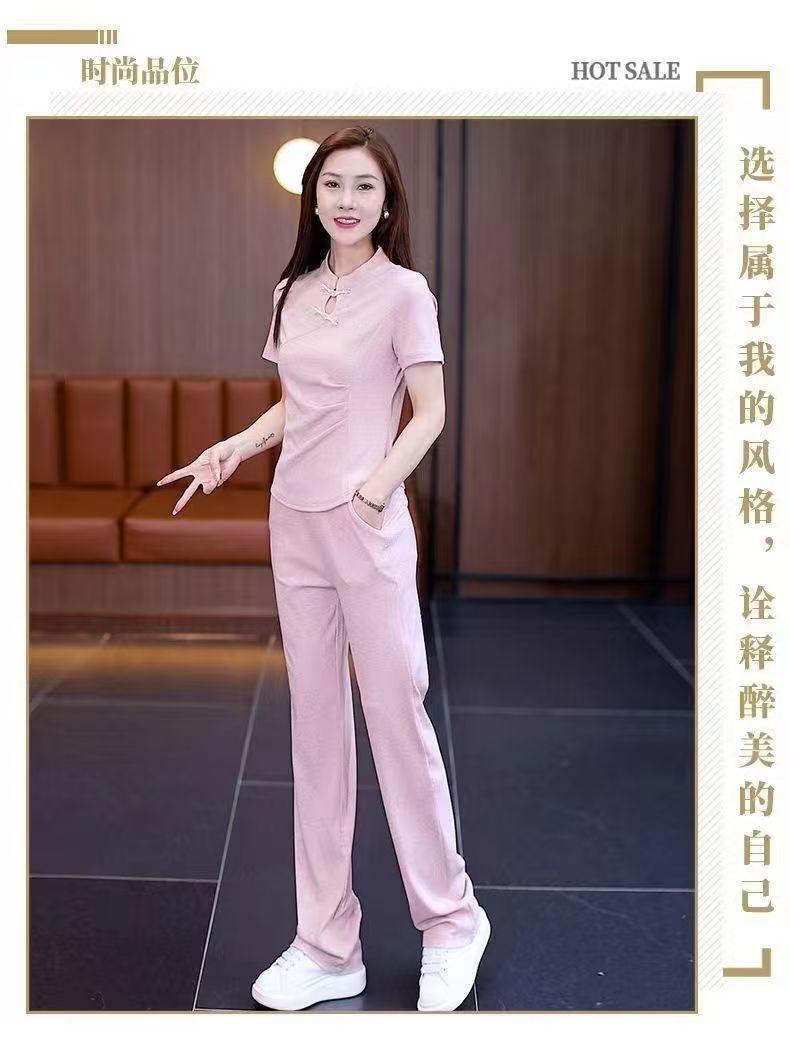 Traje deportivo de ocio de verano 2025 para mujer, manga corta, estilo chino nuevo, estilo nacional, top con hebilla, pantalones de pierna ancha, conjunto de dos piezas para comercio exterior