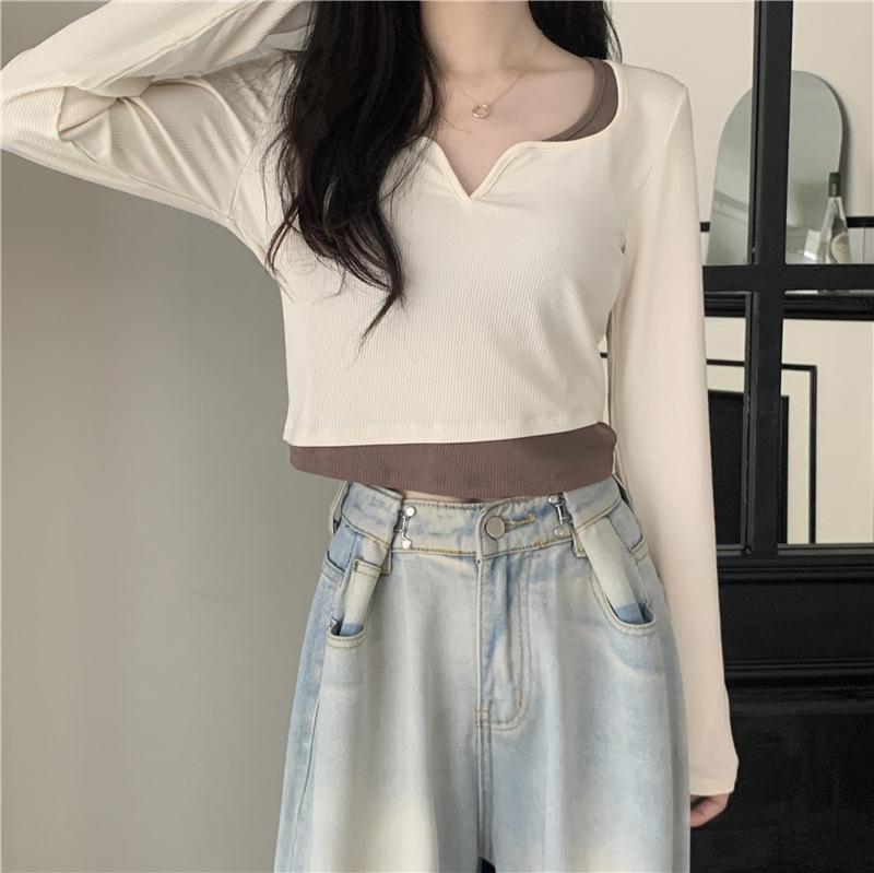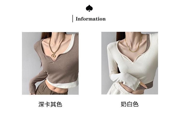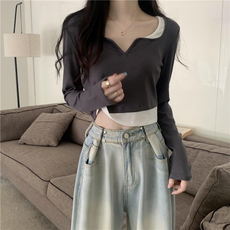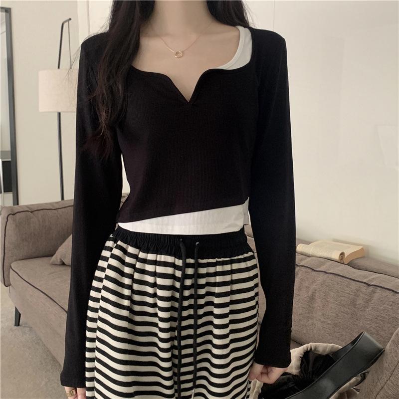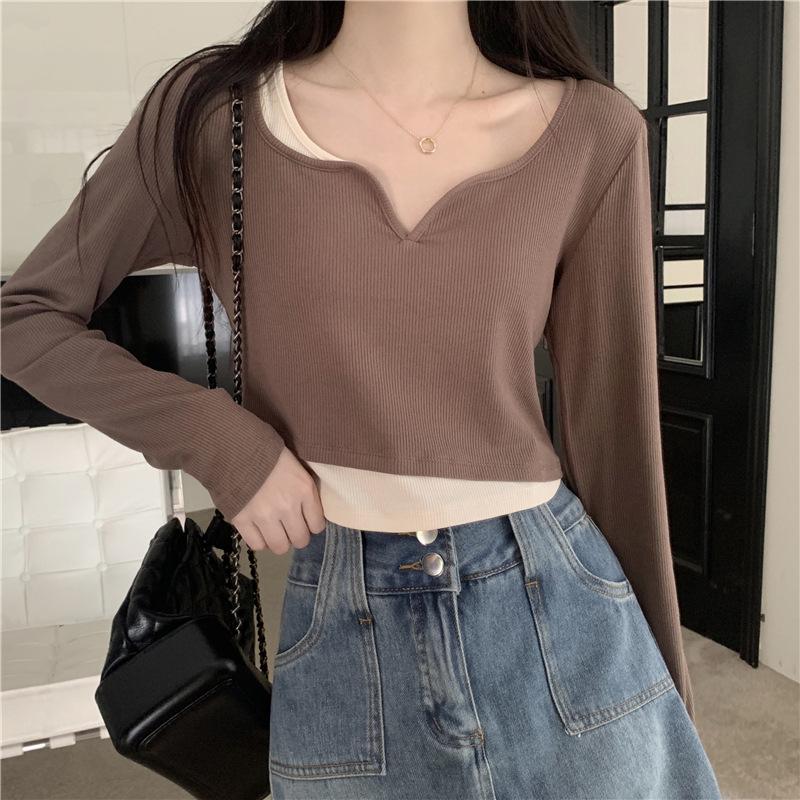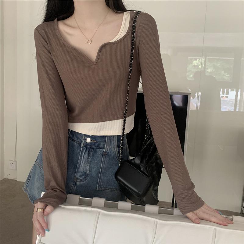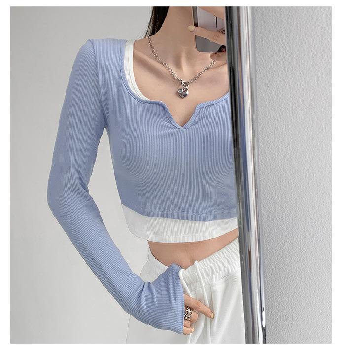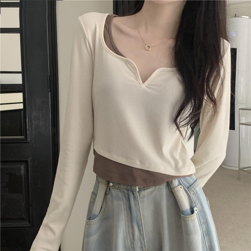 Camiseta de manga larga con cuello en V y diseño falso de dos piezas para chica sexy y sexy, de nicho, para mujer, de primavera y otoño, ajustada y adelgazante.