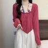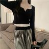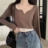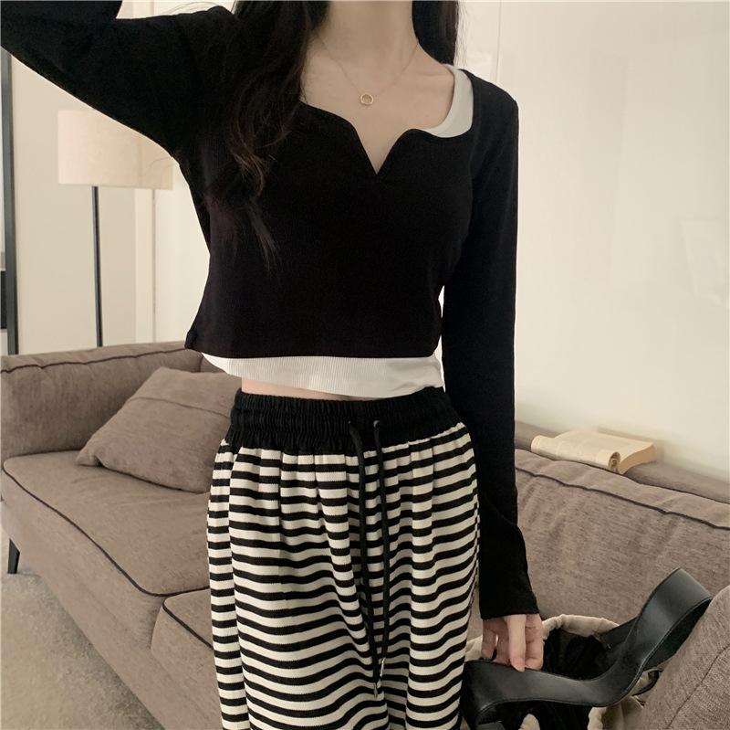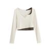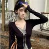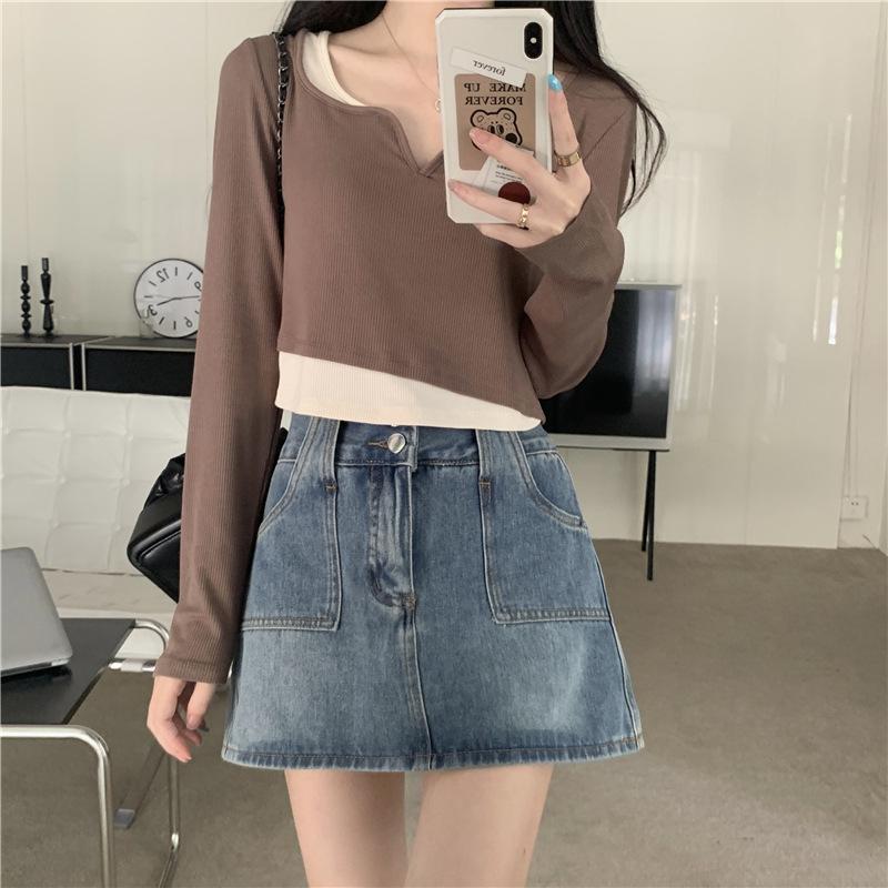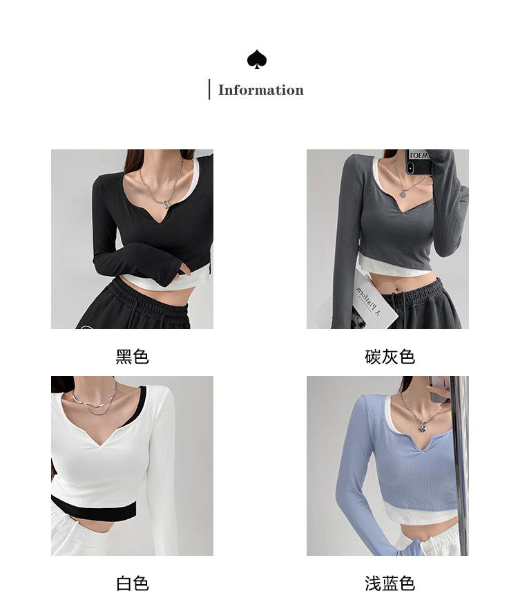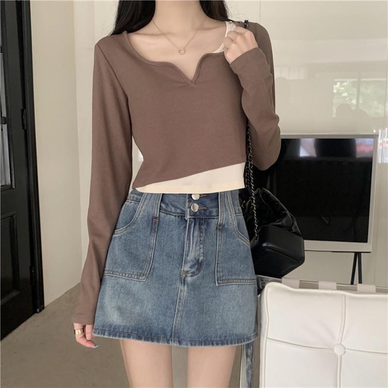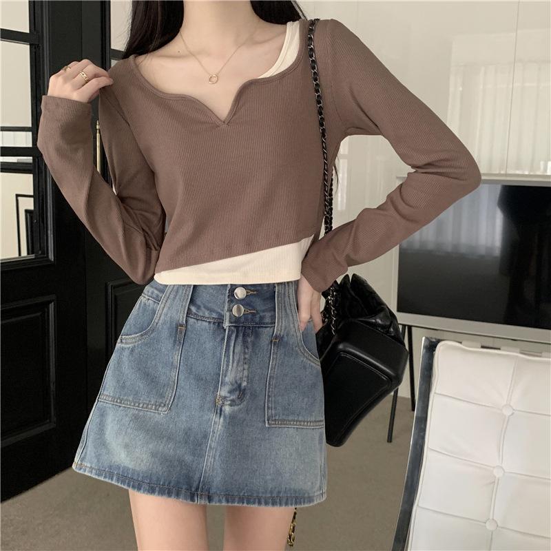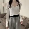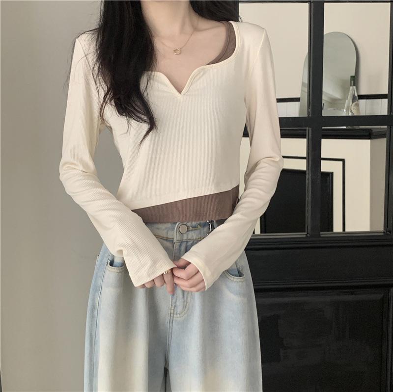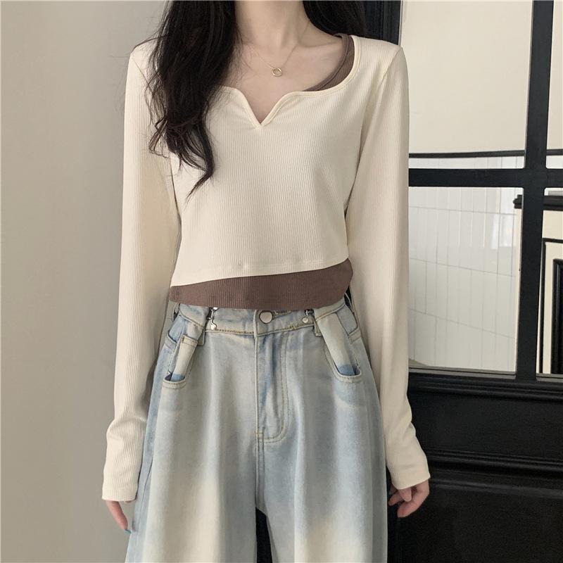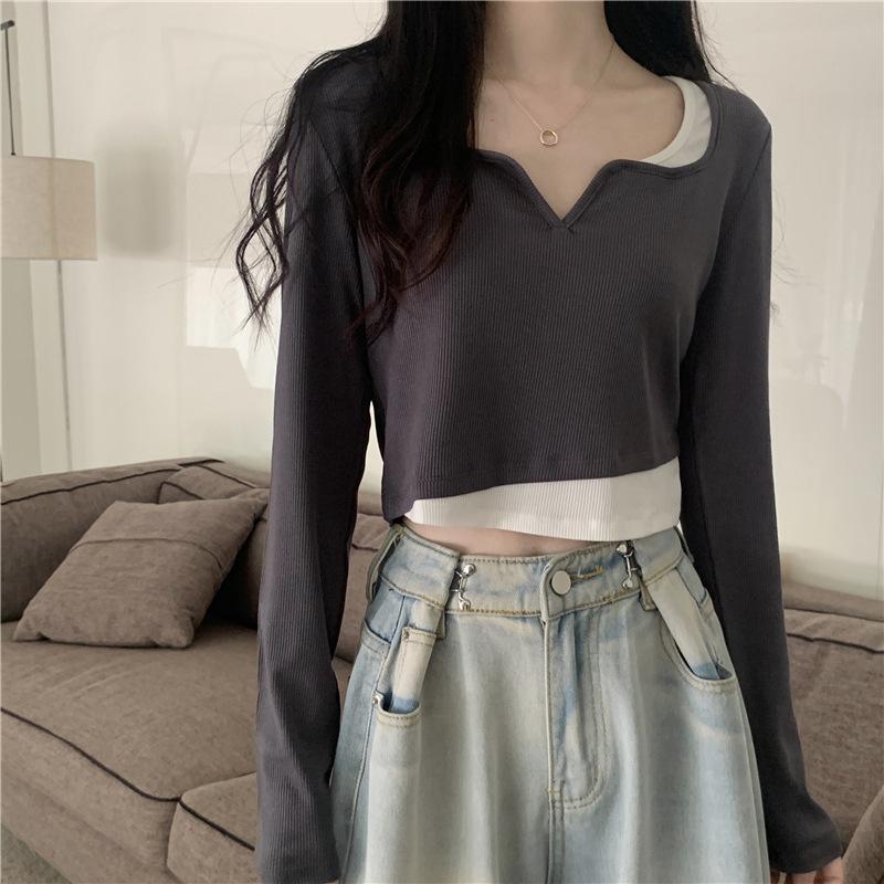 Camiseta de manga larga con cuello en V y diseño falso de dos piezas para chica sexy y sexy, de nicho, para mujer, de primavera y otoño, ajustada y adelgazante.