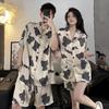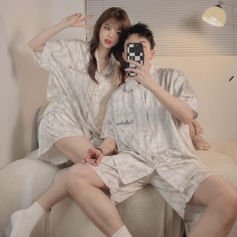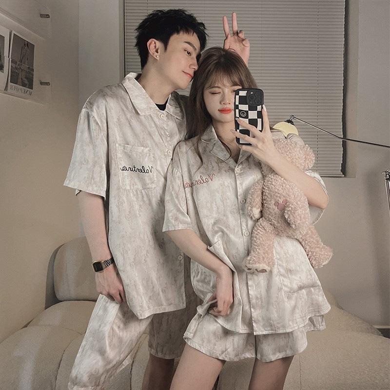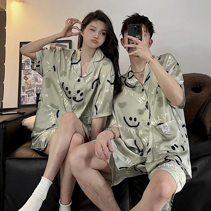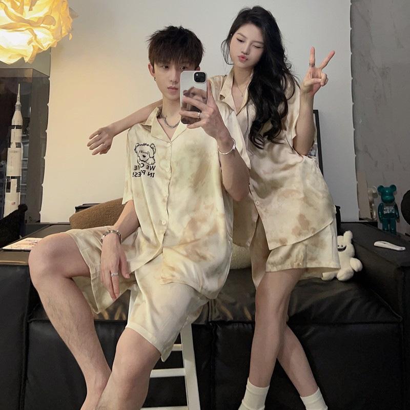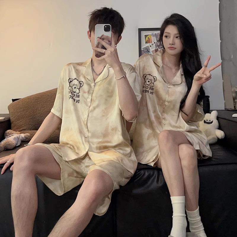 Pijama de verano para mujer, de manga corta y dos piezas, de seda artificial fina, para hombre