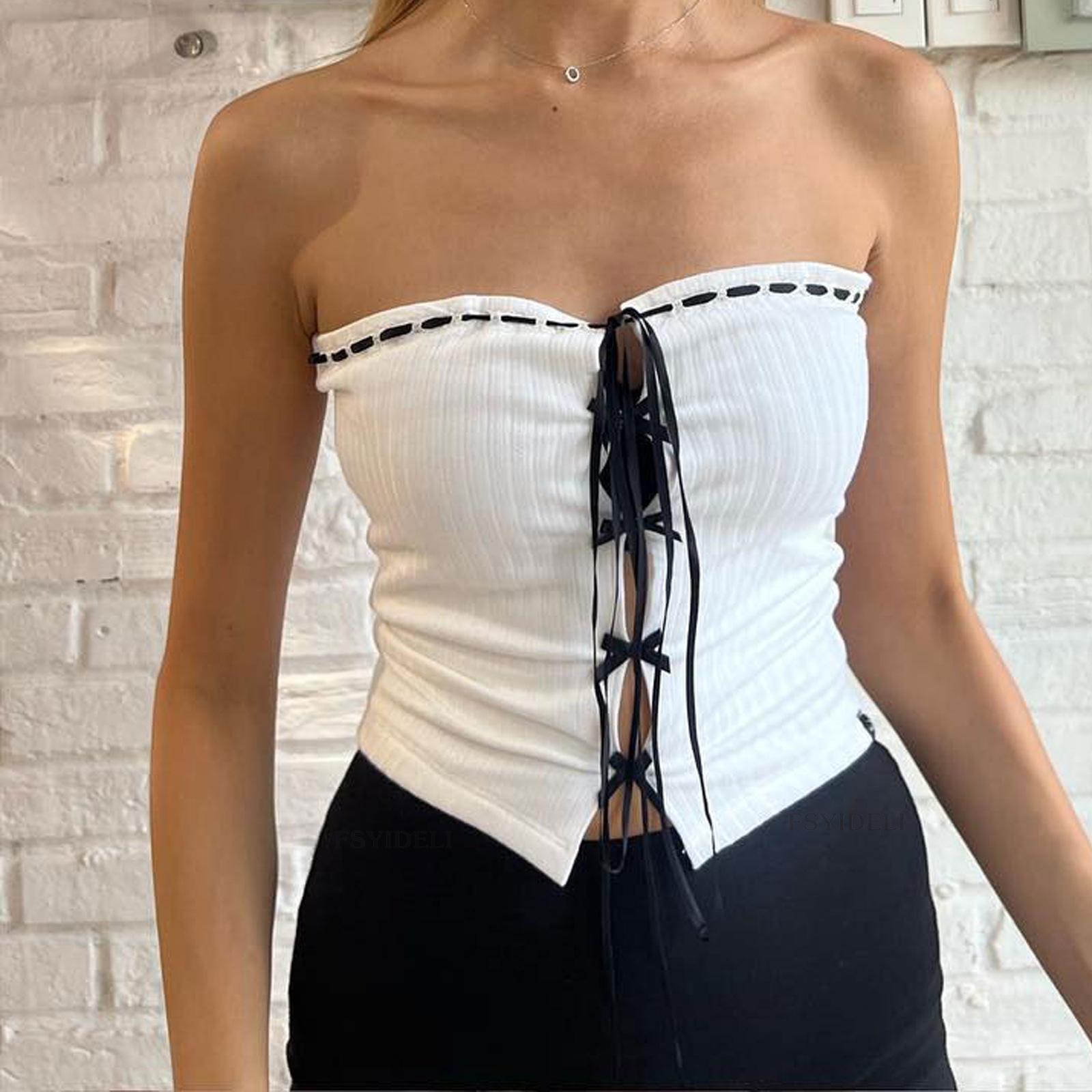 Verano Estilo Deseo Puro Color Contraste Strapless Cuello Colgante Hueco Chaleco Ajustado Corto Sexy Chica Caliente Top de Mujer