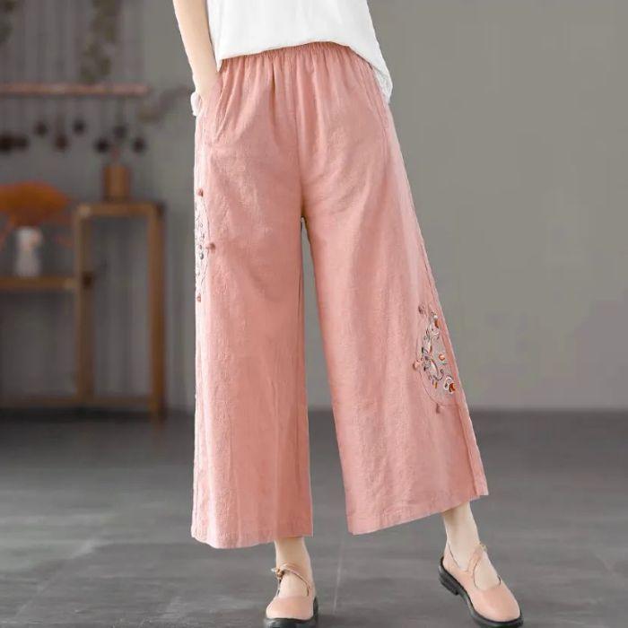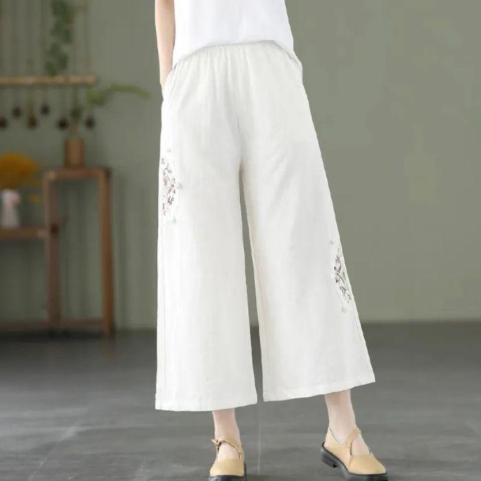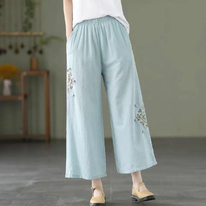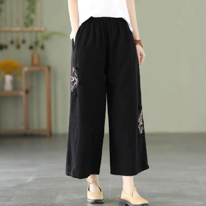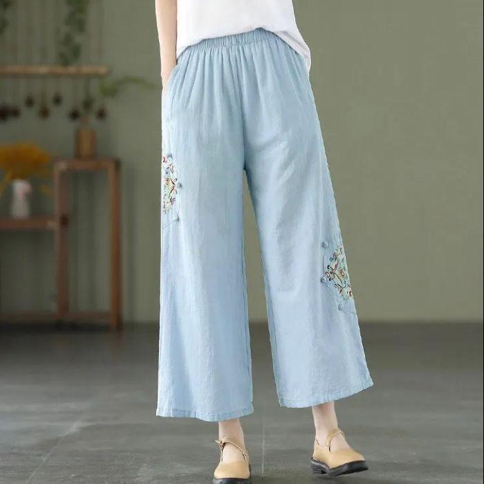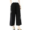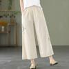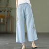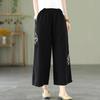 Pantalones de pierna ancha rectos sueltos delgados de color sólido con bordado étnico vintage de primavera y verano, cintura elástica, nuevos para mujer 2025