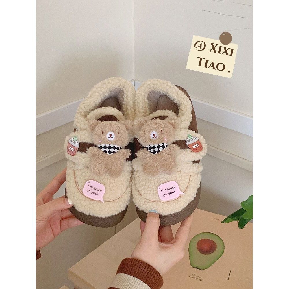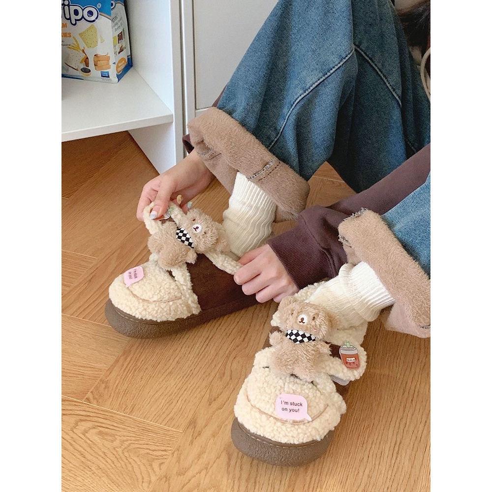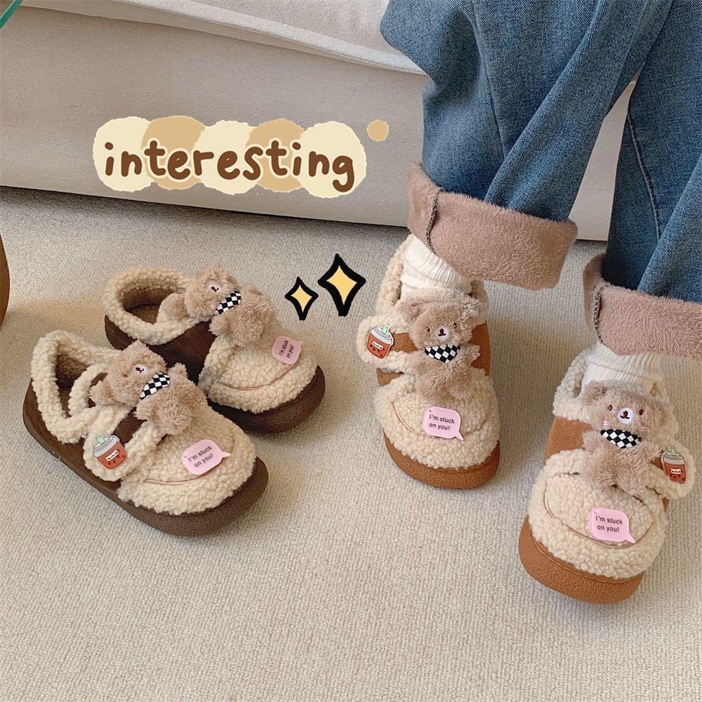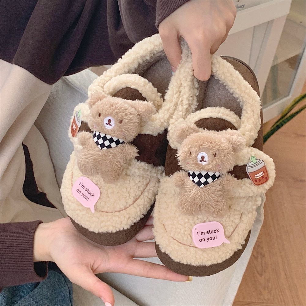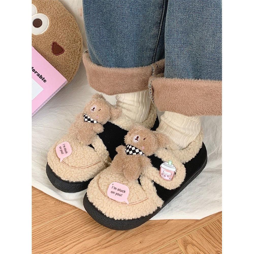 Pantuflas Cálidas de Algodón con Velcro Antideslizante para Exterior para Mujer Invierno 2024 Combinan con Todo Lindo Bufanda Oso Padre-hijo Zapatos de Guisante