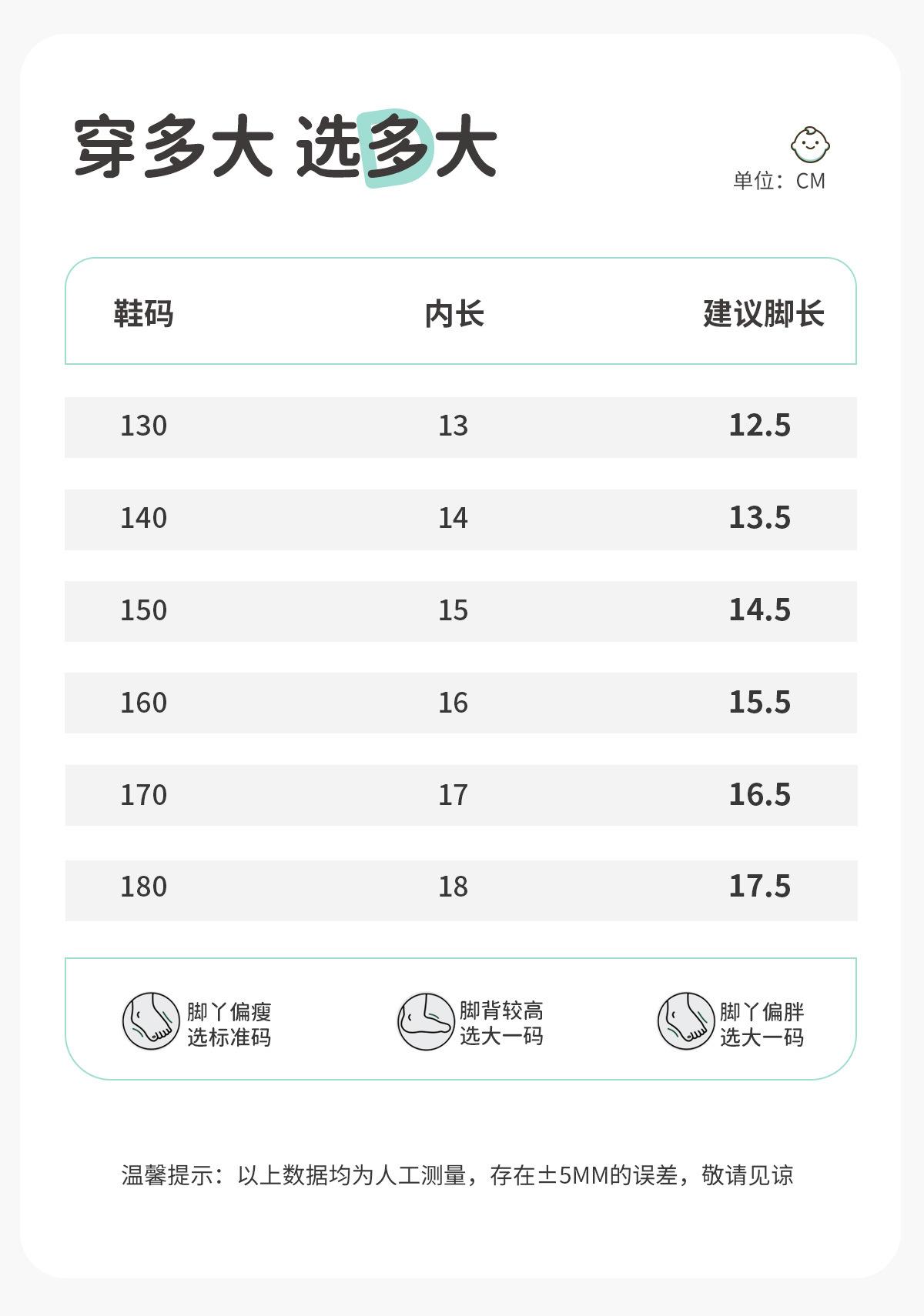 130 inner length 13 recommended foot length 12.5cm, 140 inner length 14 recommended foot length 13.5cm, 150 in...