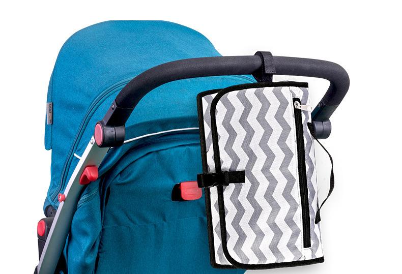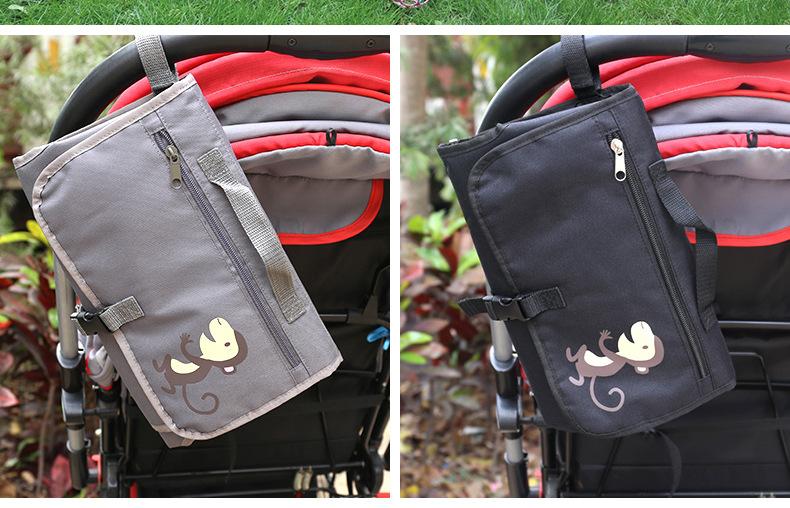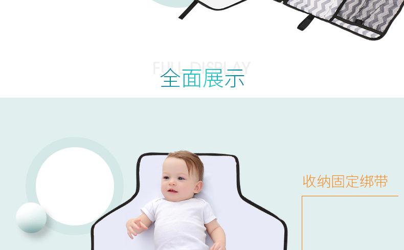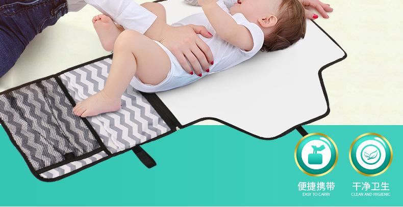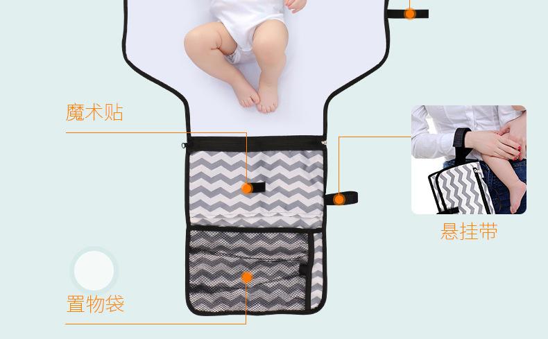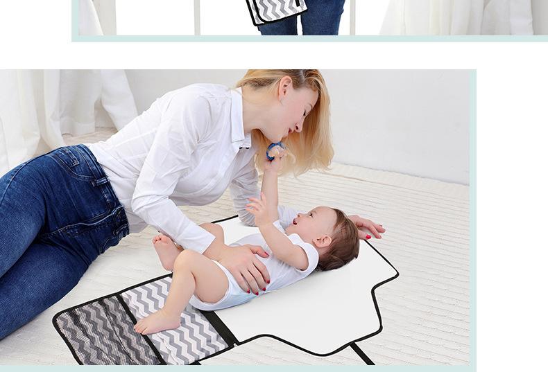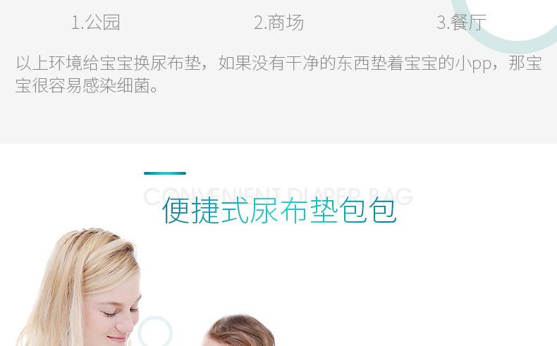Escenas:Diseño muy bonito y práctico. Cuando se despliega, resulta ser un cambiador portátil. Cuando sacas a tu bebé, puedes poner el cambiador sobre él y no tienes que preocuparte por cuestiones de higiene. El bolsillo de malla al lado puede guardar pañales, y también hay un espacio separado para toallitas húmedas. Cuando se pliega, se convierte en un pequeño bolso bonito y no ocupa mucho espacio en un bolso de mamá. También se puede colgar en el cochecito del bebé. Con este pequeño bolso, no tendrás prisa ya sea que estés usando un cambiador público en un centro comercial o que el pañal de tu bebé necesite ser cambiado repentinamente en un avión.