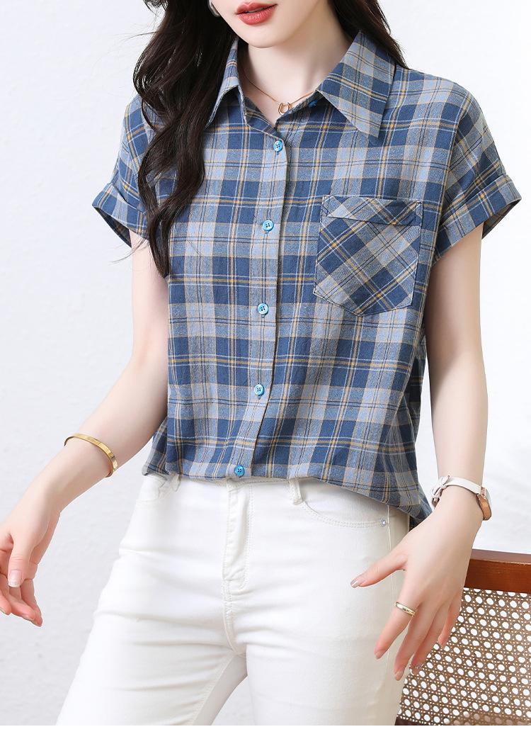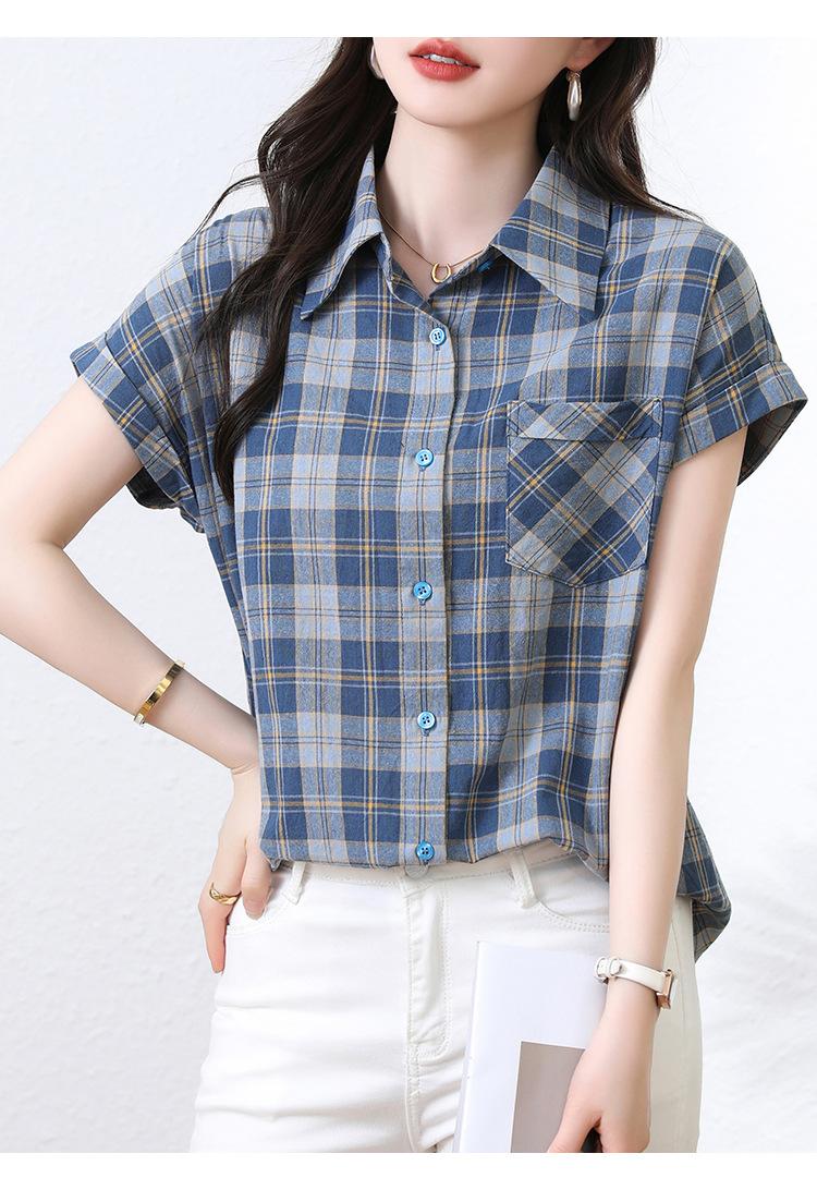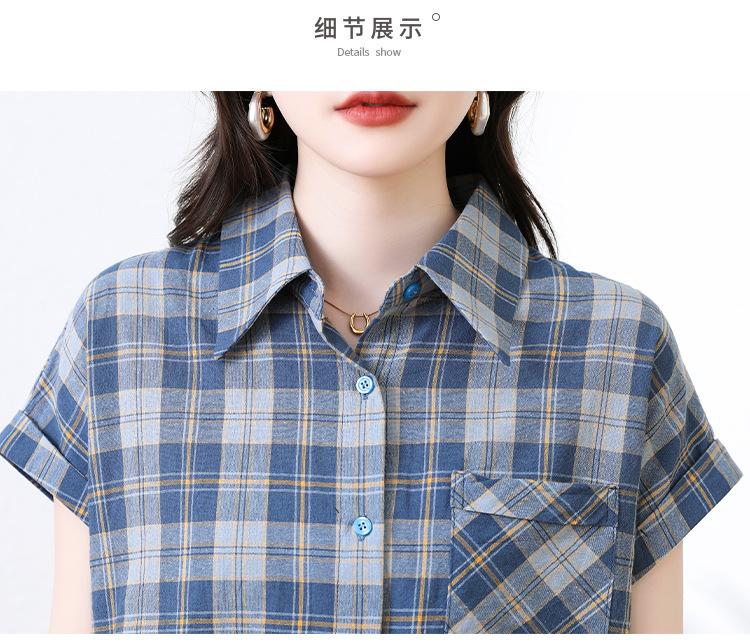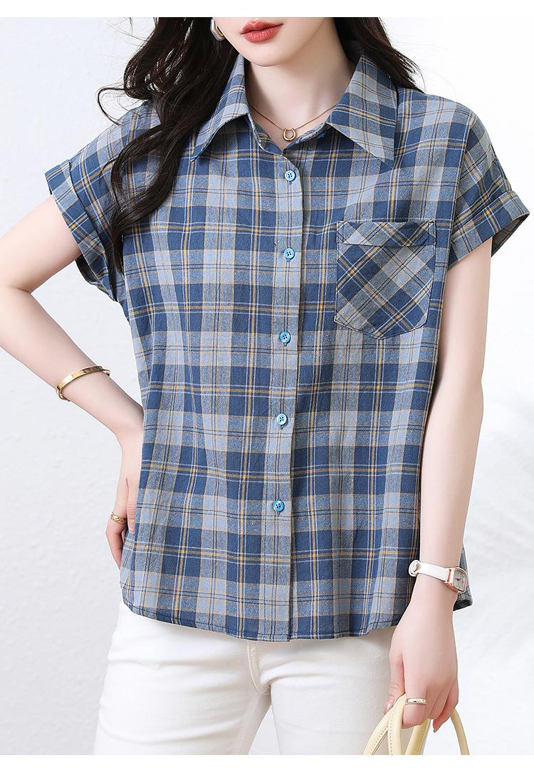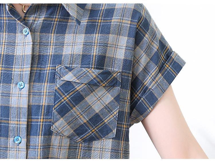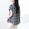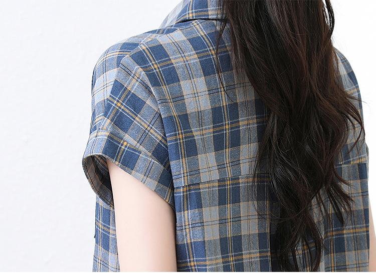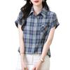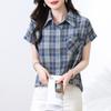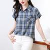Camisa de cuadros azules de tiro real para mujer de manga corta 2025 verano nueva mujer talla grande camisa holgada top