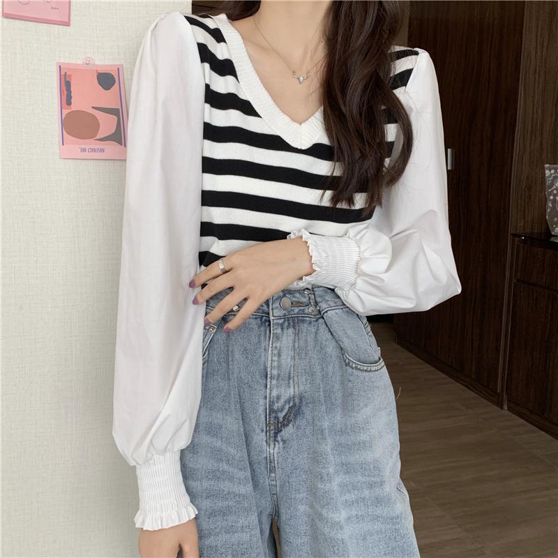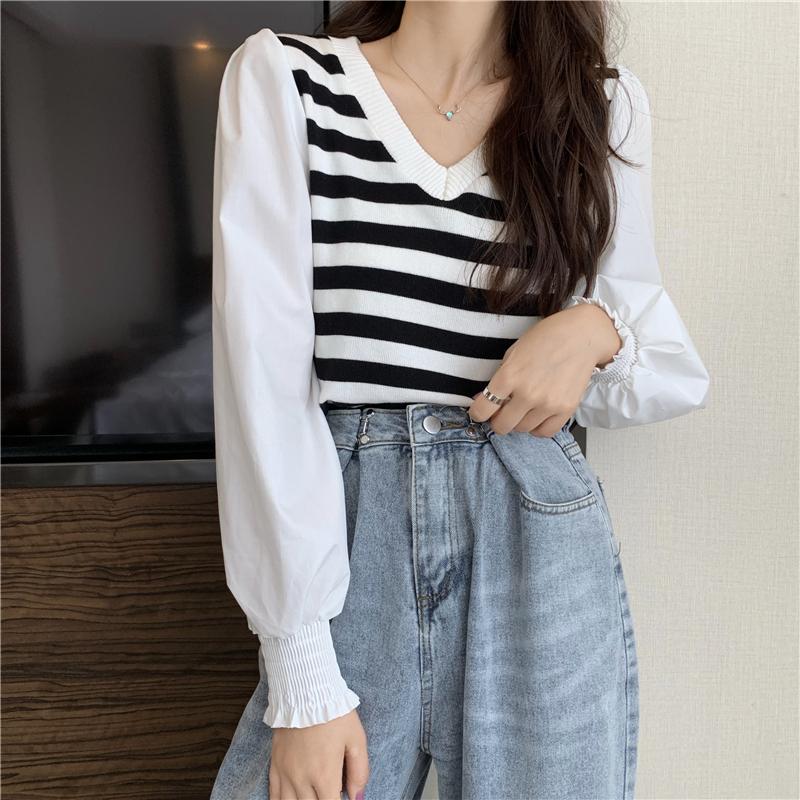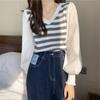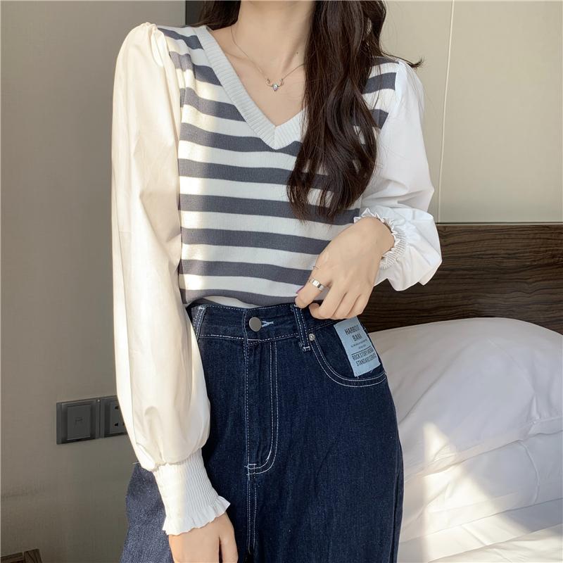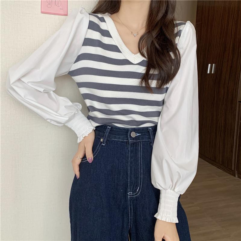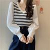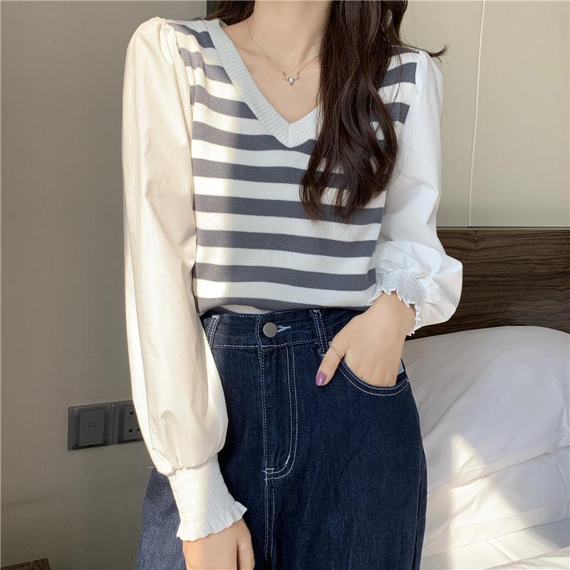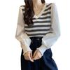 Camisa a Rayas para Mujer Nueva Otoño Francesa Nicho Retro Cuello Pico Clavícula Corazón en la Ropa