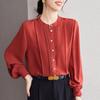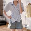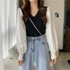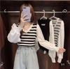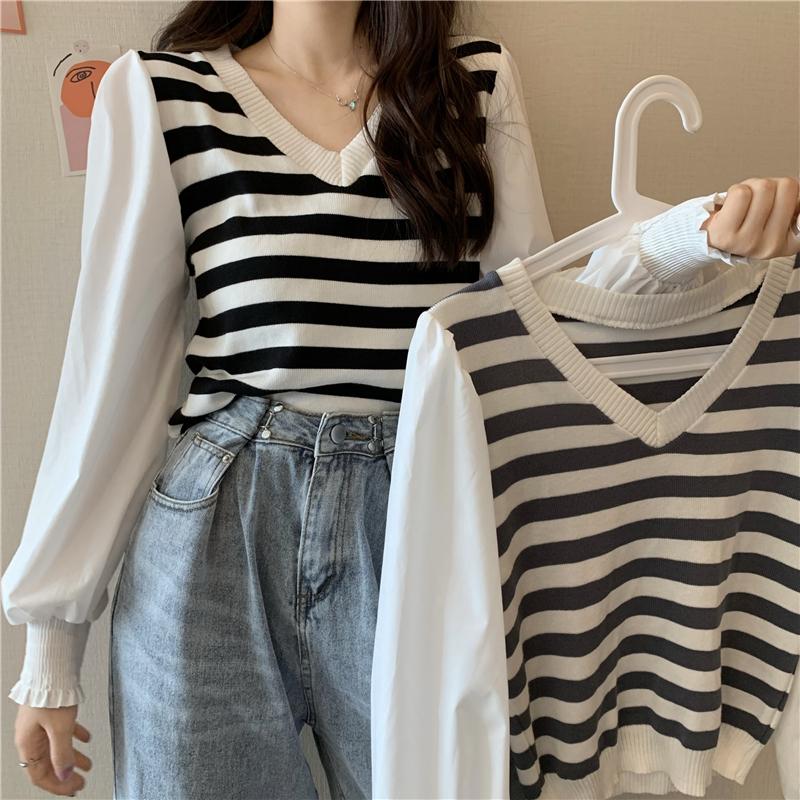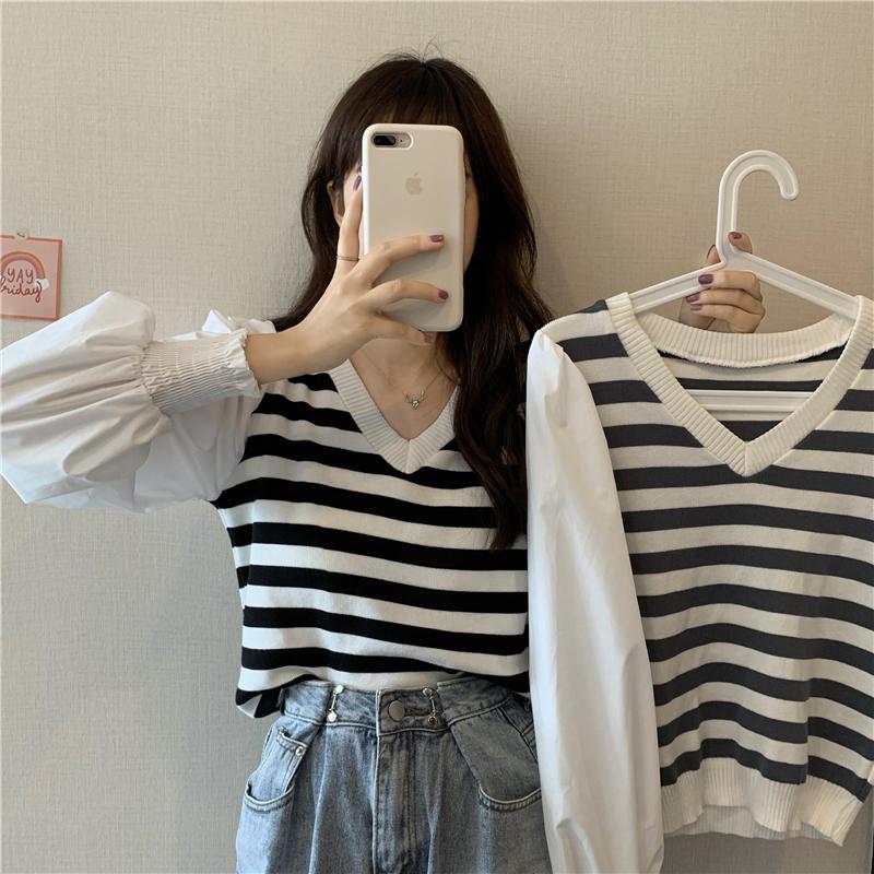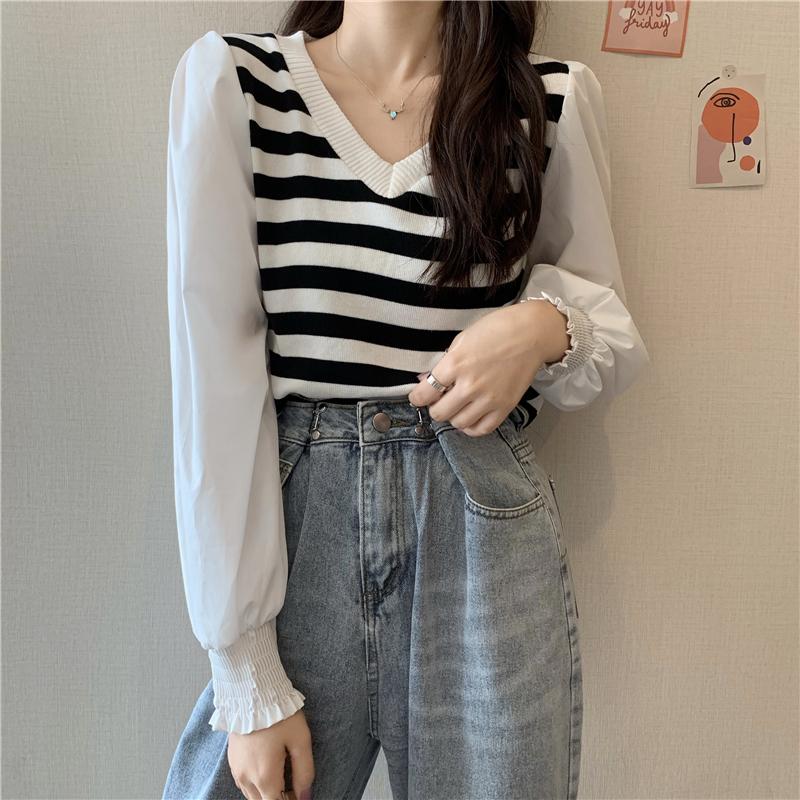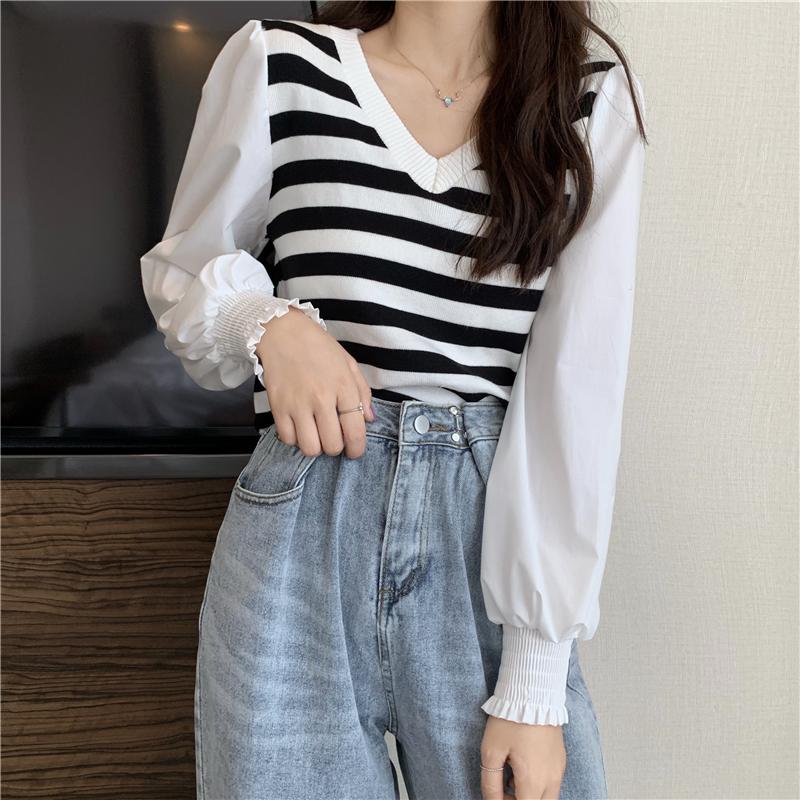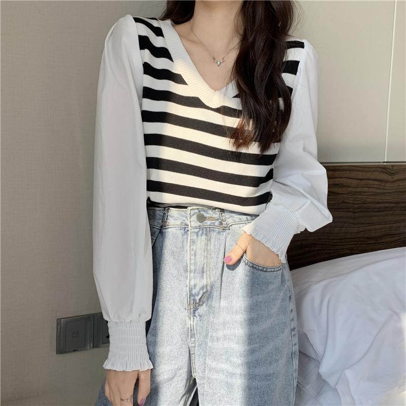 Camisa a Rayas para Mujer Nueva Otoño Francesa Nicho Retro Cuello Pico Clavícula Corazón en la Ropa