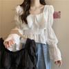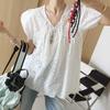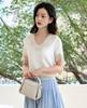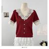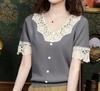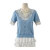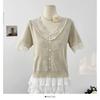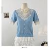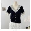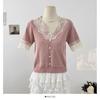 2025 Nuevo Estilo de Verano Estilo Dulce y Suave Cuello en V Encaje Empalmado Manga Corta Tejido de Punto Tops para Mujer Chic