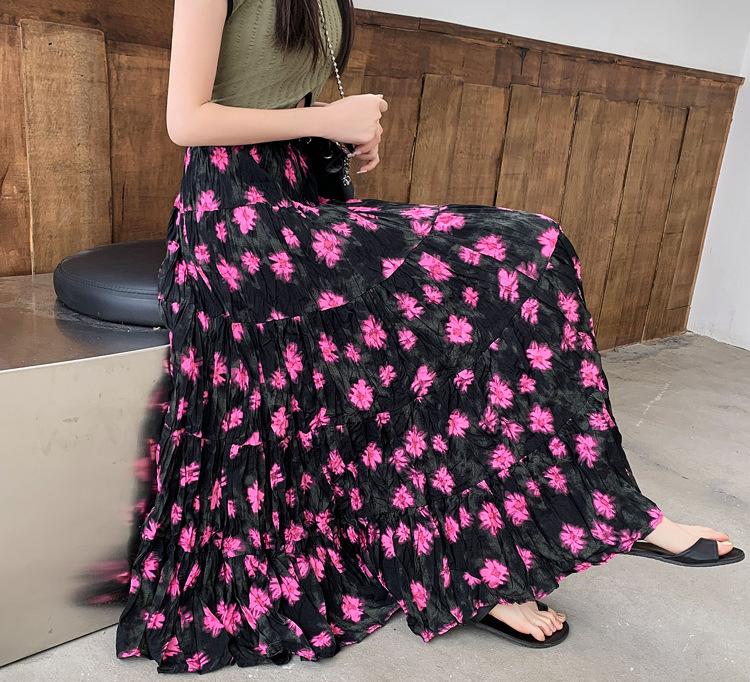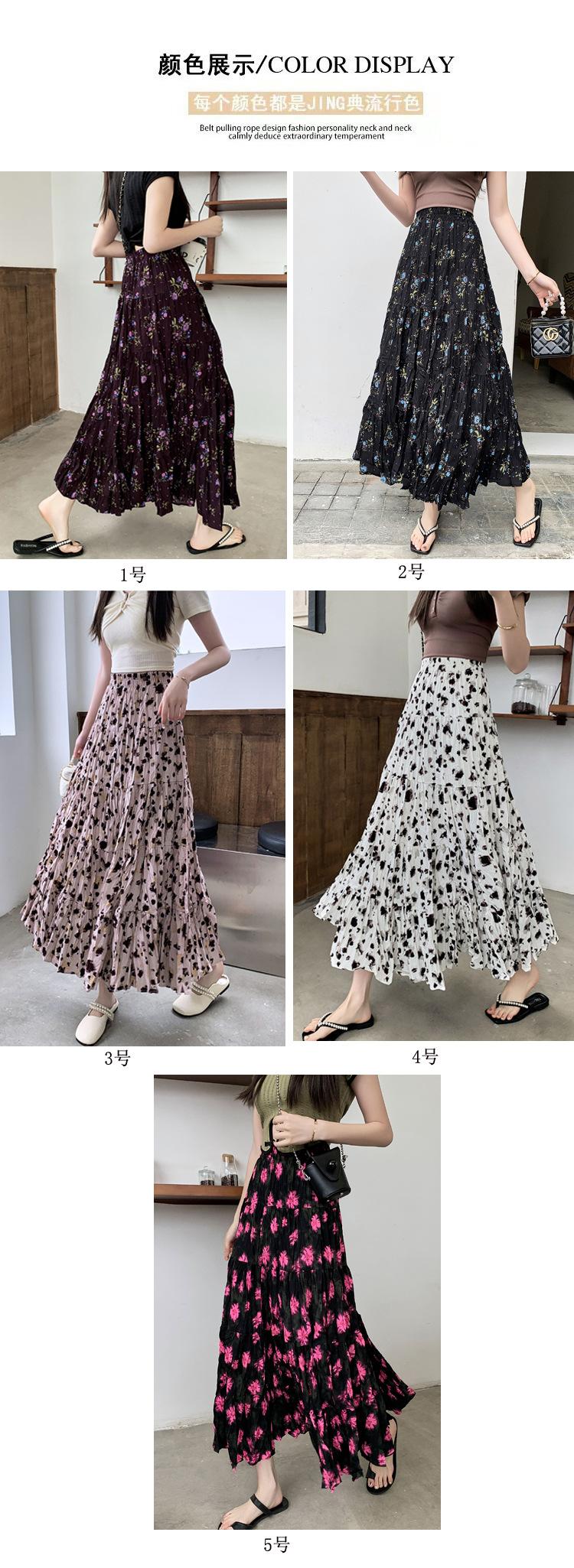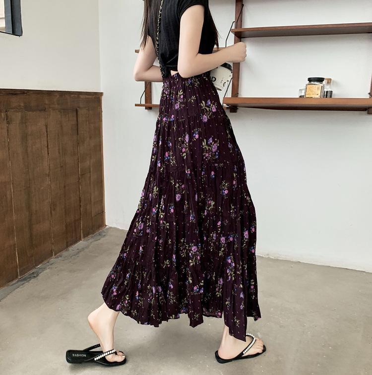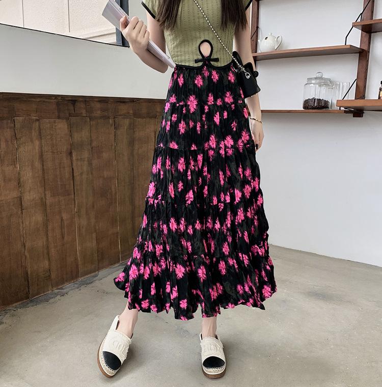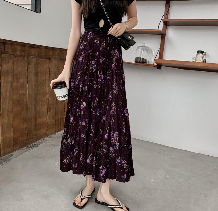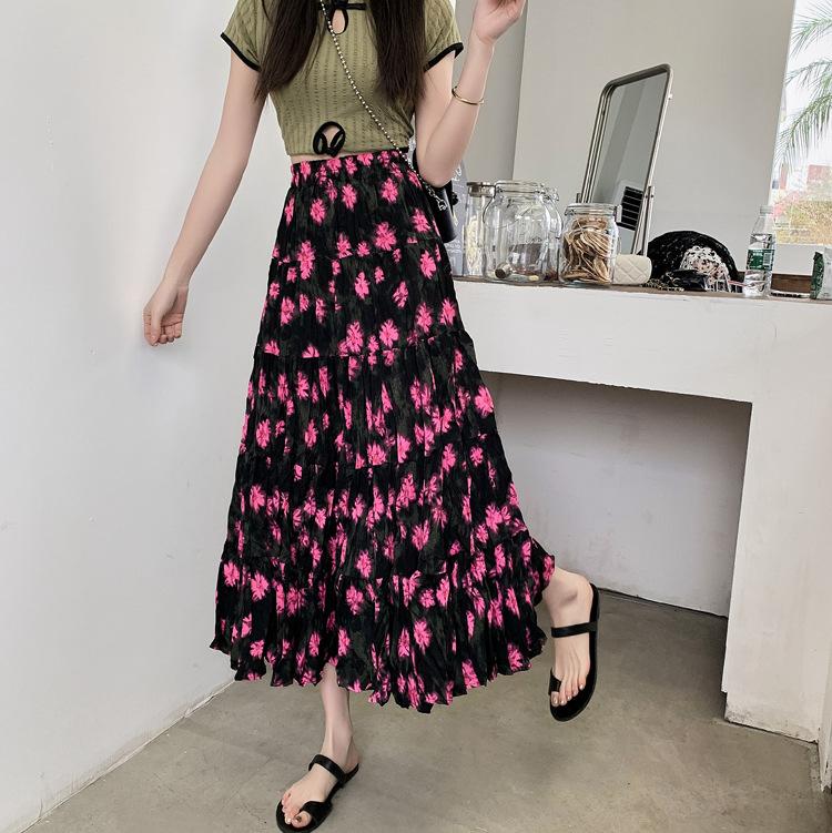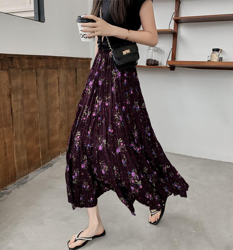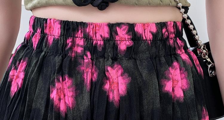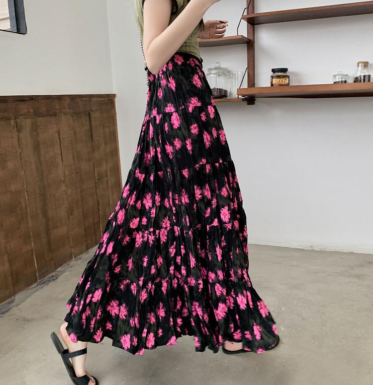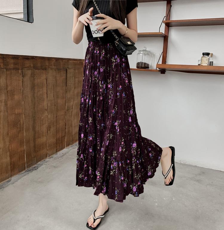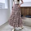 Falda midi plisada estilo francés retro con costuras florales de gran vuelo en chifón estampado plisado de cintura alta falda larga 2024